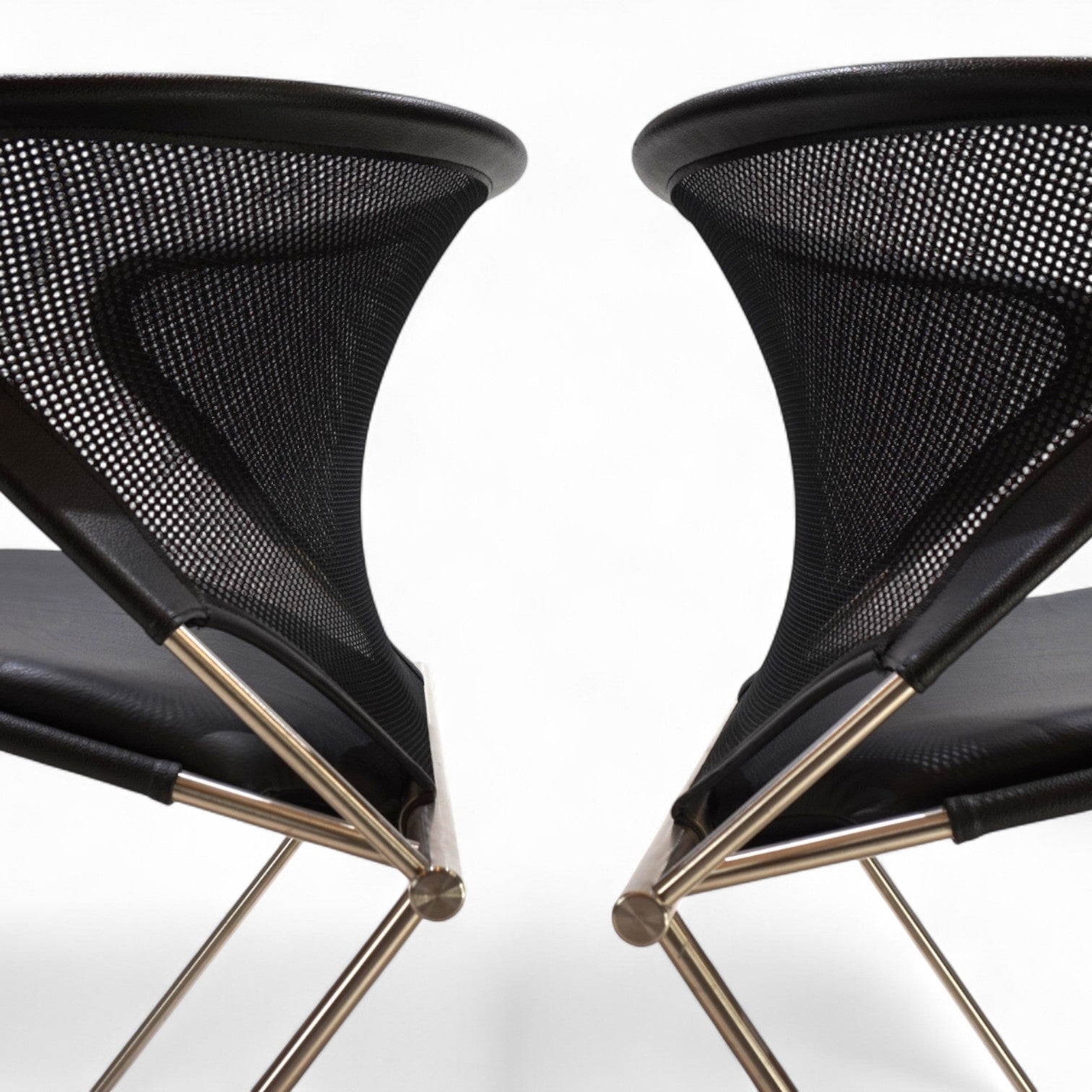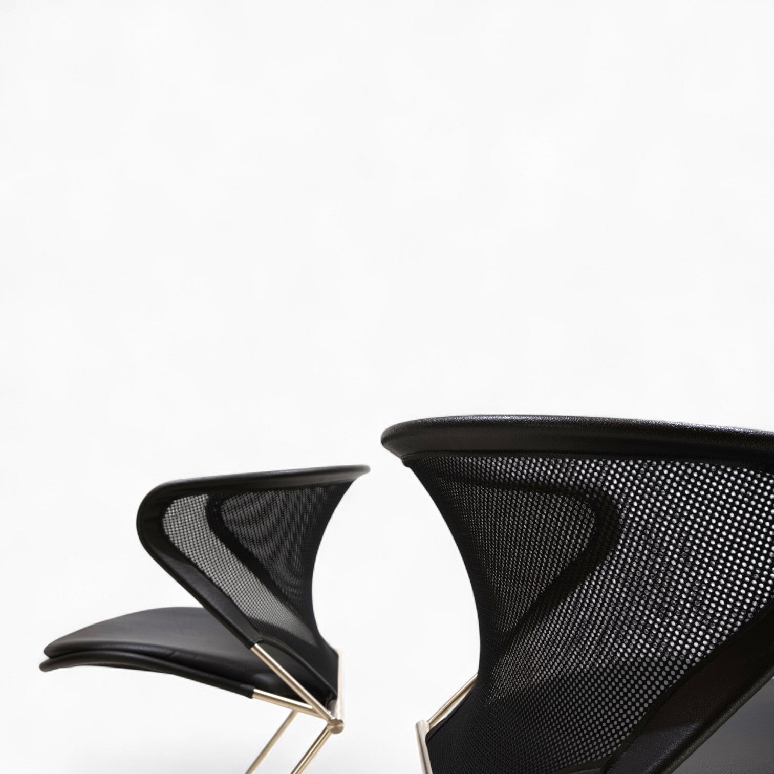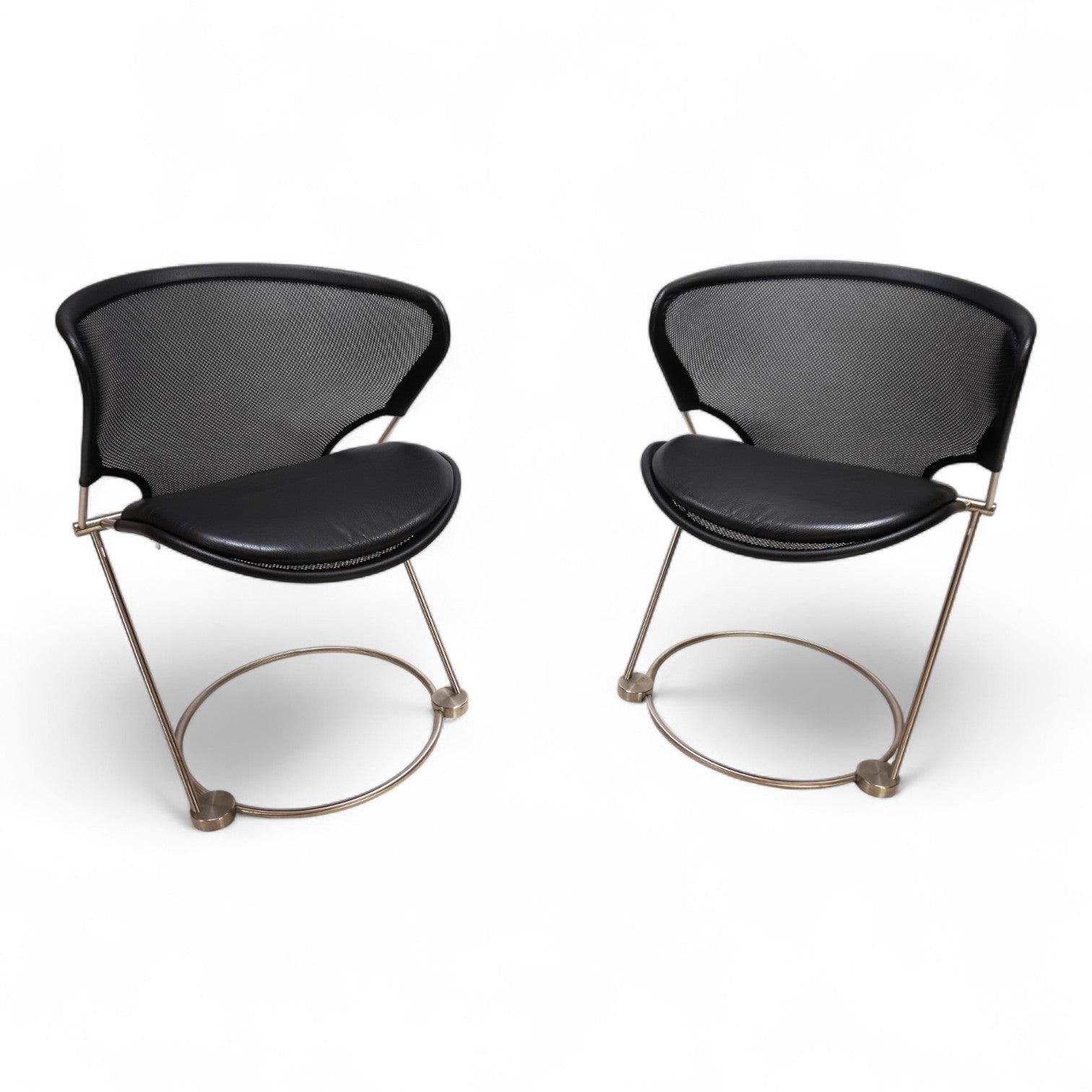 Die beiden Nuvola Stühle kommen in einem exzellenten, neuwertigen Zustand. Das massive Edelstahlgestell harmoniert perfekt mit dem straff gespannten schwarzen Polyesternetz der Sitzflächen und Rückenlehnen. Das Netz wurde an den Ecken mit schwarzen Lederriemen eingefasst. Dieses Modell verfügt außerdem über die passenden Lederauflagen auf der Sitzfläche welche bei Bedarf entfernt werden können. Auch diese in einem perfekten Zustand. Die Linienführung und der Materialmix der Stühle sorgen für ein hervorragendes Sitzgefühl. Diese Stühle sind mehr ein Kunstwerk als ein reines Sitzmöbel. Ein Statement in jedem Raum.