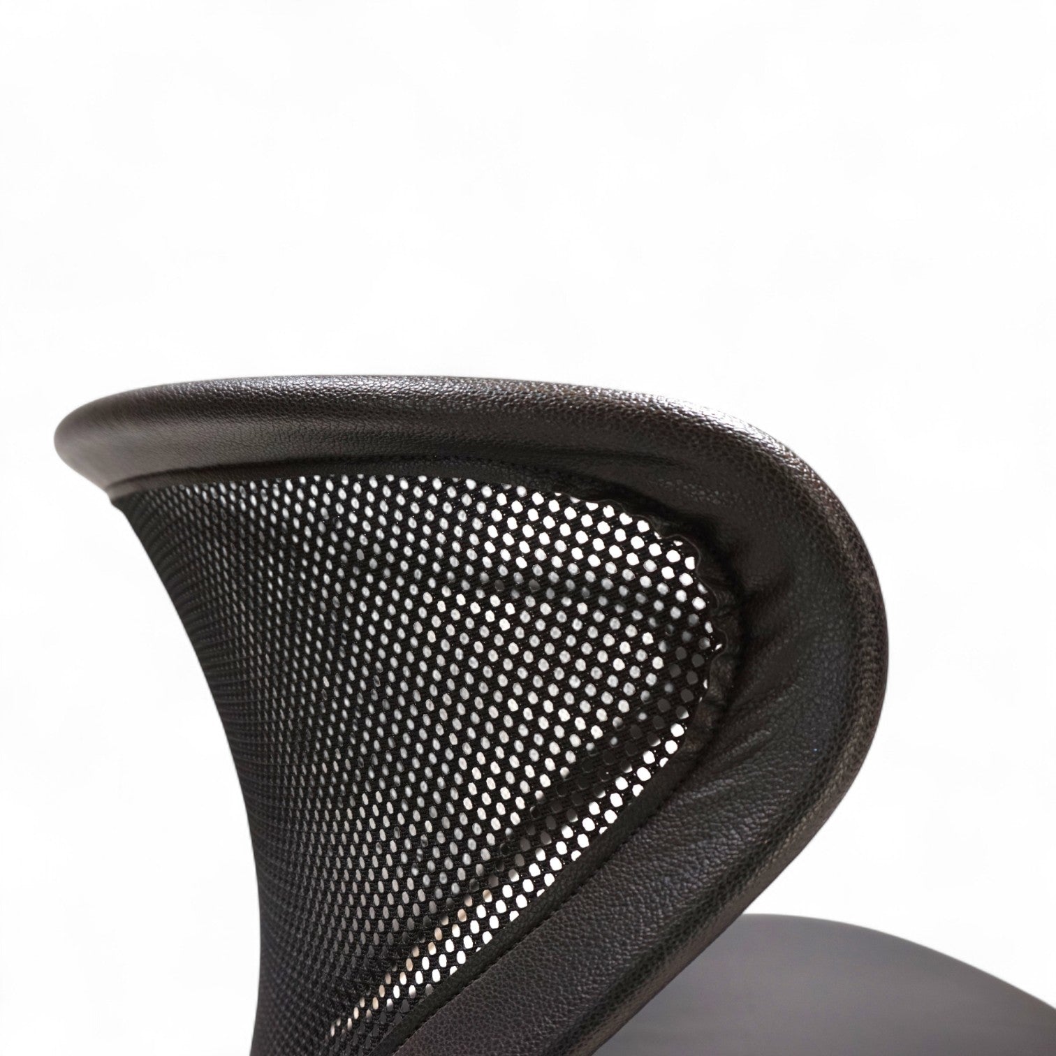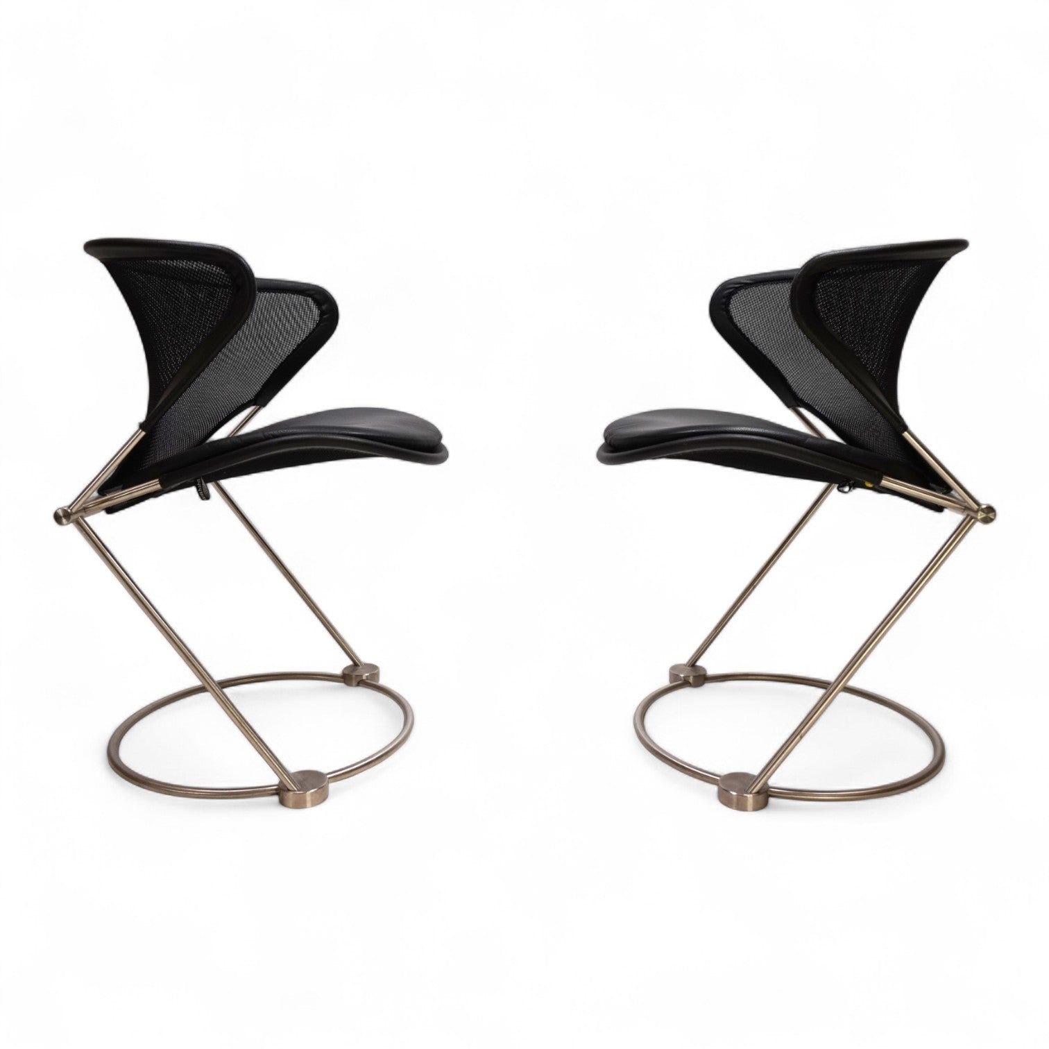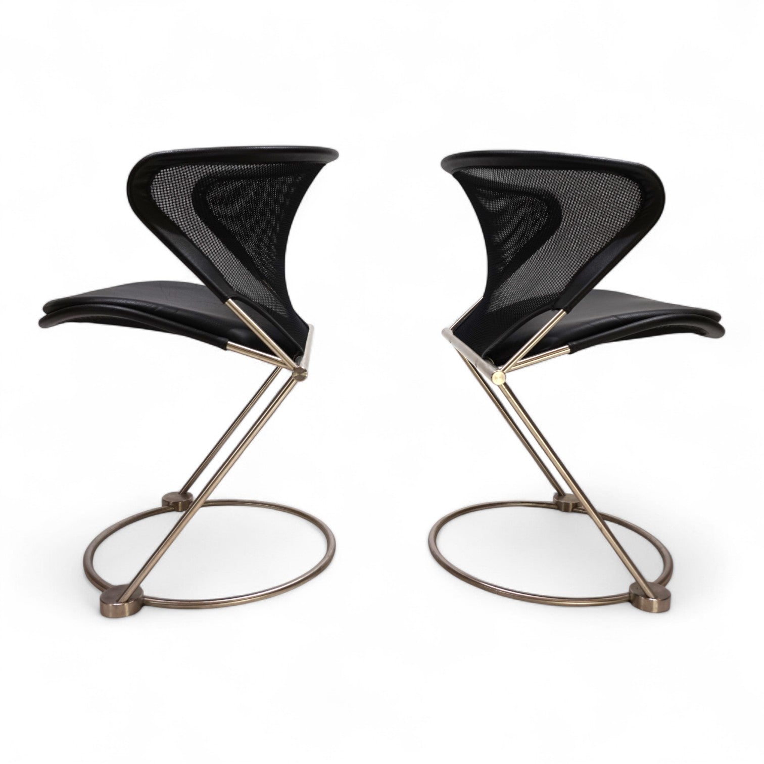 Die beiden Nuvola Stühle kommen in einem exzellenten, neuwertigen Zustand. Das massive Edelstahlgestell harmoniert perfekt mit dem straff gespannten schwarzen Polyesternetz der Sitzflächen und Rückenlehnen. Das Netz wurde an den Ecken mit schwarzen Lederriemen eingefasst. Dieses Modell verfügt außerdem über die passenden Lederauflagen auf der Sitzfläche welche bei Bedarf entfernt werden können. Auch diese in einem perfekten Zustand. Die Linienführung und der Materialmix der Stühle sorgen für ein hervorragendes Sitzgefühl. Diese Stühle sind mehr ein Kunstwerk als ein reines Sitzmöbel. Ein Statement in jedem Raum.