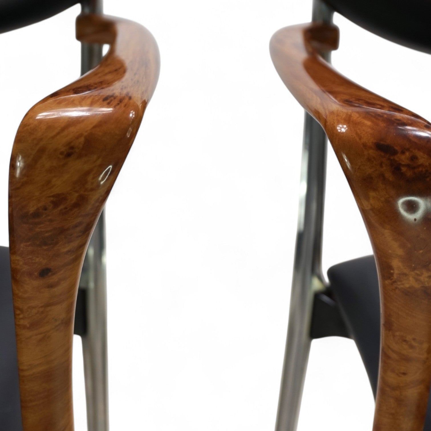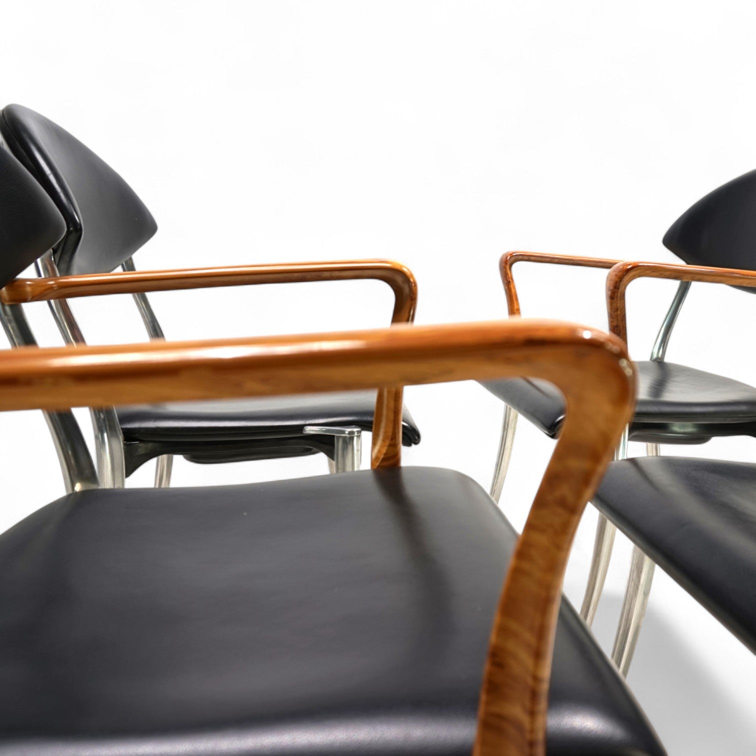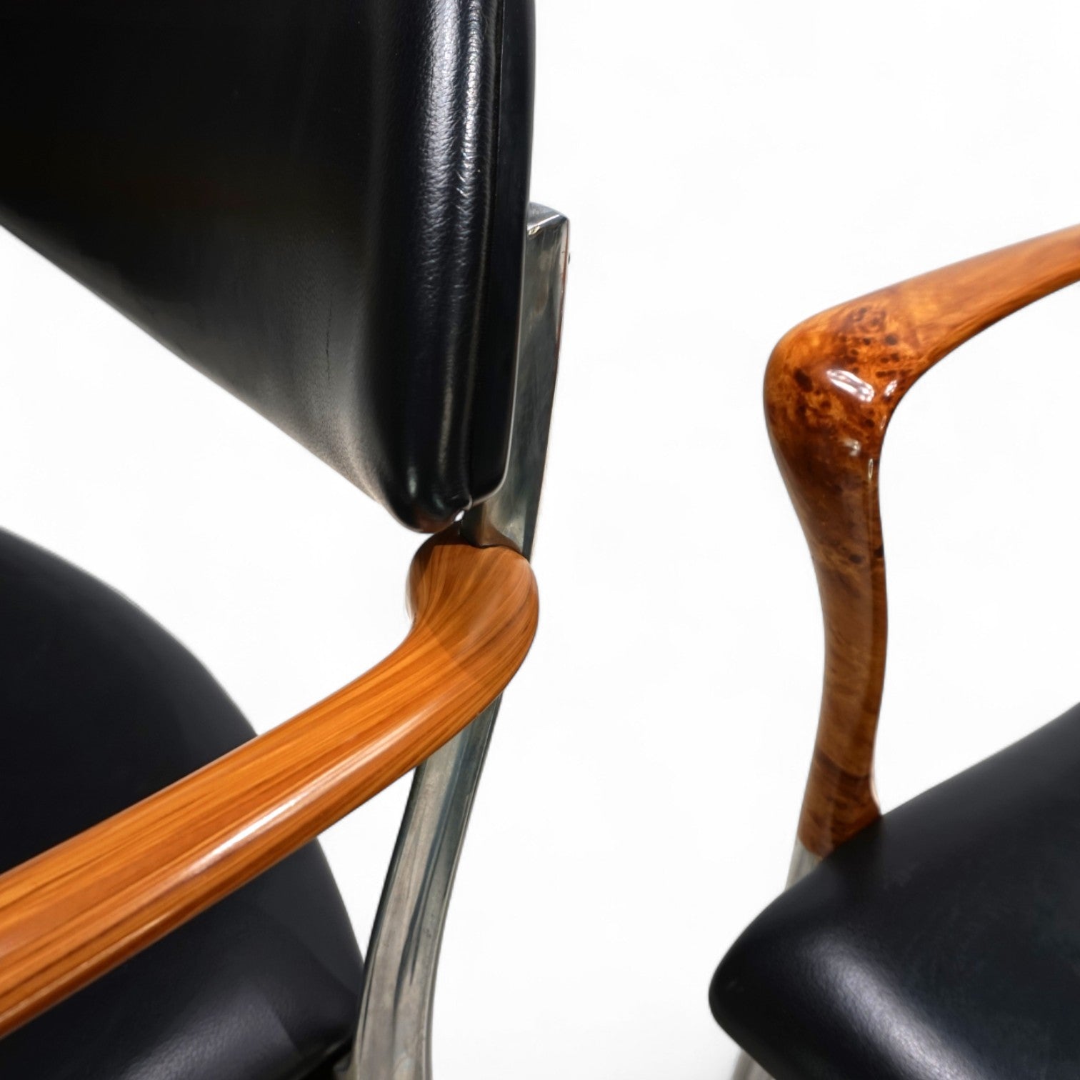 Dieses Set aus 2 Coro Stühlen mit Armlehnen und  2 Stühlen ohne Armlehnen kommt in einem sehr guten Zustand. Die Armlehnen der beiden Stühle sind aus Kunststoff in einer sehr attraktiven Wurzelholzoptik gefertigt und zeigen keinerlei Gebrauchsspuren. Die schwarzen Kunststoffbezüge der Stühle sind ebenso wie die Rückenschalen einwandfrei. Die elegant geschwungene Füße aus Aluminium zeigen eine leichte Patina.  Die Stühle bestechen sowohl in der Ausführung mit Armlehnen als auch ohne durch eine beschwingte Eleganz.