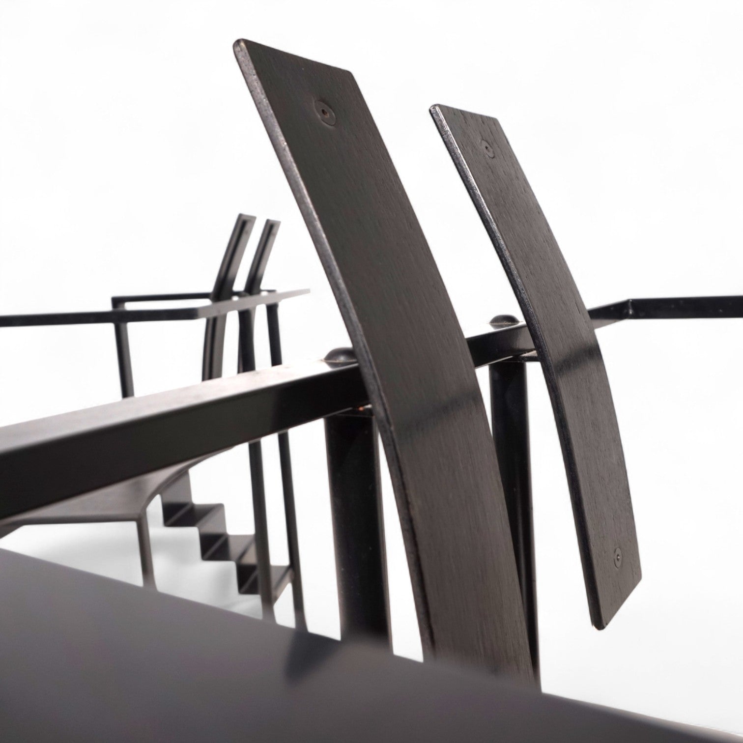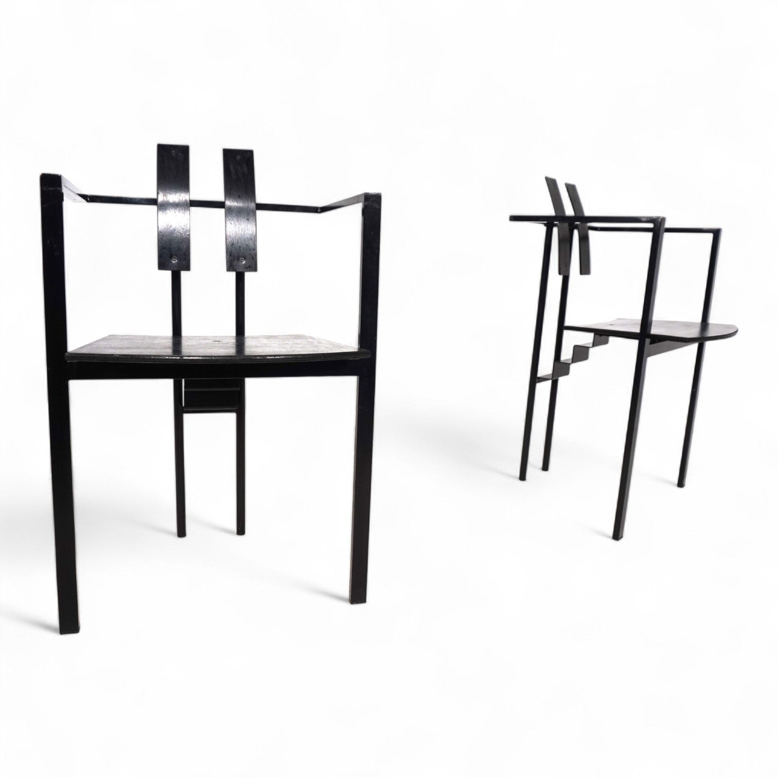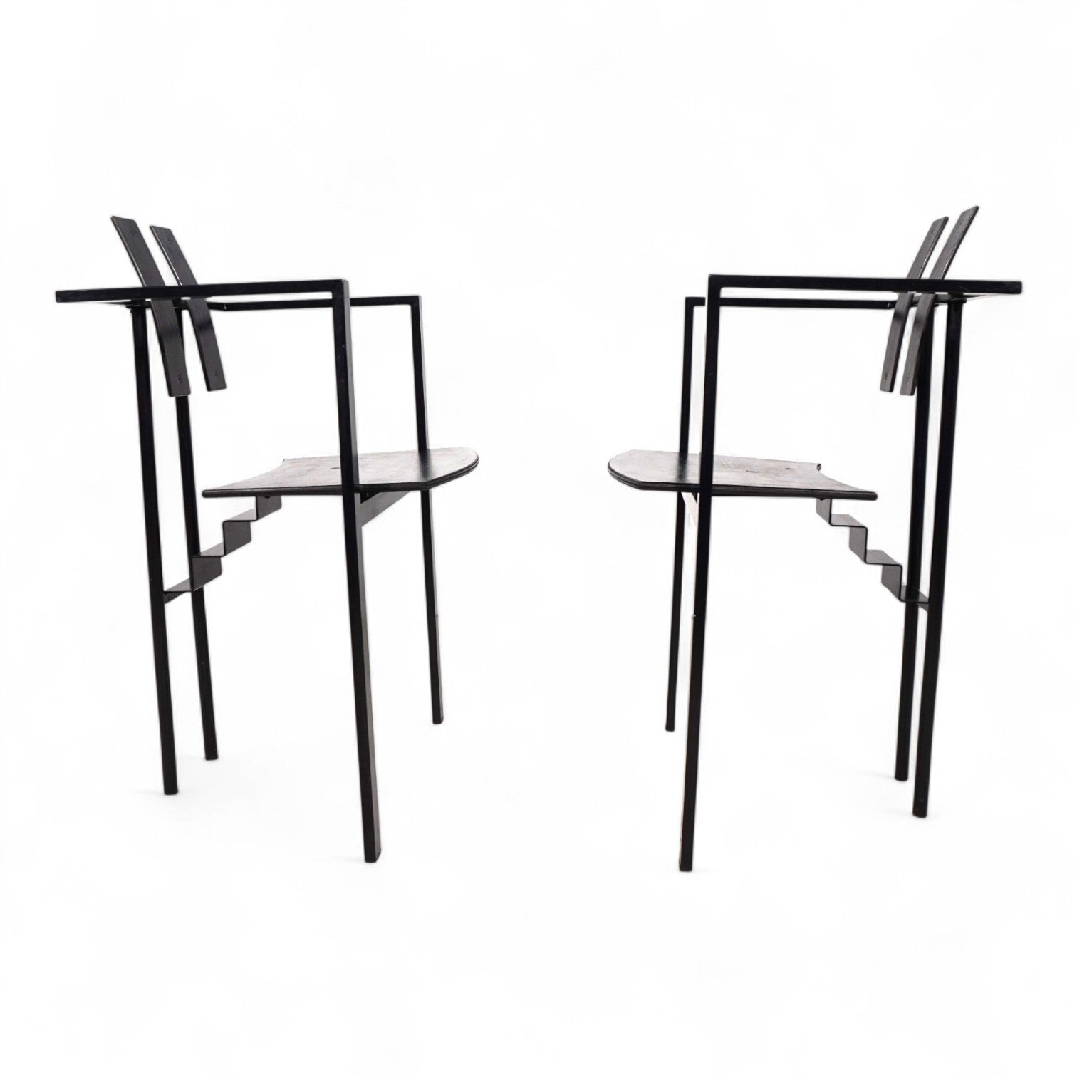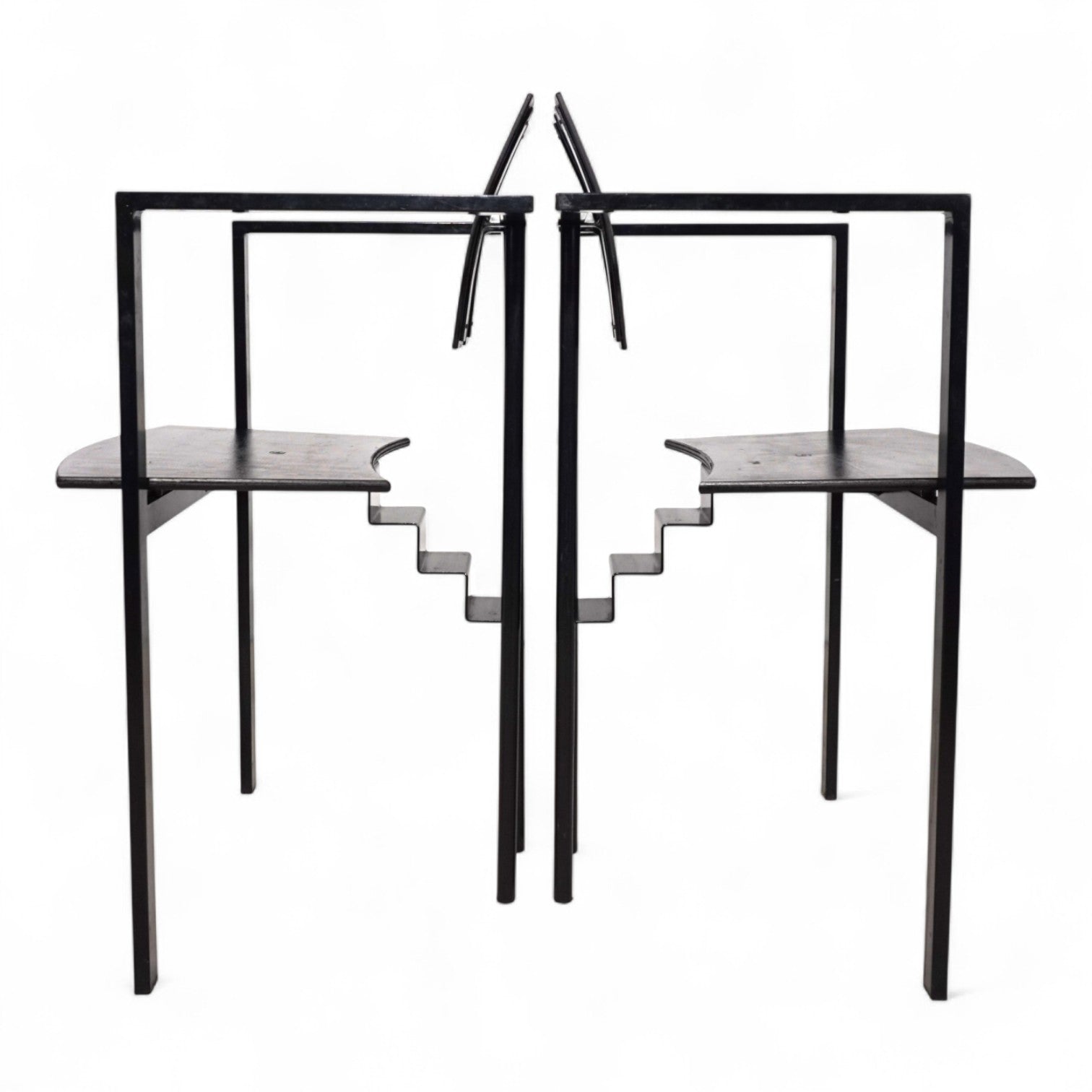 Das Trix Set im Memphis Stil kommt mit einem schwarzen Metallgestell und schwarzer Sitzfläche und Rückenlehne in Schichtholz. Der Rahmen befindet sich in einem guten Zustand mit leichten Gebrauchsspuren, die Holzflächen zeigen eine minimale, attraktive Patina. Der Sitz liegt auf dem Gestell auf und wurde nur mit einer Schraube fixiert. Das Gestell zeigt mit dem treppenförmigen Verbindungsstück eines der typischen Merkmale des Memphis Stils der 80er Jahre. Das Gestell wirkt in seinen Linien extrem leicht und zeitlos.