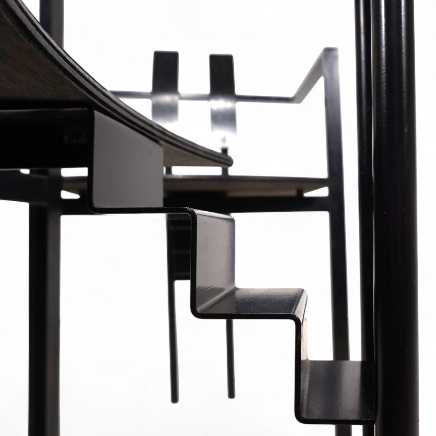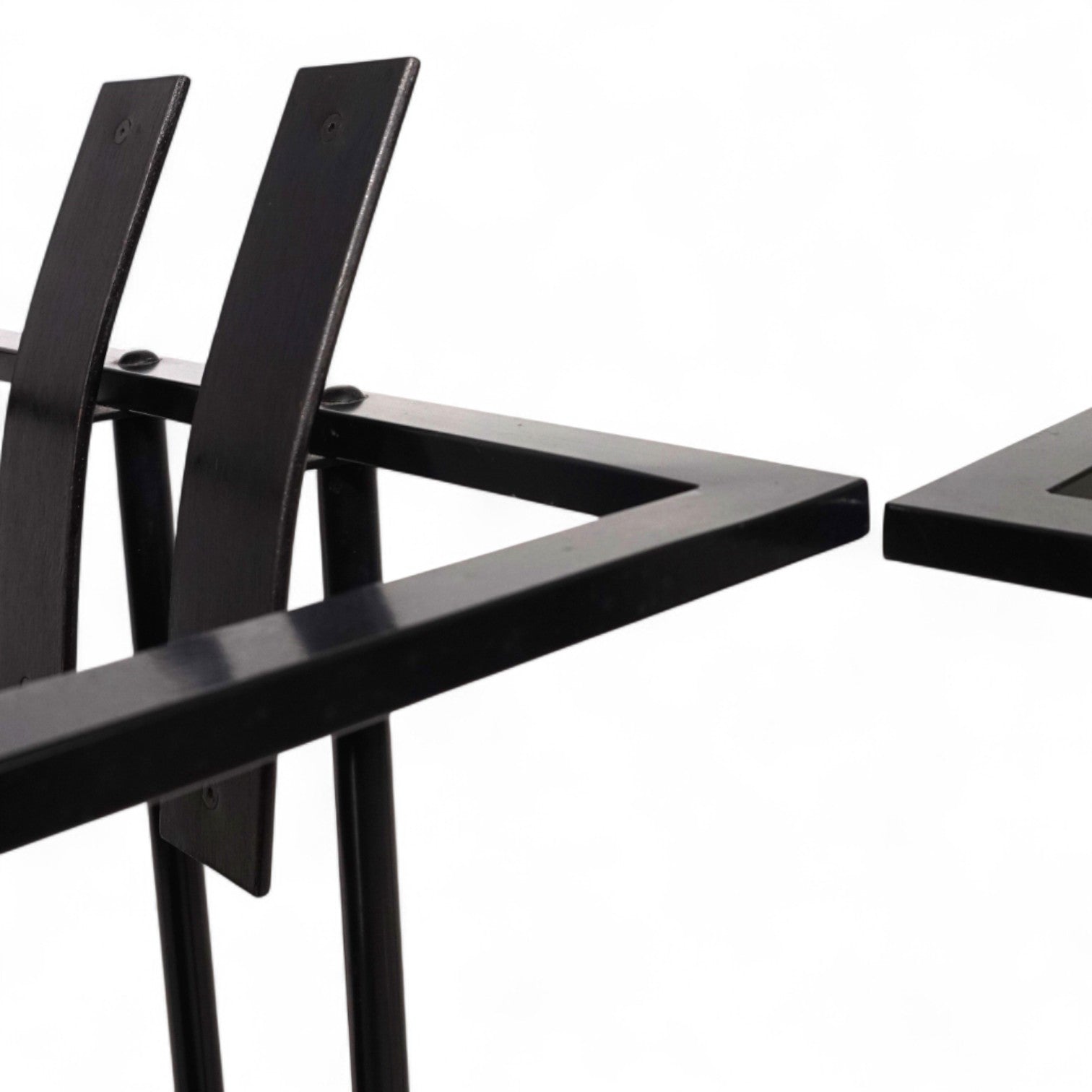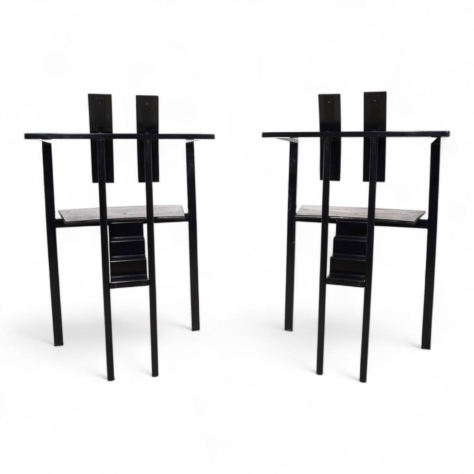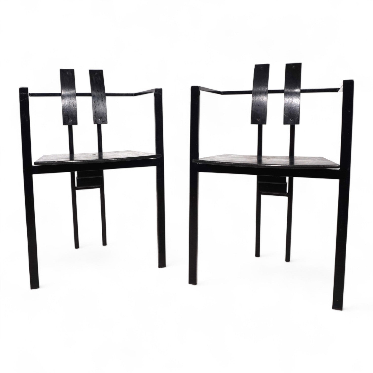 Das Trix Set im Memphis Stil kommt mit einem schwarzen Metallgestell und schwarzer Sitzfläche und Rückenlehne in Schichtholz. Der Rahmen befindet sich in einem guten Zustand mit leichten Gebrauchsspuren, die Holzflächen zeigen eine minimale, attraktive Patina. Der Sitz liegt auf dem Gestell auf und wurde nur mit einer Schraube fixiert. Das Gestell zeigt mit dem treppenförmigen Verbindungsstück eines der typischen Merkmale des Memphis Stils der 80er Jahre. Das Gestell wirkt in seinen Linien extrem leicht und zeitlos.