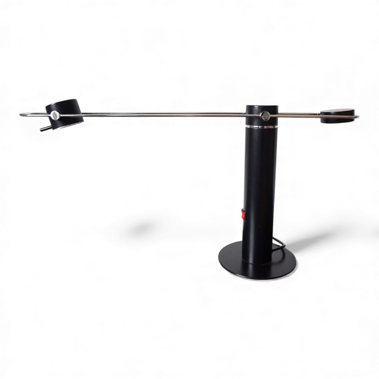 Diese massive Tischleuchte kommt in der selten zu findenden Chromausführung. Das schwere Chromgestell befindet sich in einem fast neuwertigen Zustand. Die schwarze, an Hammerschlaglack erinnernde Basis zeigt keine Gebrauchsspuren oder Risse. Die Elektrik funktioniert einwandfrei. Die Leuchte aus den 70er Jahren gibt ein sehr schönes, warmes Licht.