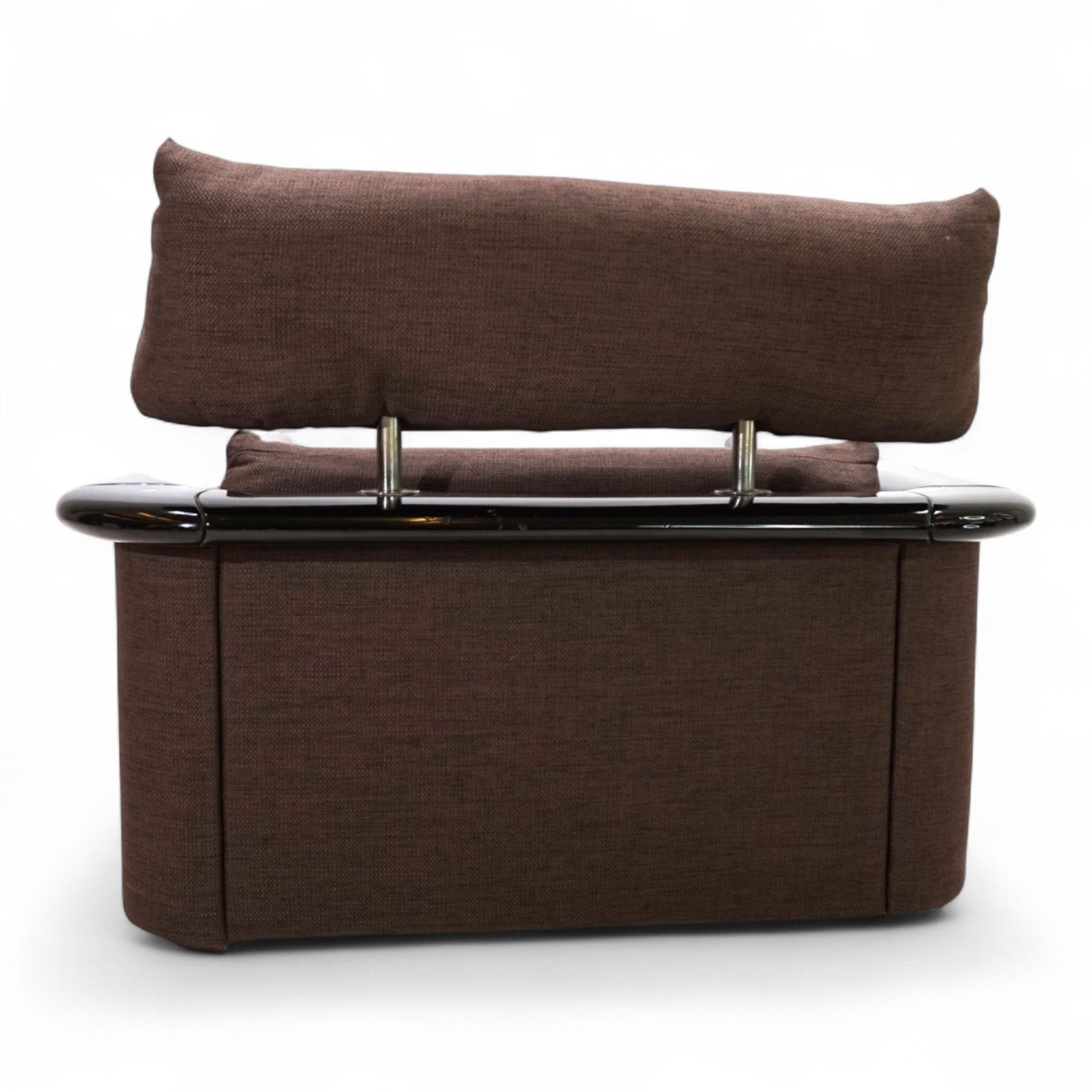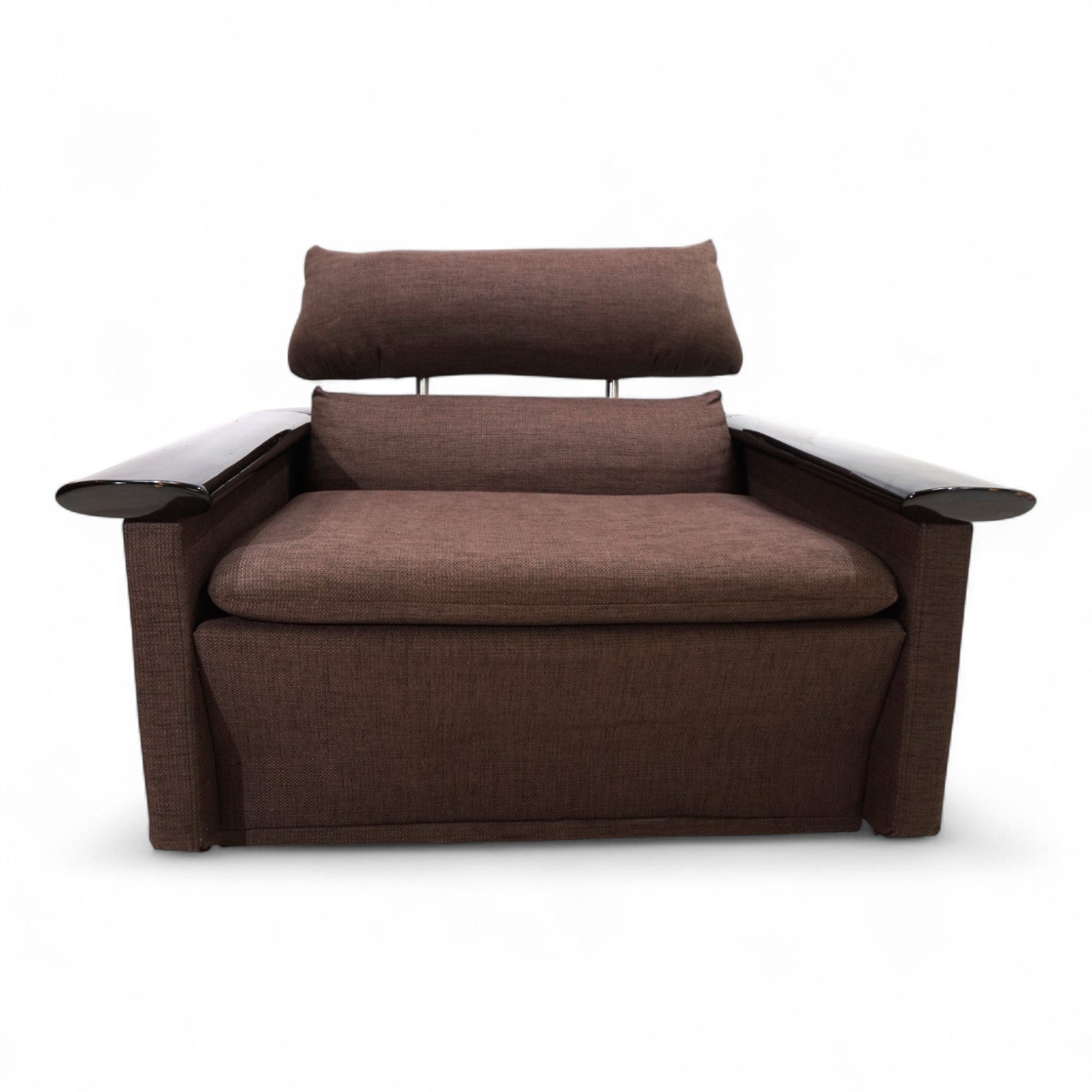 Absolut außergewöhnlicher Loungesessel der italienischen Manufaktur Tecno, welcher für die Präsidentensuite eines exklusiven Hotels hergestellt wurde. Der Sessel kommt in einem festeren braunen Stoffbezug, welcher für die Kissen und die Wände des Sessels Verwendung findet. Der Stoff weist minimale Gebrauchsspuren auf. Die Armlehnen sind in einer breiten Holzumrandung des Sessels eingebettet, welche mit schwarzem Klavierlack beschichtet sind. Der Lack zeigt Gebrauchsspuren wie Kratzer und kleine Dellen. Die Kopfstütze des Sessels mit massiven Edelstahlstäben ist höhenverstellbar. Der Sessel ist auf innenliegenden Rollen gelagert und kann trotz seines Gewichts leicht bewegt werden.