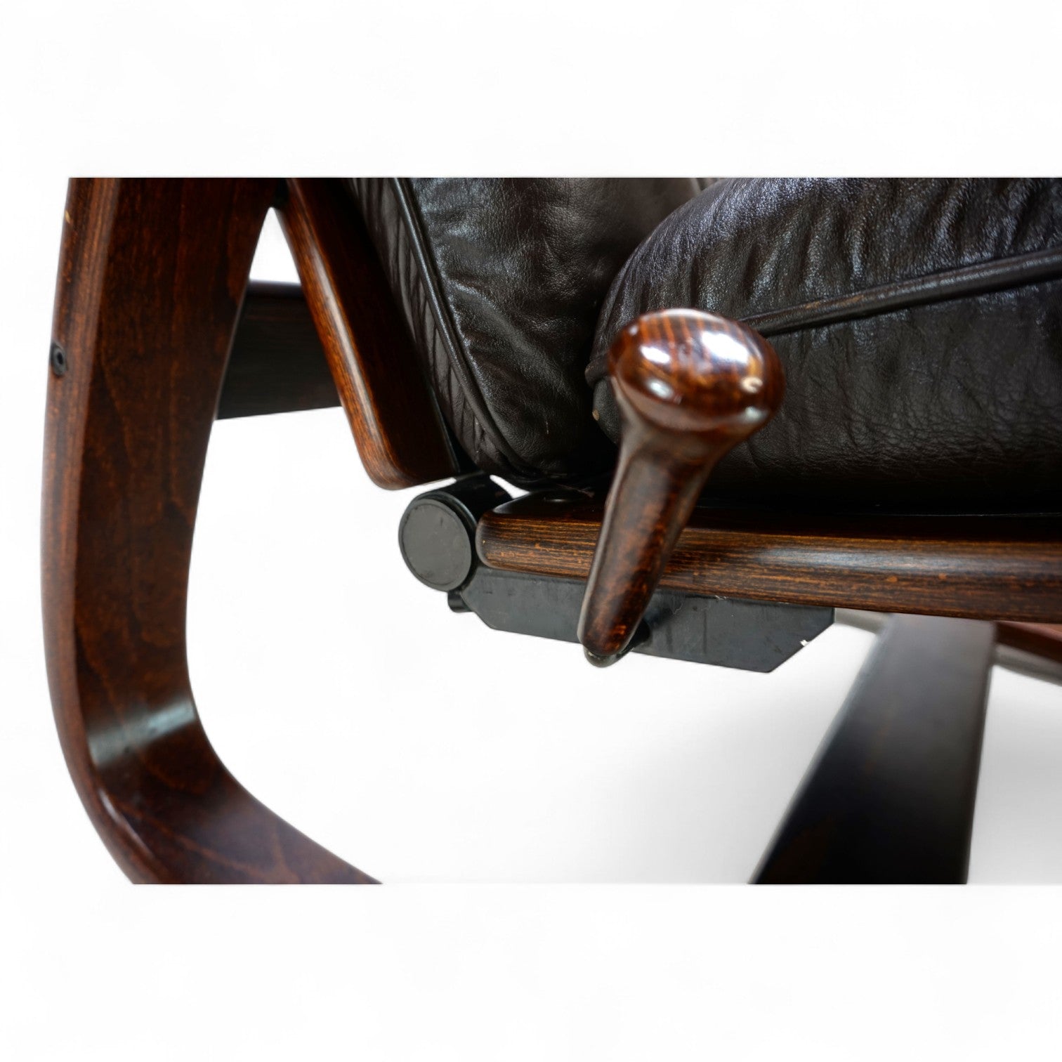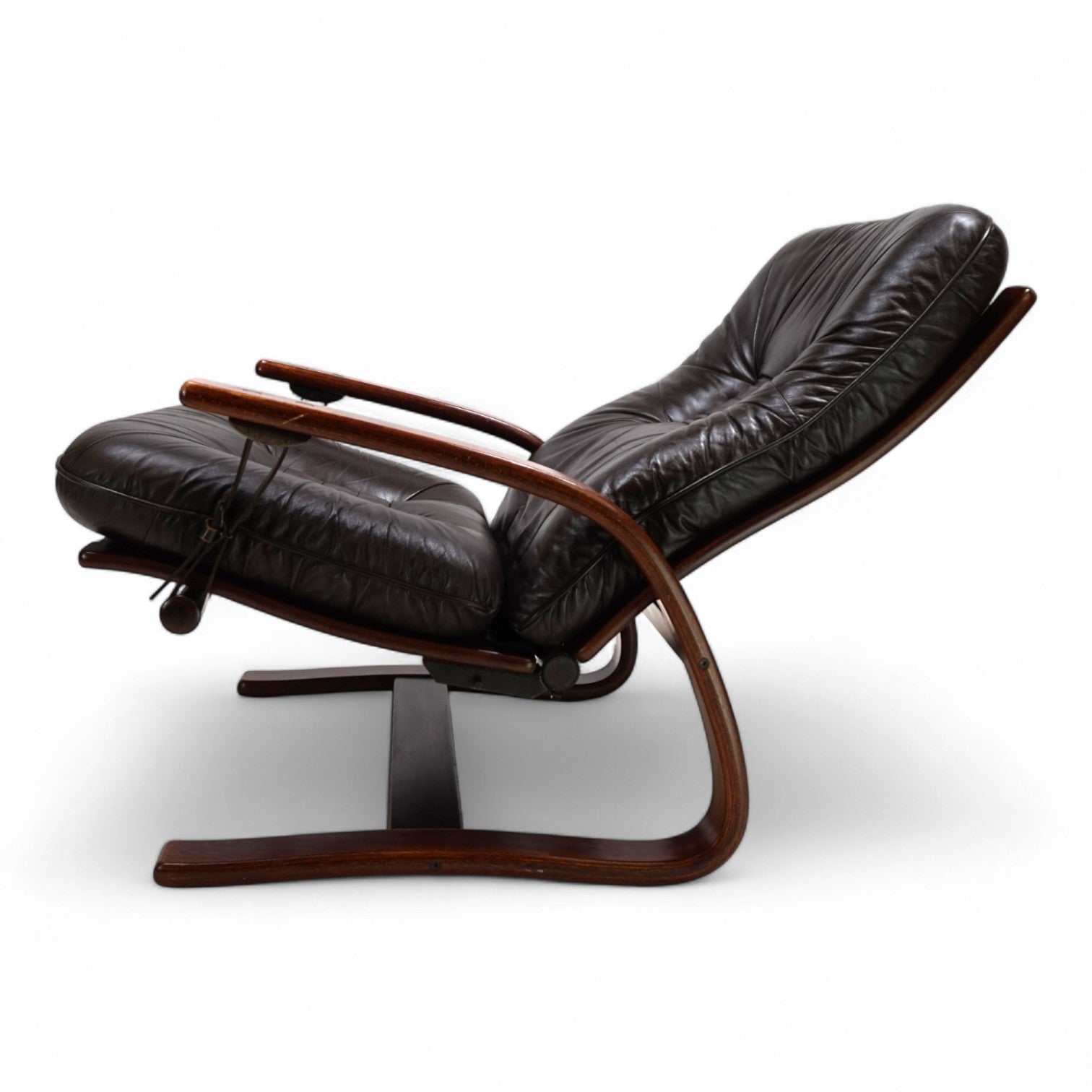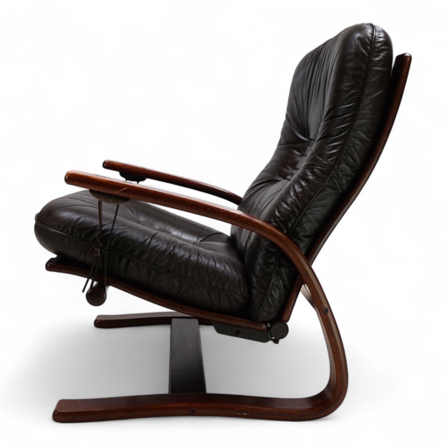 Dieser außergewöhnliche "The Panter" Sessel ist eines der Topmodelle der norwegischen Manufaktur Westnofa. Der Sessel kommt in einem ausgezeichneten Zustand mit einem weichen, braunen Leder in hoher Qualität. Der gebogene Rahmen aus Bentwood zeigt leichte Gebrauchsspuren. Der Sessel kann über einen Feststellmechanismus, der wie eine Bremse funktioniert, in eine Liegeposition gebracht werden. Abgefedert wird der Sessel durch die dicken und gleichzeitig verstellbaren Lederbände,r mit denen die Armlehnen und der Sitzrahmen verbunden sind.