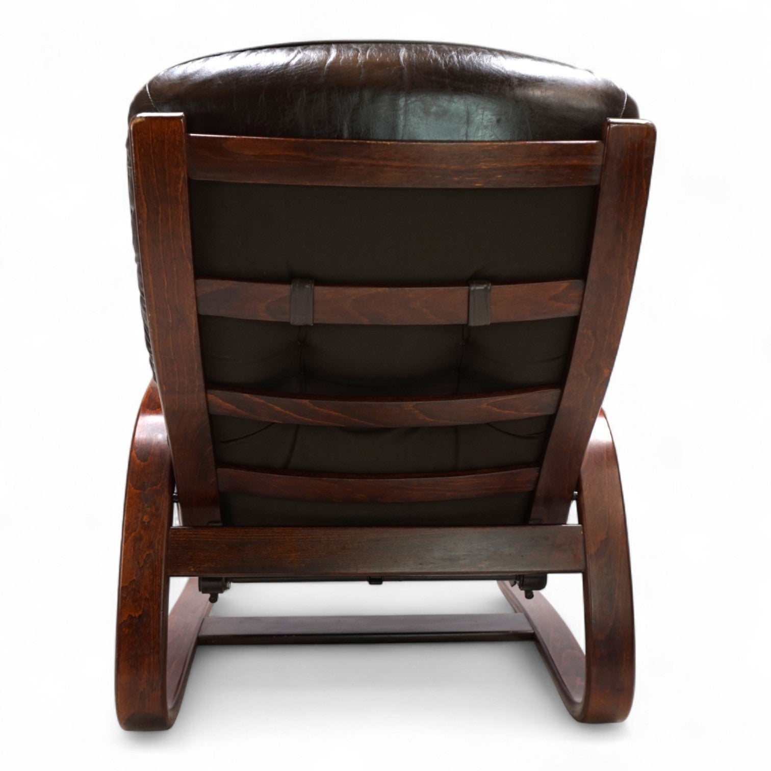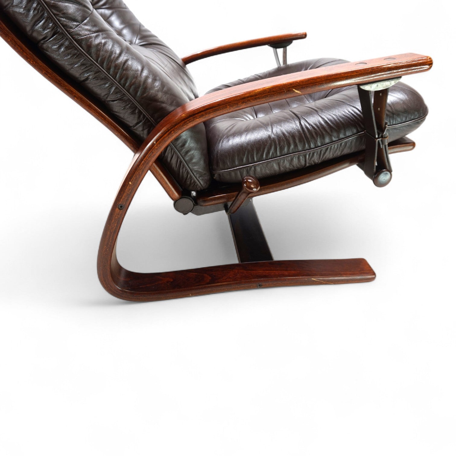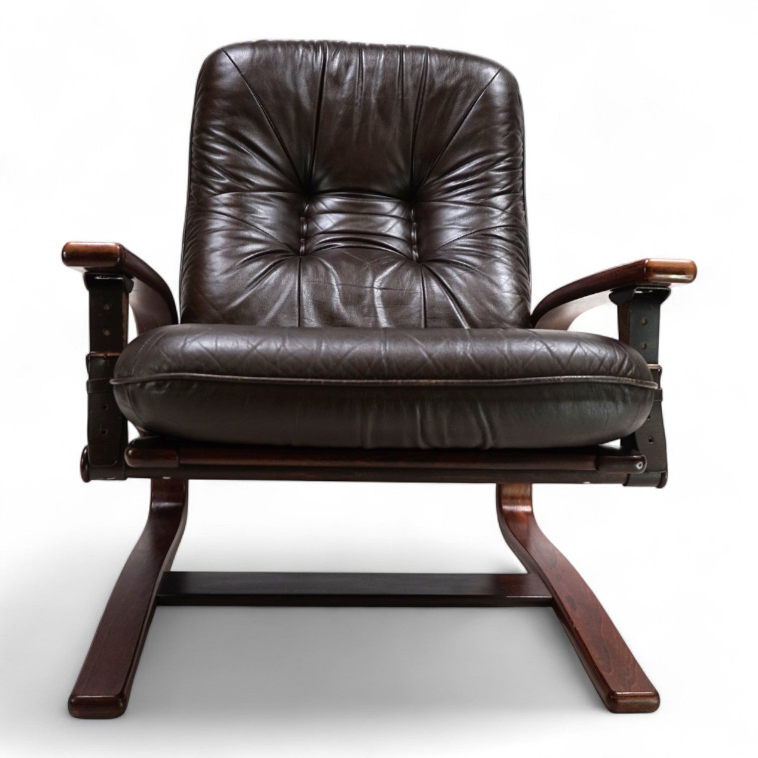 Dieser außergewöhnliche "The Panter" Sessel ist eines der Topmodelle der norwegischen Manufaktur Westnofa. Der Sessel kommt in einem ausgezeichneten Zustand mit einem weichen, braunen Leder in hoher Qualität. Der gebogene Rahmen aus Bentwood zeigt leichte Gebrauchsspuren. Der Sessel kann über einen Feststellmechanismus, der wie eine Bremse funktioniert, in eine Liegeposition gebracht werden. Abgefedert wird der Sessel durch die dicken und gleichzeitig verstellbaren Lederbände,r mit denen die Armlehnen und der Sitzrahmen verbunden sind.