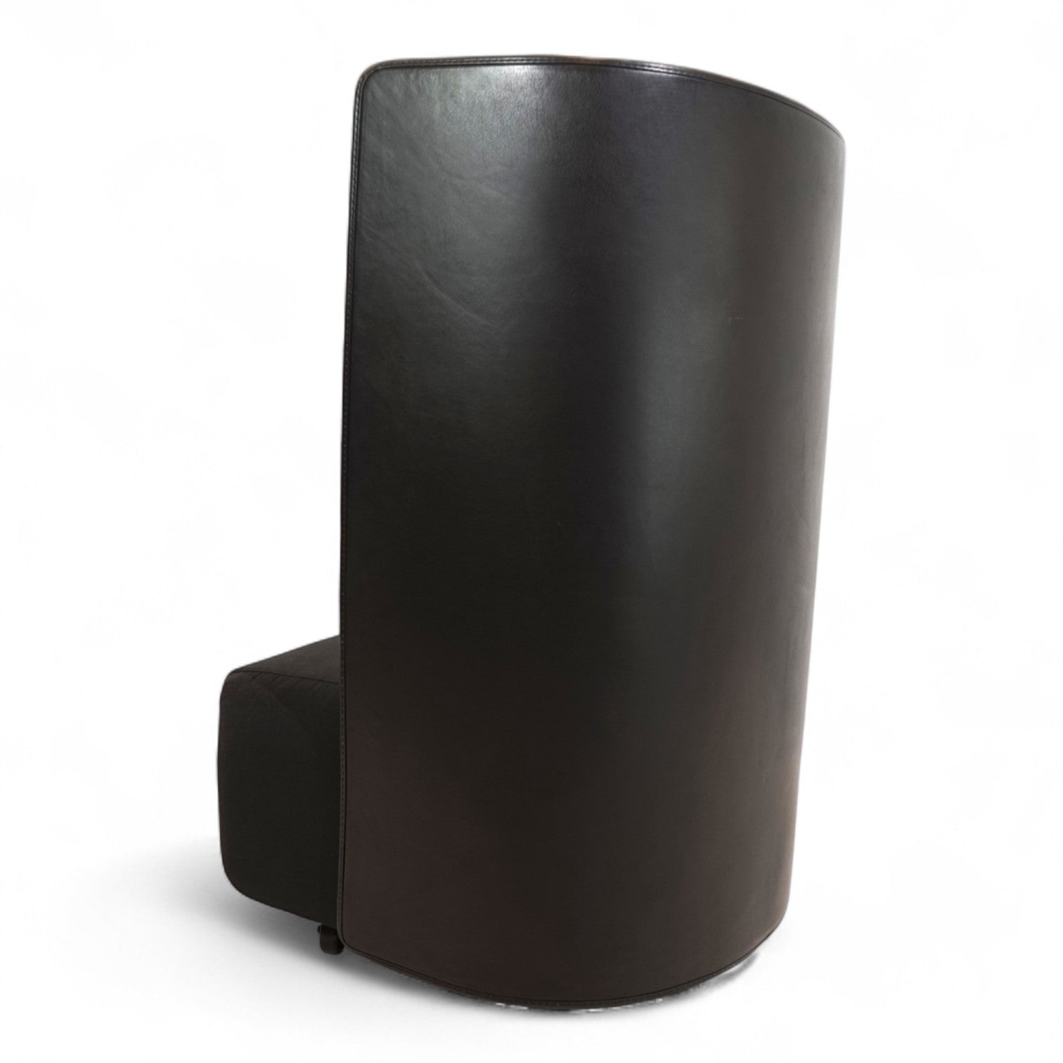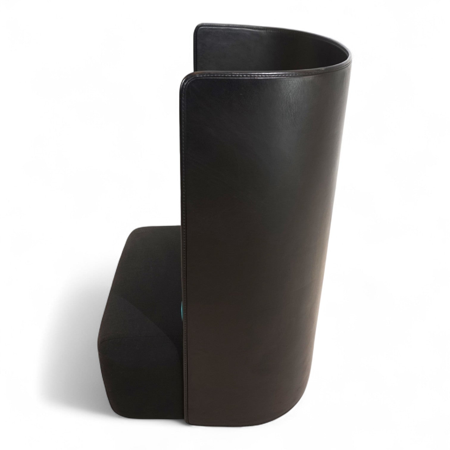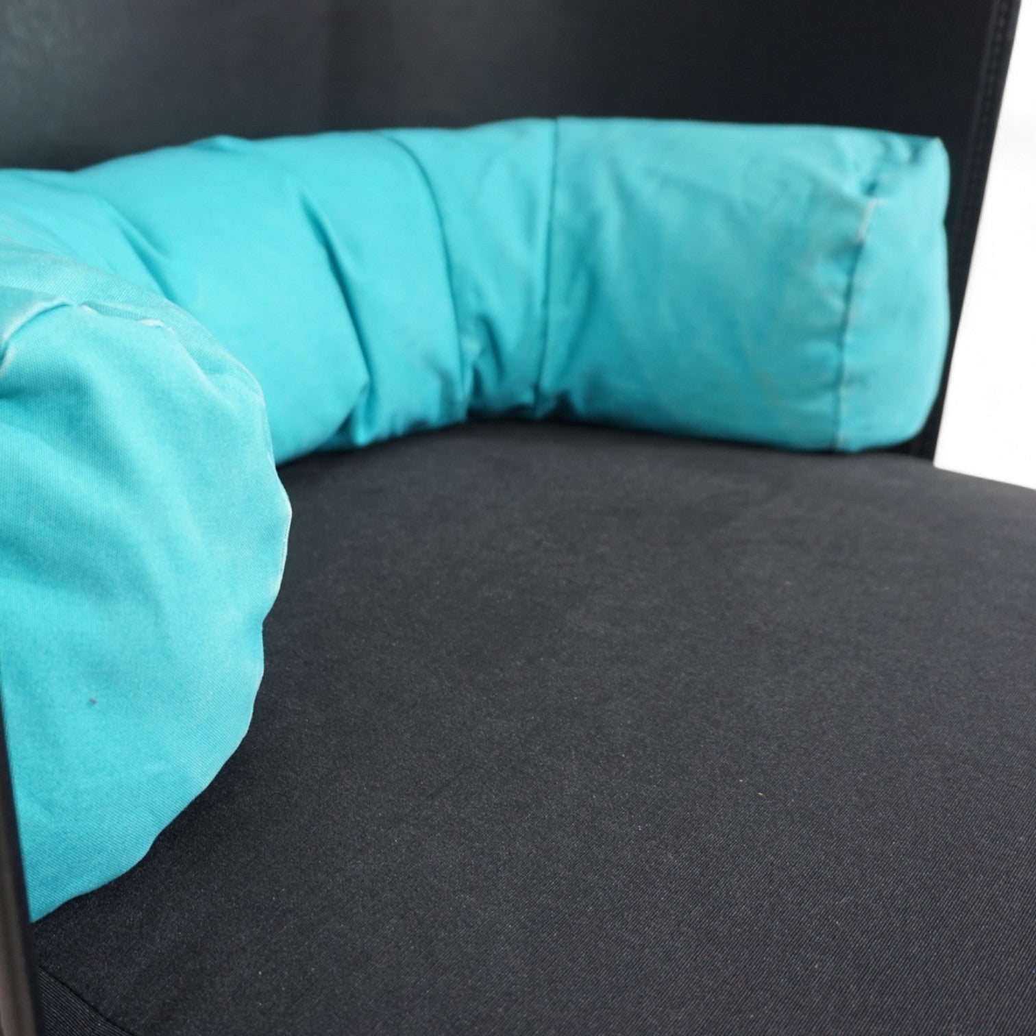 Der beeindruckende Entwurf des Campo mit seiner hoher Rückenlehne besticht noch heute. Dieses Modell mit schwarzer Rückenlehne und schwarzem Stoffsitz kommt in einem hervorragenden Zustand. Das Leder der Rückenlehne zeigt kaum Gebrauchsspuren, die Sitzfläche befindet sich in einem sehr guten Zustand und bietet einen guten Sitzkomfort. Die Rolle des Rückenkissens aus türkisfarbenen Segeltuch weist leichte Gebrauchsspuren auf.  Der Sessel verfügt über zwei Rollen vorn, was ihm eine gute Beweglichkeit verleiht. Der ausladende Entwurf des Campo gibt ihm die Aura eines modernen Thronsessels.