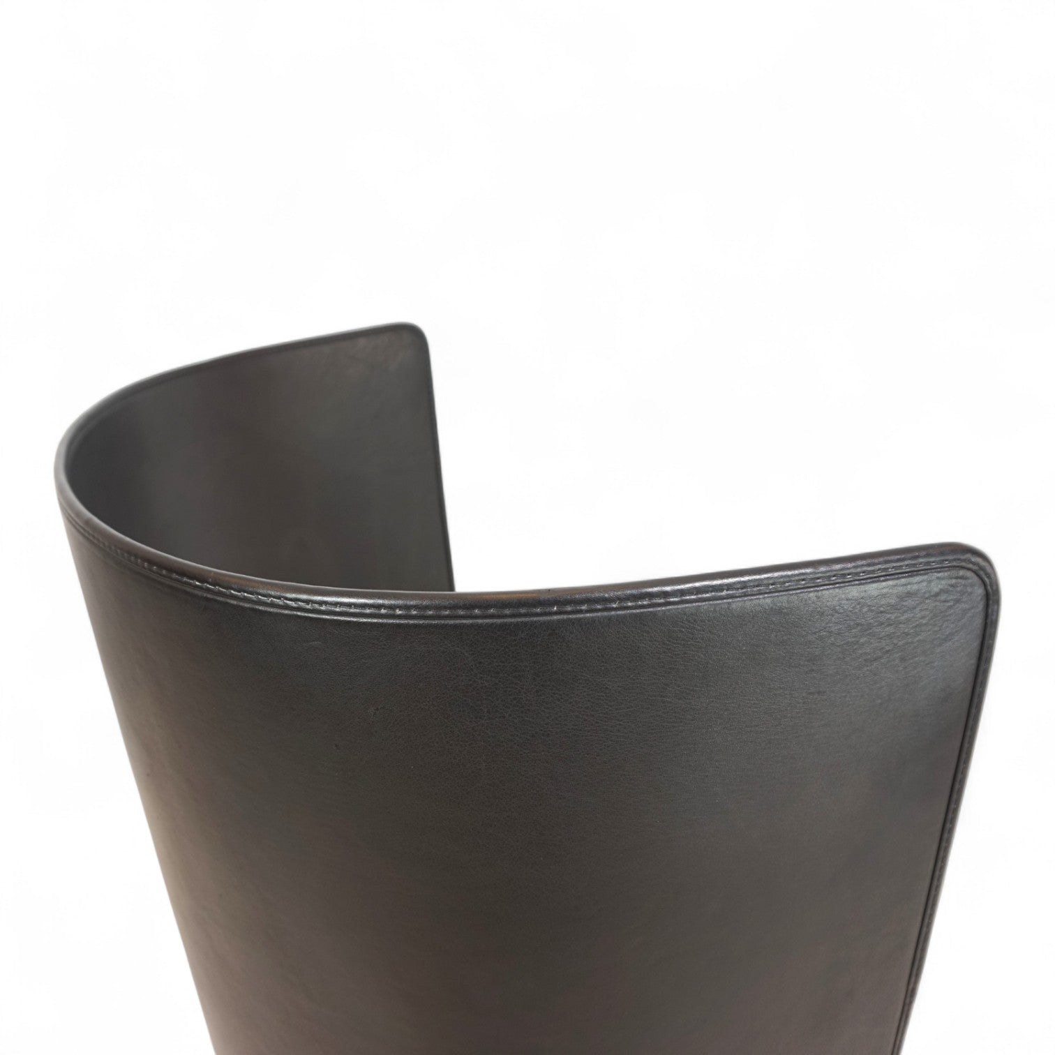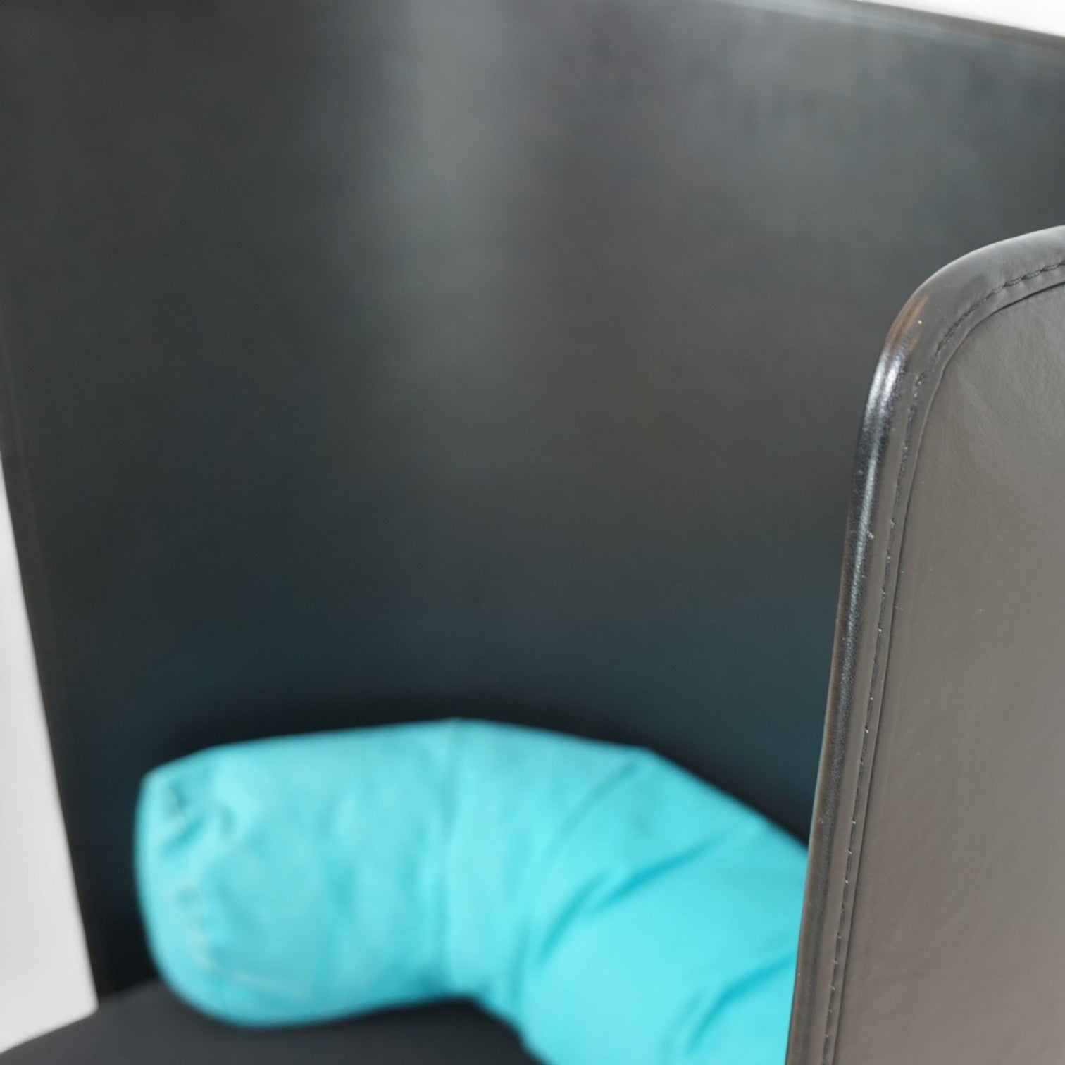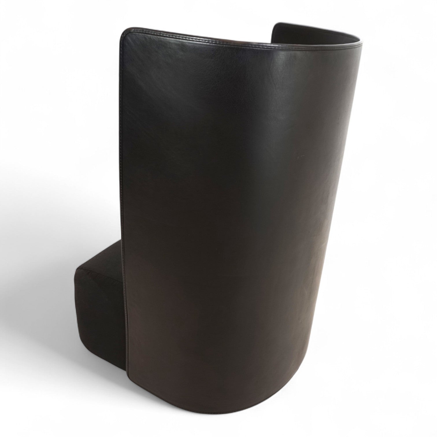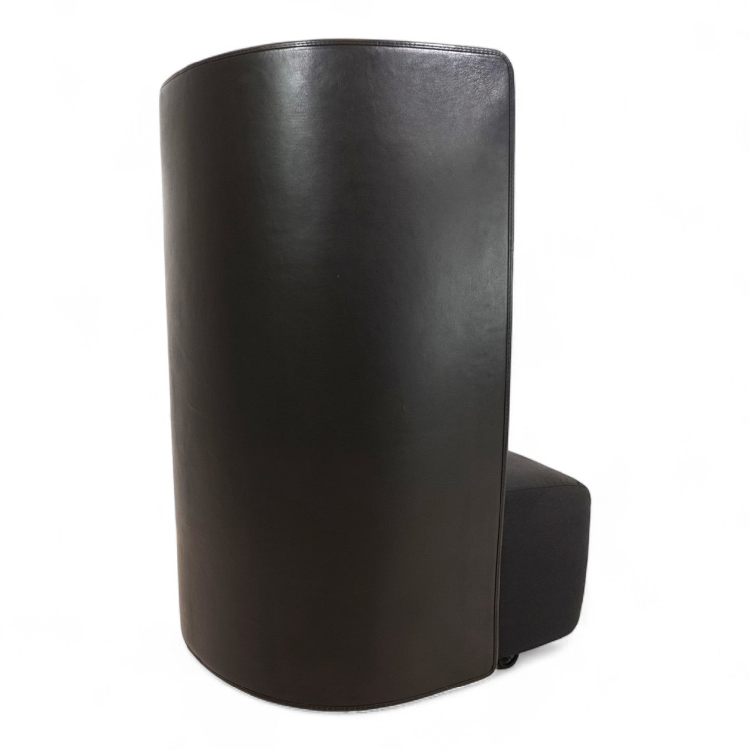 Der beeindruckende Entwurf des Campo mit seiner hoher Rückenlehne besticht noch heute. Dieses Modell mit schwarzer Rückenlehne und schwarzem Stoffsitz kommt in einem hervorragenden Zustand. Das Leder der Rückenlehne zeigt kaum Gebrauchsspuren, die Sitzfläche befindet sich in einem sehr guten Zustand und bietet einen guten Sitzkomfort. Die Rolle des Rückenkissens aus türkisfarbenen Segeltuch weist leichte Gebrauchsspuren auf.  Der Sessel verfügt über zwei Rollen vorn, was ihm eine gute Beweglichkeit verleiht. Der ausladende Entwurf des Campo gibt ihm die Aura eines modernen Thronsessels.