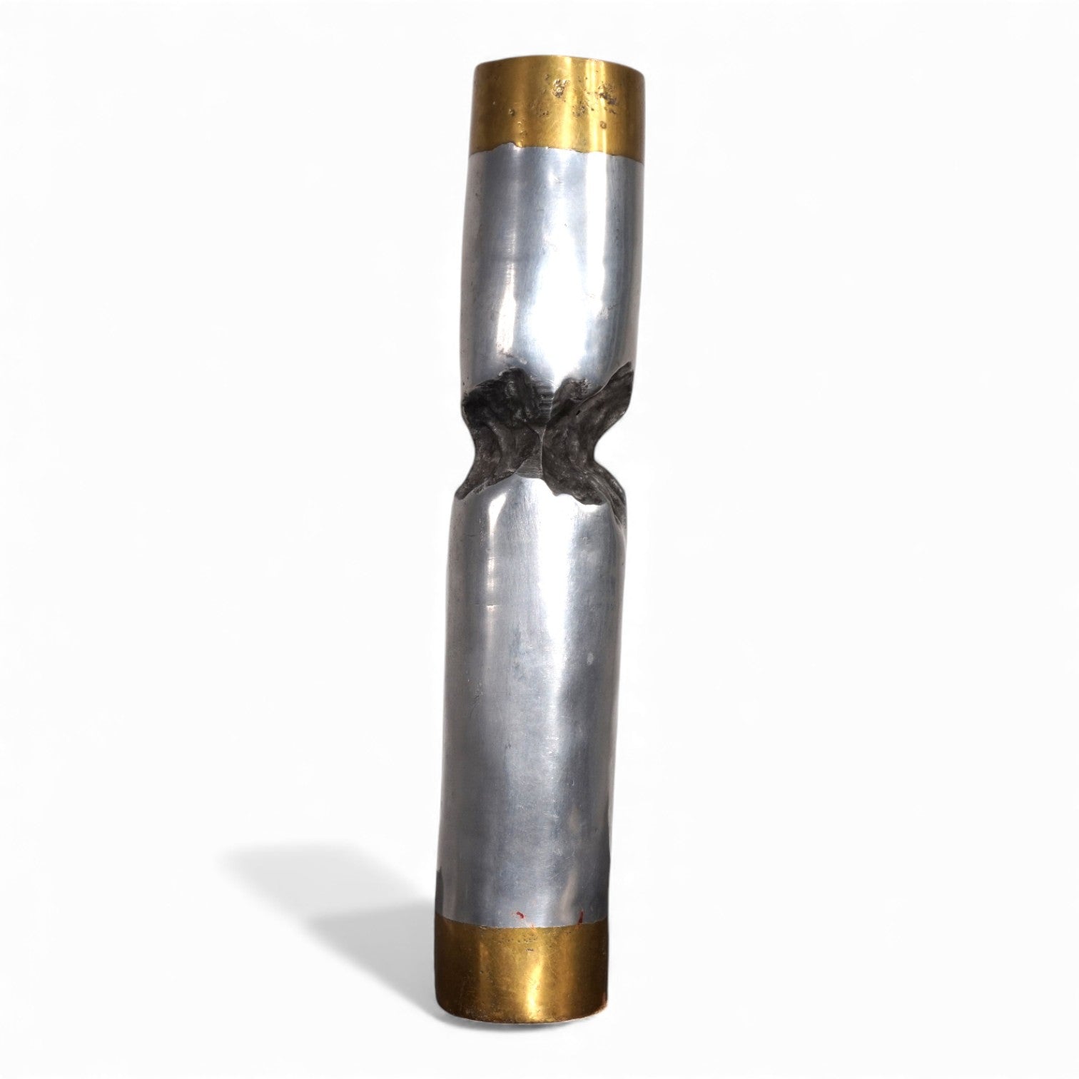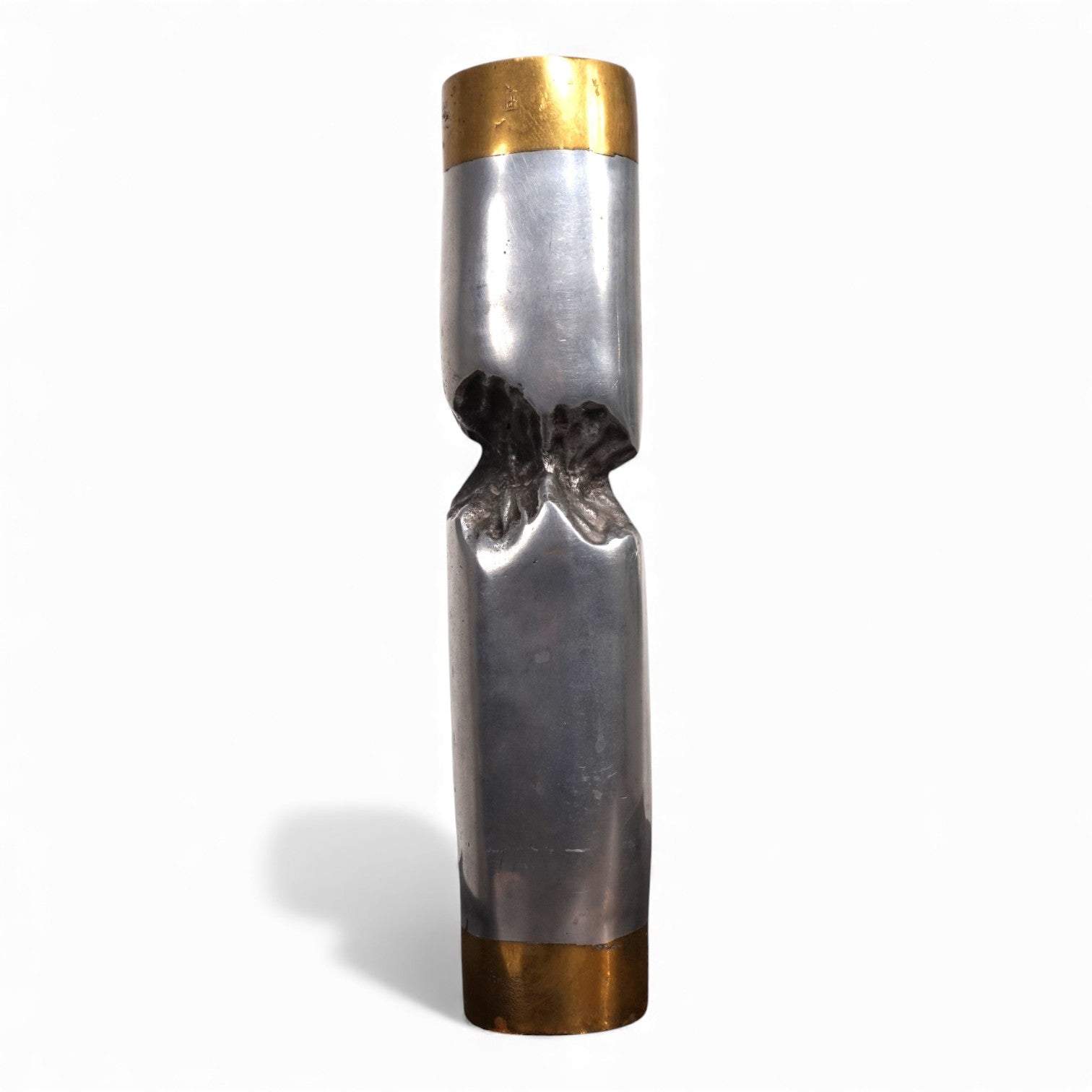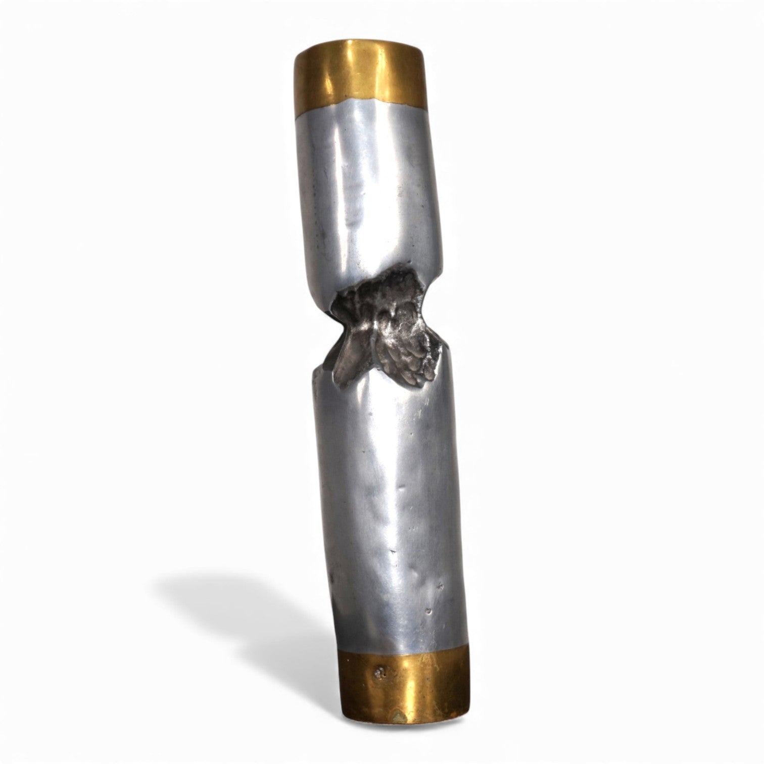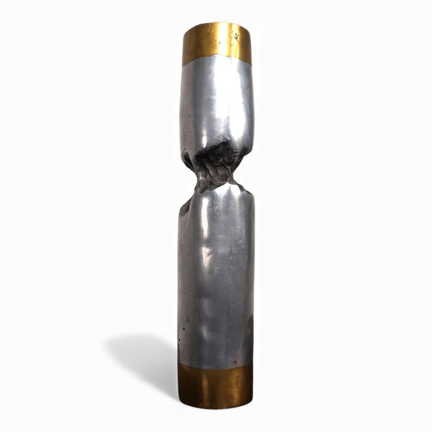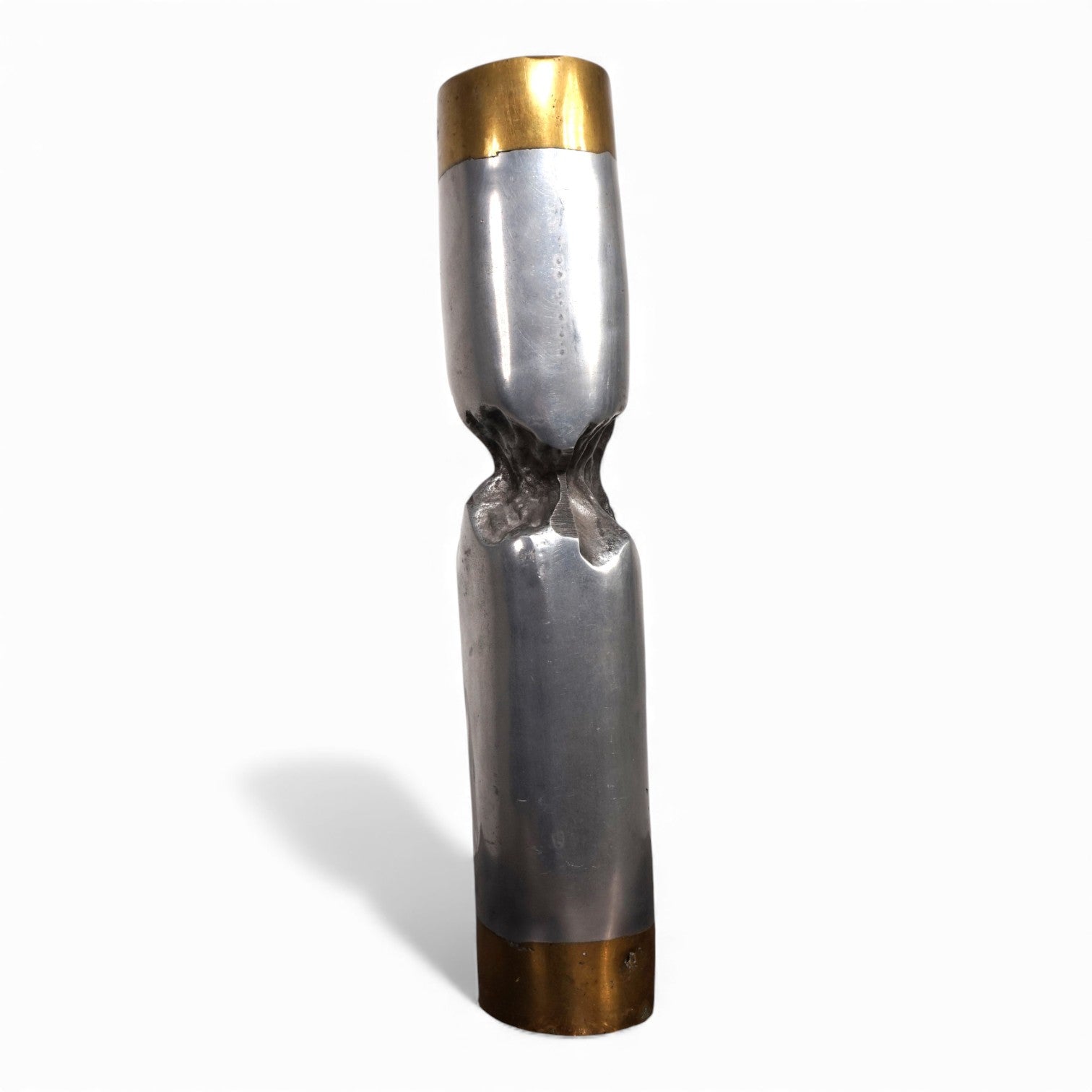 Diese brutalistische Skulptur aus massivem Messing und Aluminium zeigt sich aus allen Blickwinkeln unterschiedlich. Die Krümmung der Skulptur und die Vertiefung der Mitte bilden die entscheidenden Designmerkmale. Der Materialmix aus Aluminium und Messing ist die bevorzugte Mischung von David Marshall. Primär Skulptur, kann diese jedoch auch als Kerzenhalter genutzt werden. Das Gewicht garantiert, trotz der Krümmung, einen sicheren Stand.