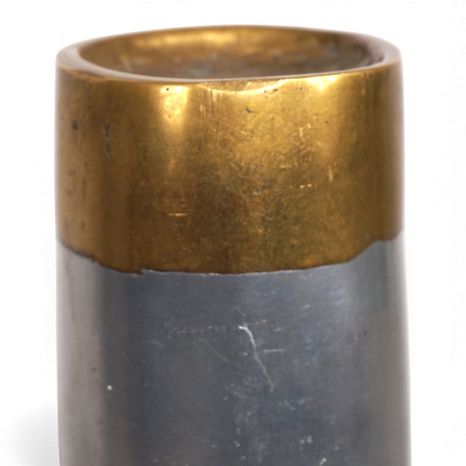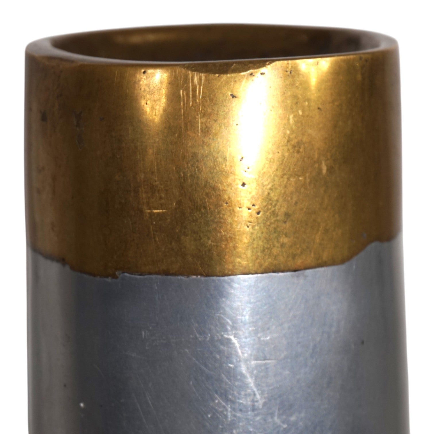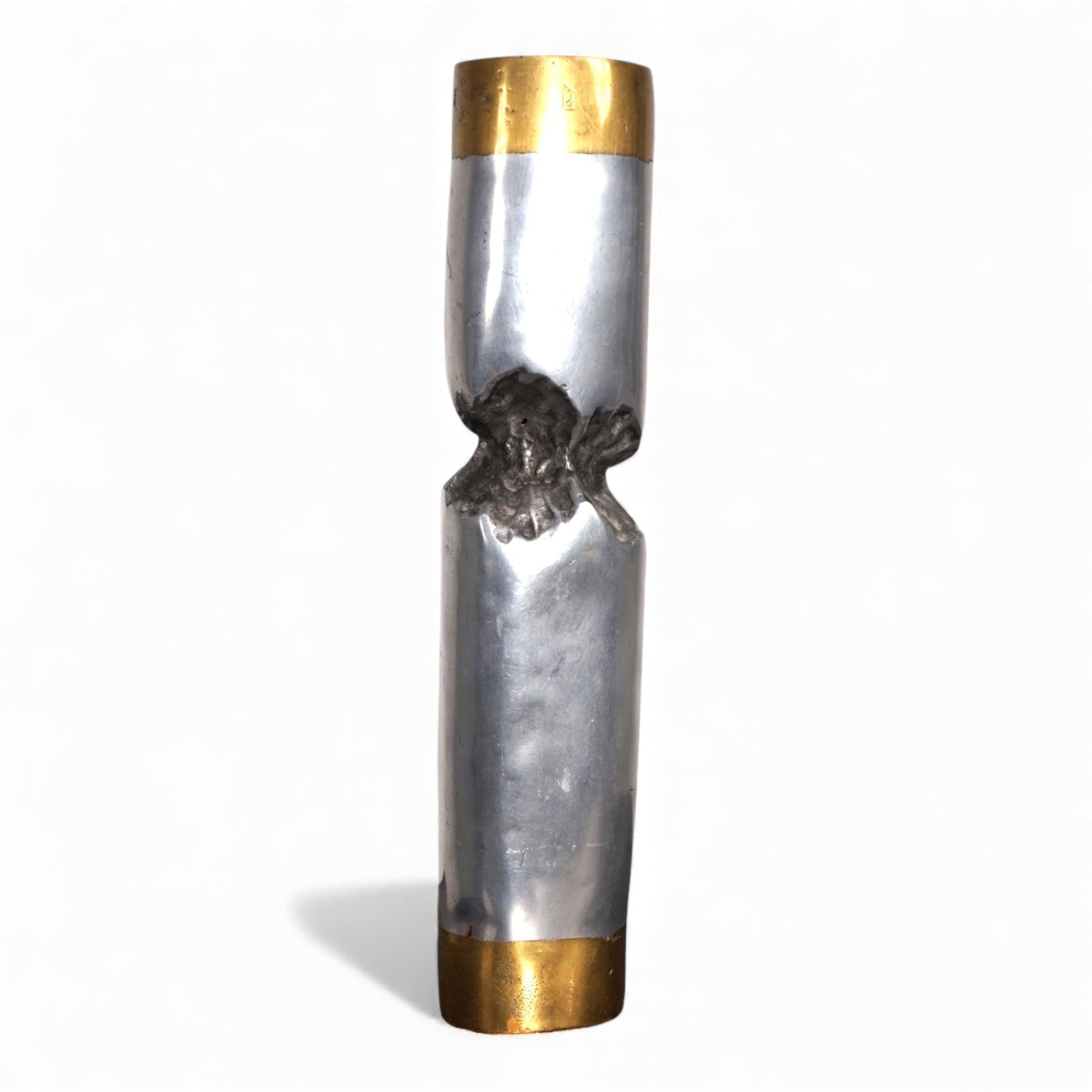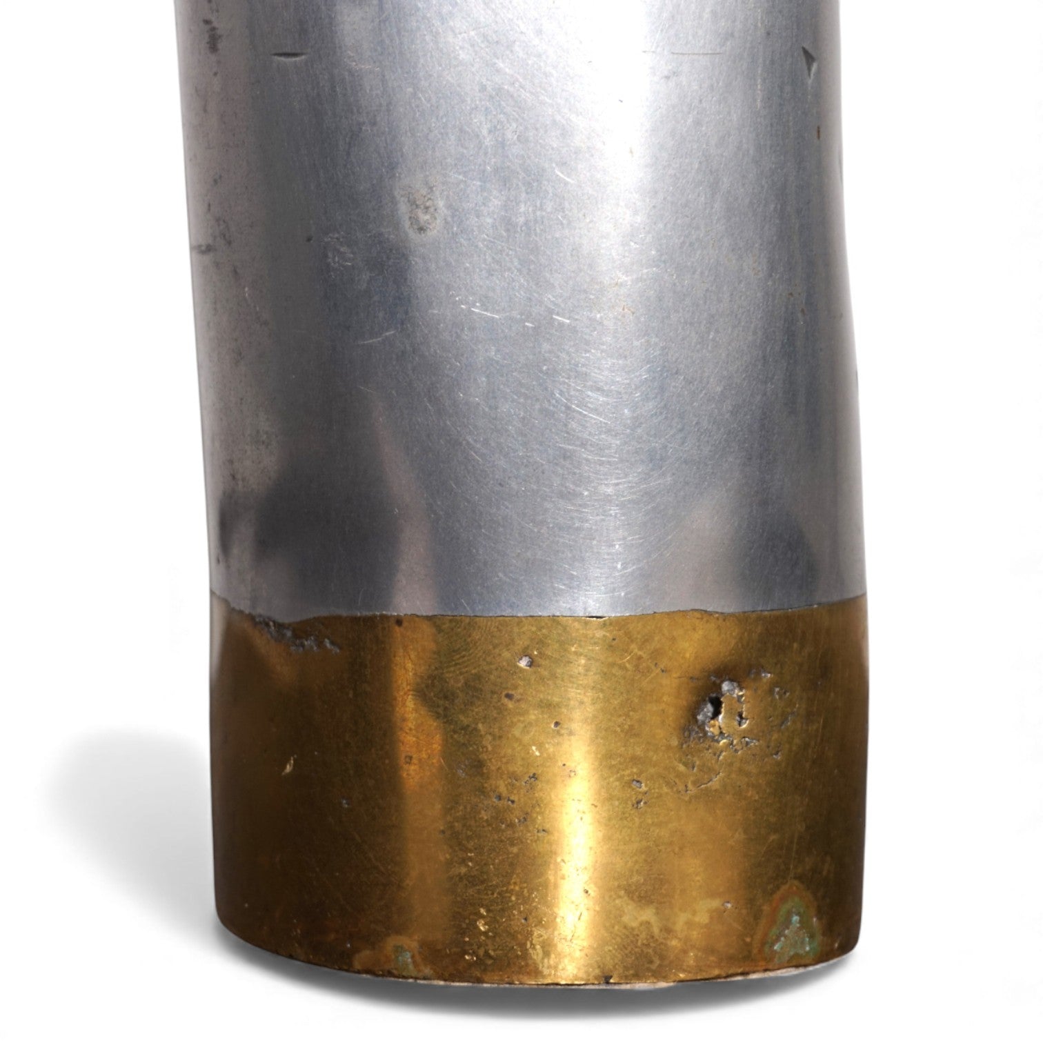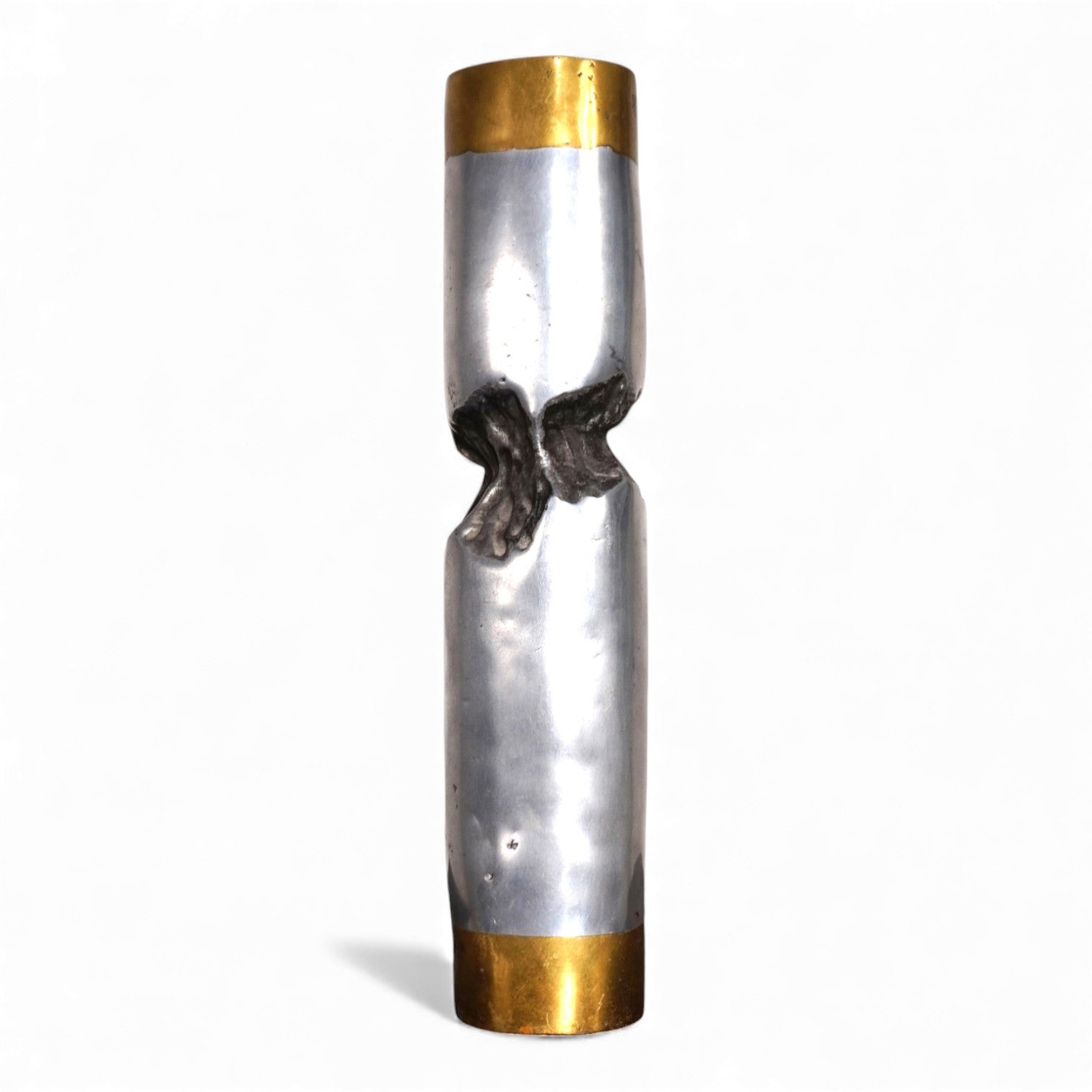 Diese brutalistische Skulptur aus massivem Messing und Aluminium zeigt sich aus allen Blickwinkeln unterschiedlich. Die Krümmung der Skulptur und die Vertiefung der Mitte bilden die entscheidenden Designmerkmale. Der Materialmix aus Aluminium und Messing ist die bevorzugte Mischung von David Marshall. Primär Skulptur, kann diese jedoch auch als Kerzenhalter genutzt werden. Das Gewicht garantiert, trotz der Krümmung, einen sicheren Stand.