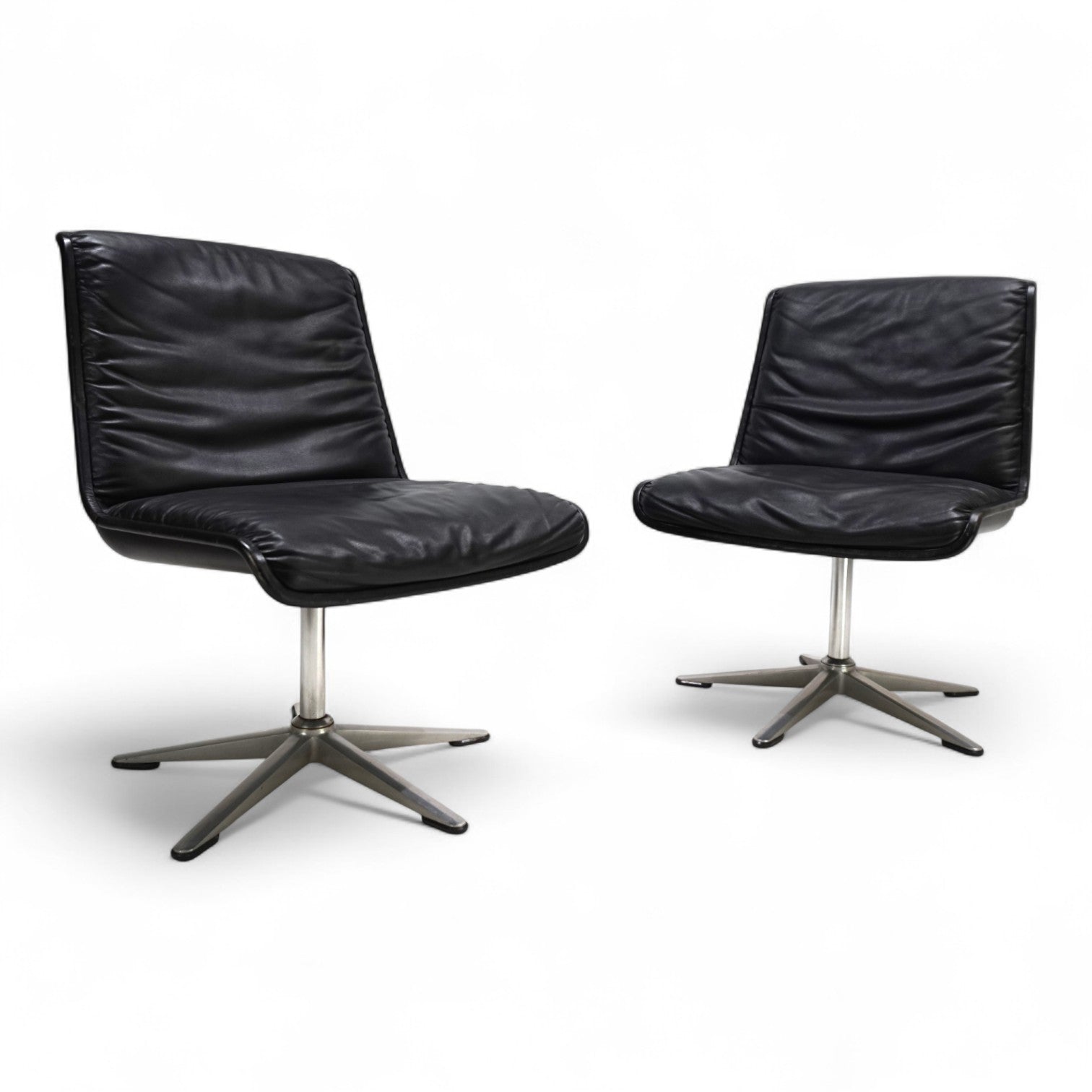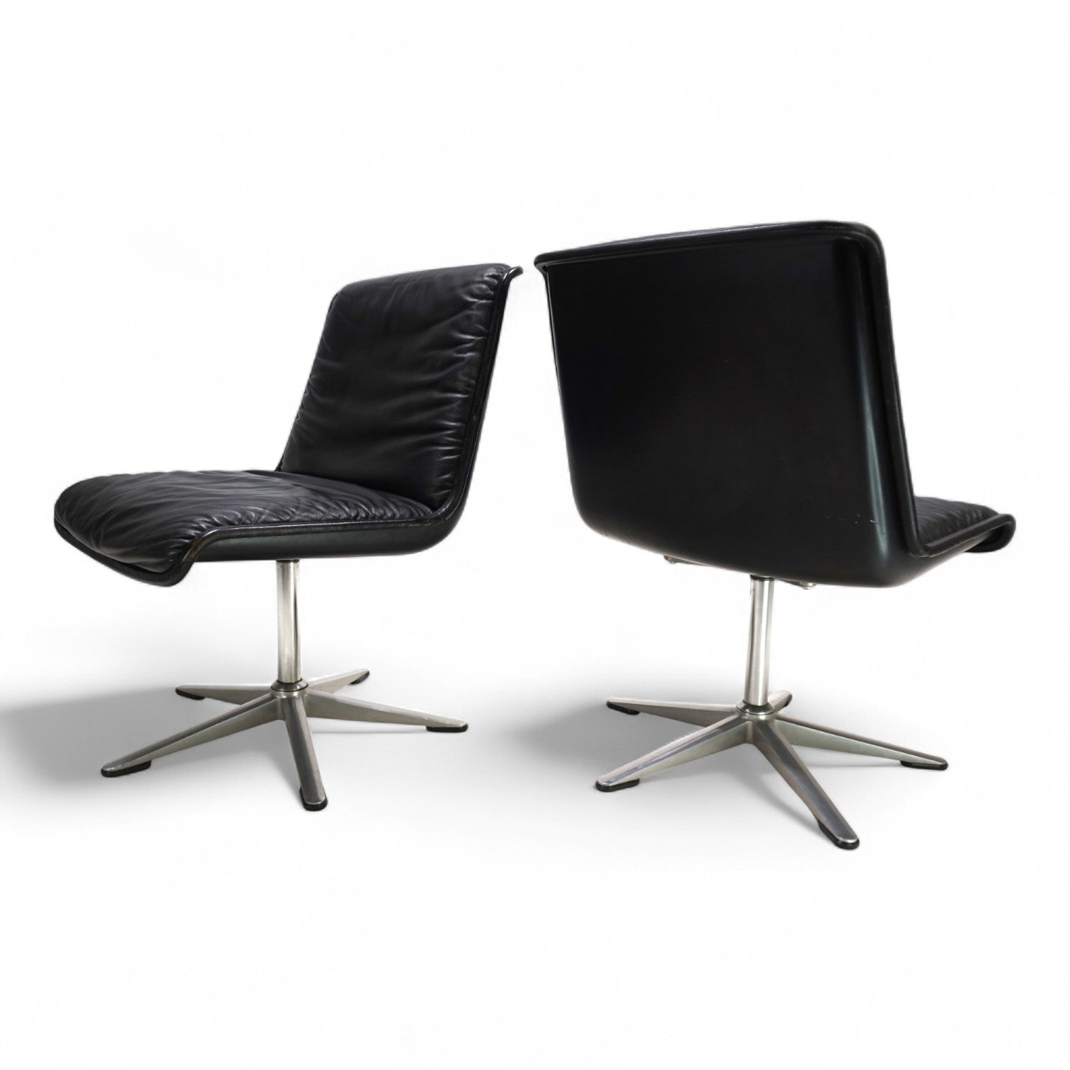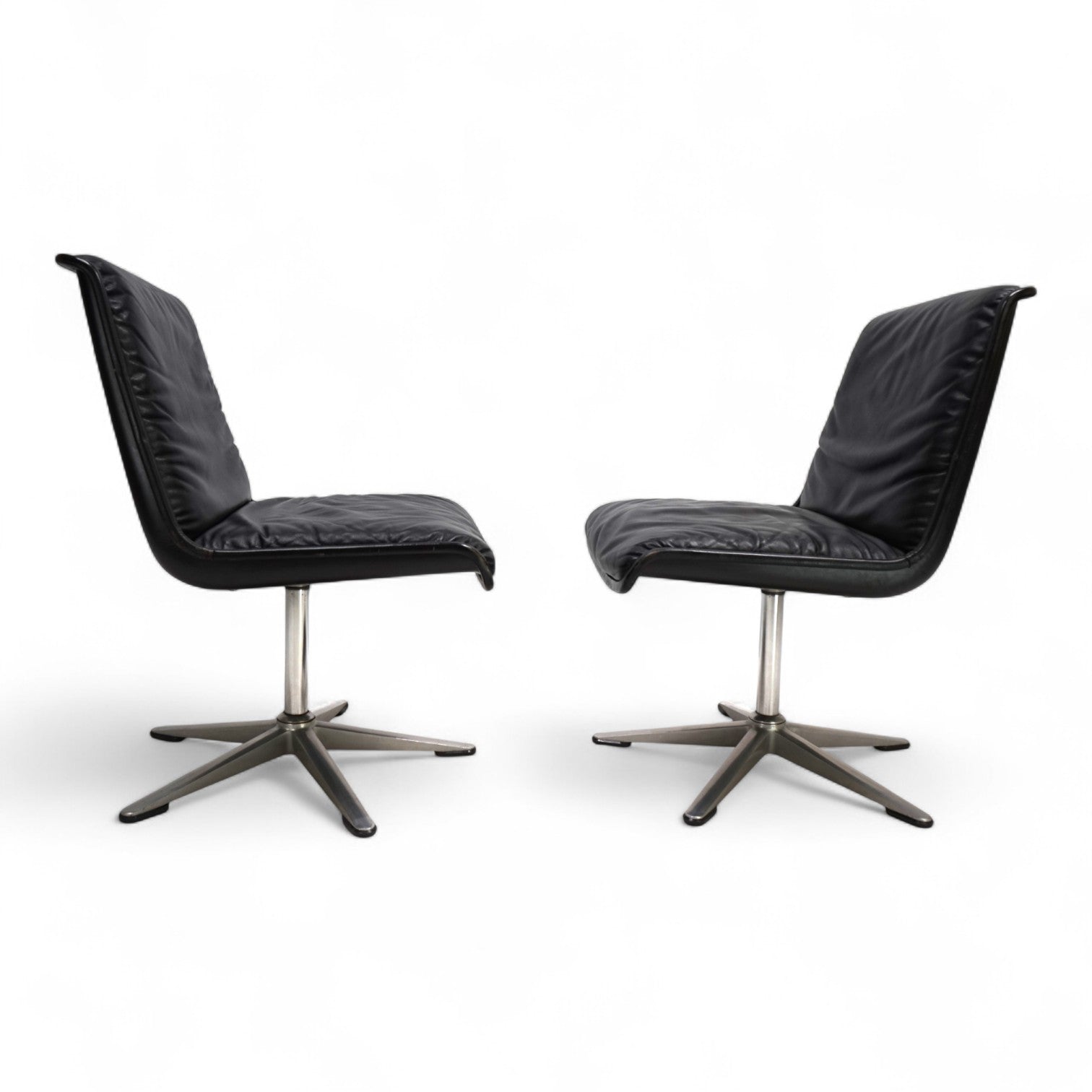 Dieses Set von 2 Wilkhahn Delta 2000 Stühlen, in einem tiefschwarzen Lederton, gebürstetem Aluminium und mit schwarzen Schalen, befindet sich in einem hervorragenden Zustand. Das Leder der Stühle zeigt kaum Gebrauchsspuren, die Keder minimale Patina. Die Drehfunktion kann über einen Mechanismus im Chromfuß fixiert werden. Die Sternfüße aus gebürsteten Aluminium geben den Stühlen einen festen Stand. Ein Klassiker im 60er Design, der als Büro- oder Esszimmerstuhl verwendet werden kann.