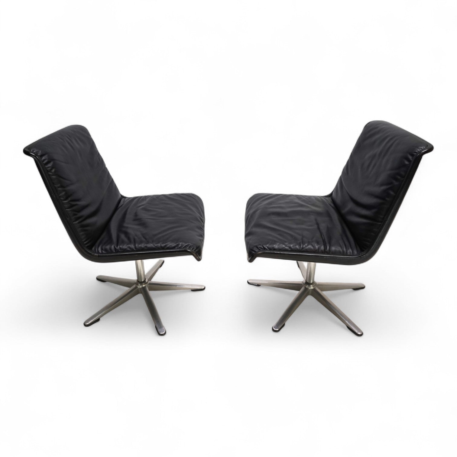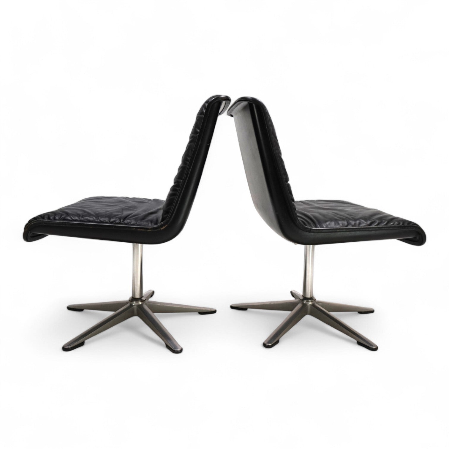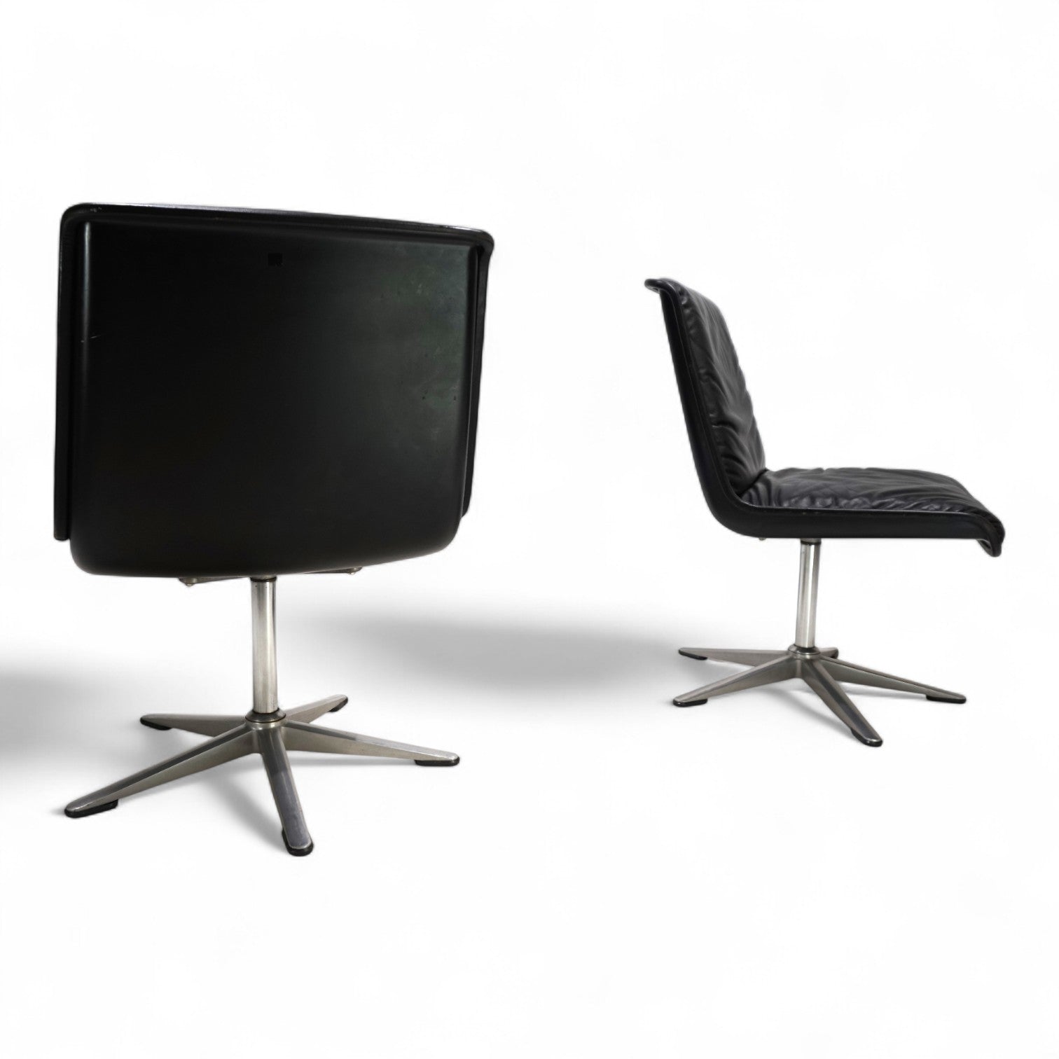 Dieses Set von 2 Wilkhahn Delta 2000 Stühlen, in einem tiefschwarzen Lederton, gebürstetem Aluminium und mit schwarzen Schalen, befindet sich in einem hervorragenden Zustand. Das Leder der Stühle zeigt kaum Gebrauchsspuren, die Keder minimale Patina. Die Drehfunktion kann über einen Mechanismus im Chromfuß fixiert werden. Die Sternfüße aus gebürsteten Aluminium geben den Stühlen einen festen Stand. Ein Klassiker im 60er Design, der als Büro- oder Esszimmerstuhl verwendet werden kann.