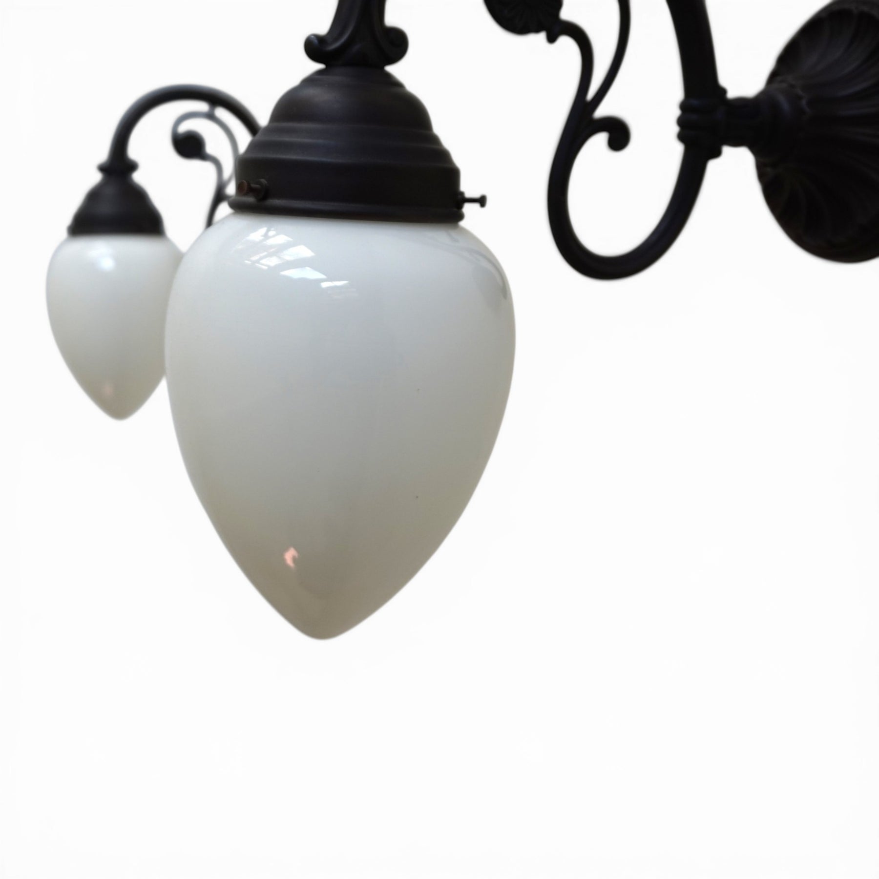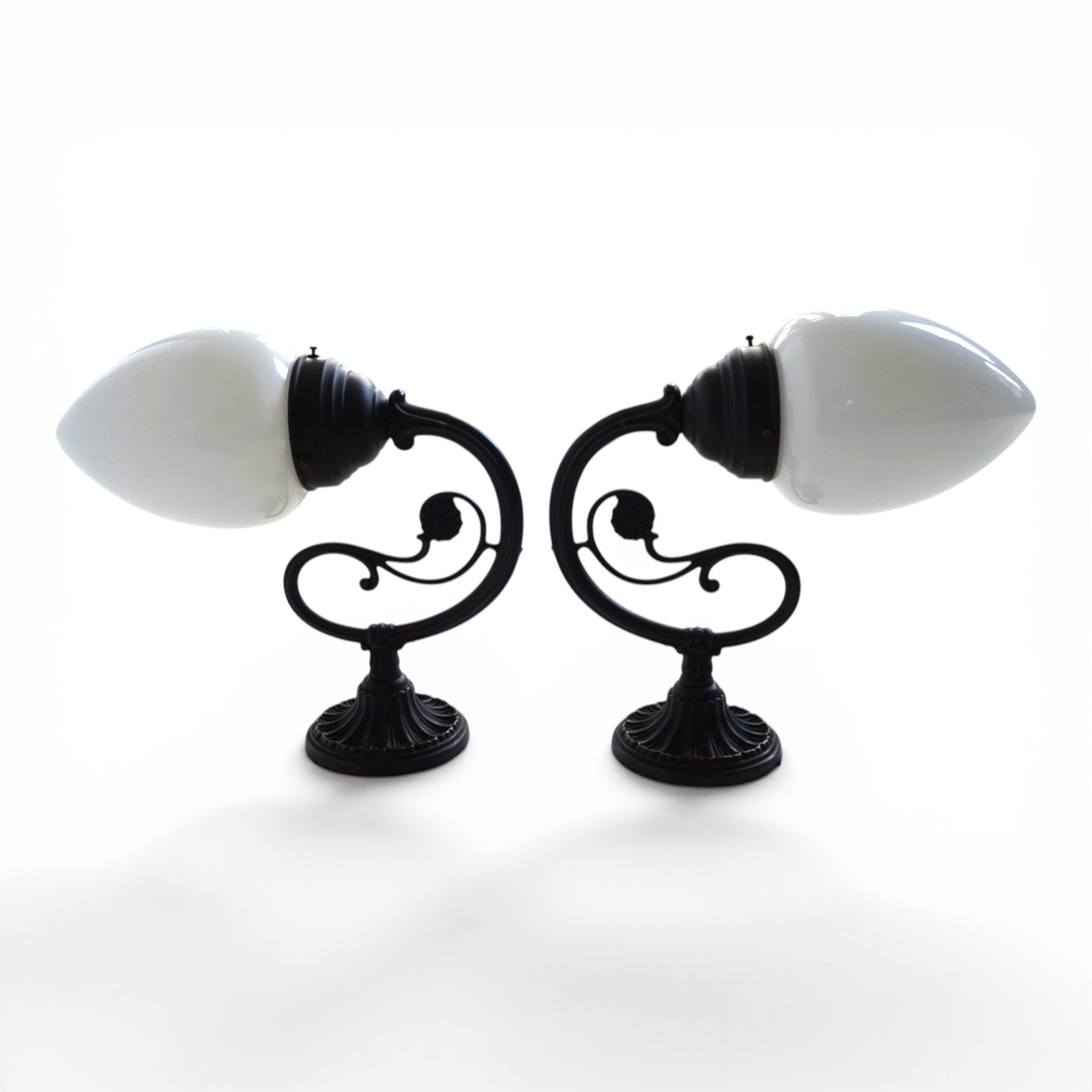 Die formschönen Schirme aus opalem Milchglas sorgen für ein angenehm weiches, diffuses Licht und befinden sich in einwandfreiem Zustand. Auch technisch wurden die Lampen sorgfältig überarbeitet und neu verkabelt, sodass sie sofort einsatzbereit sind und modernen Ansprüchen gerecht werden.