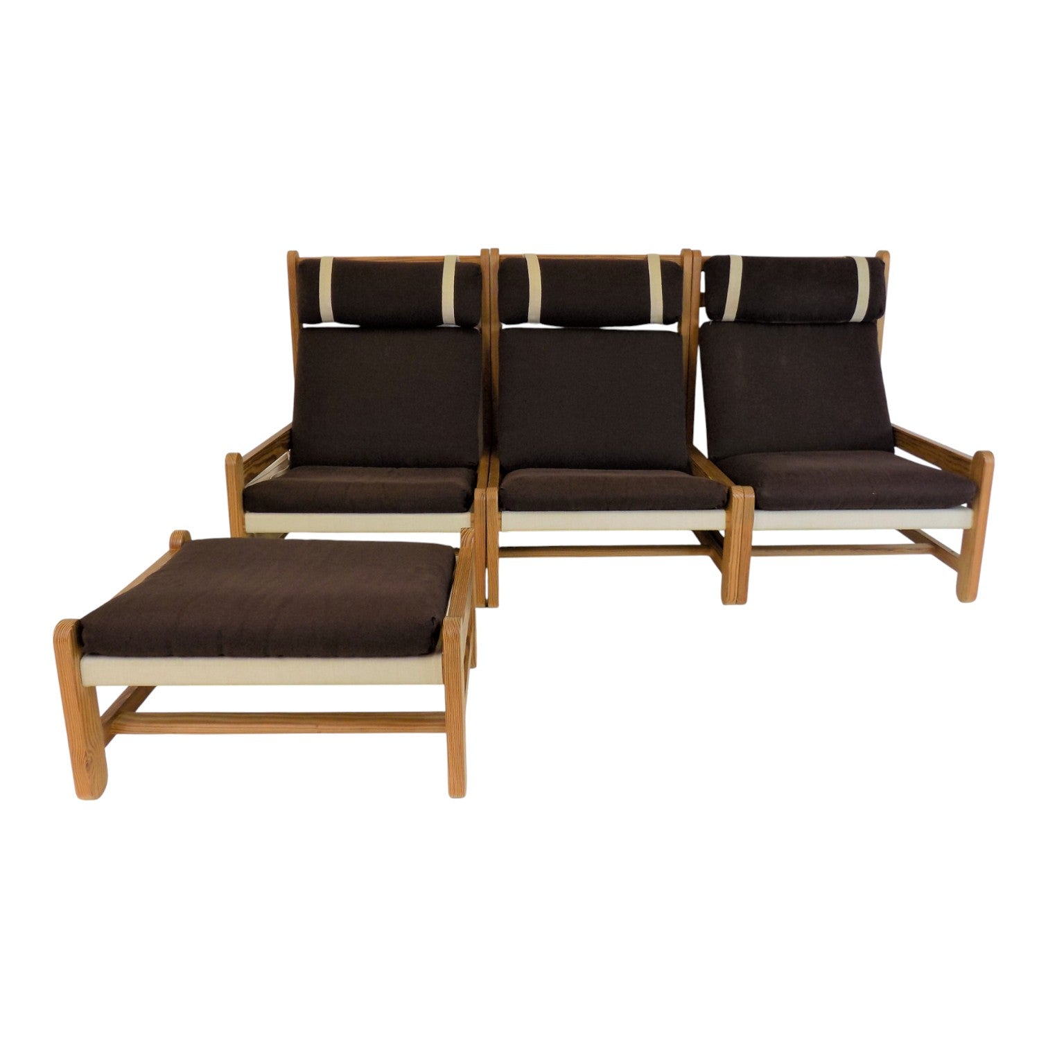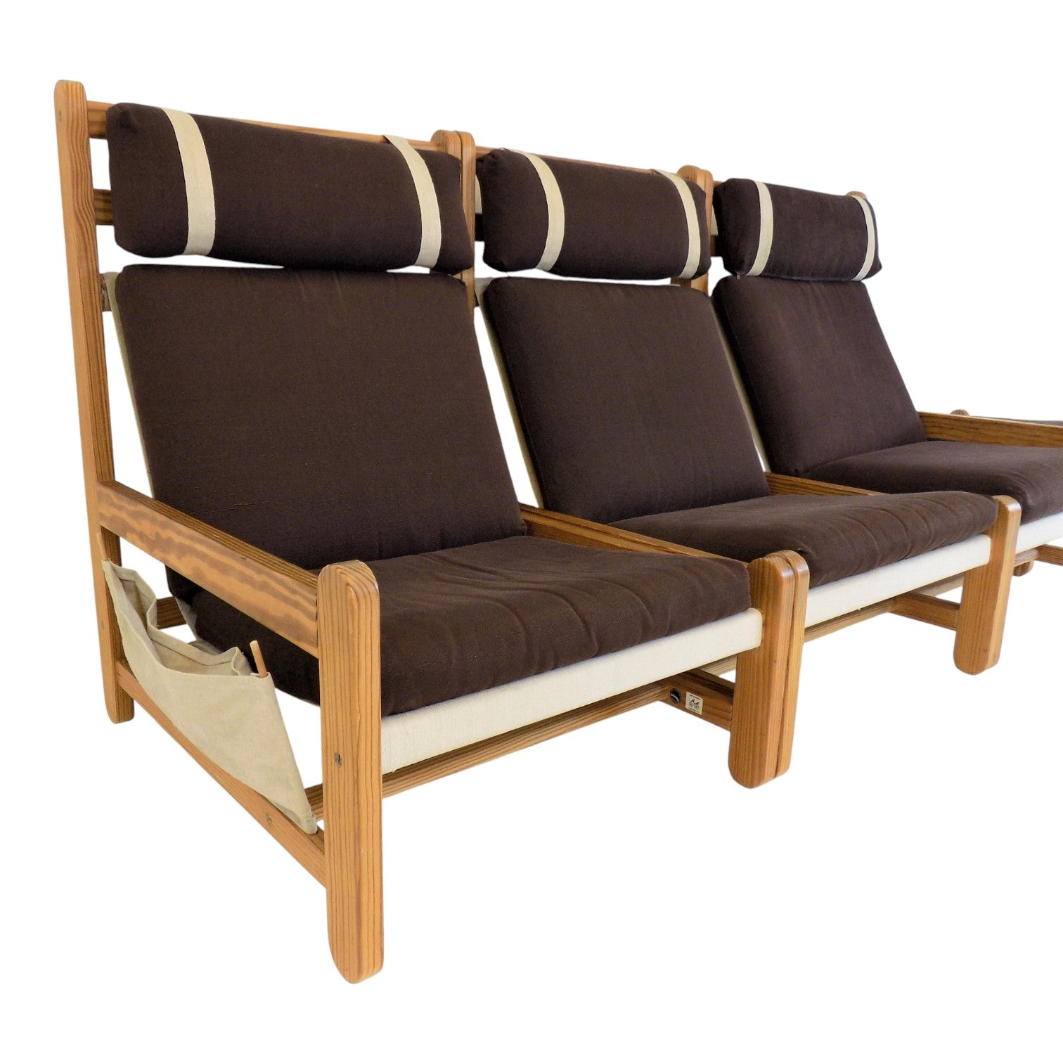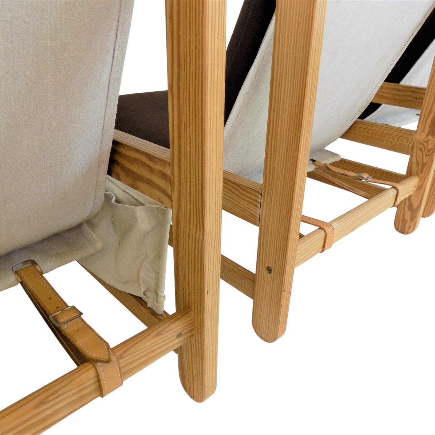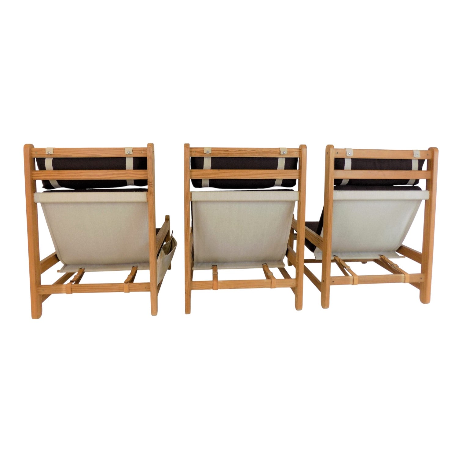 Dieses selten zu findende Modell befindet sich in einem sehr guten Zustand. Die Gestelle aus Kiefernholz zeigen kaum Gebrauchsspuren, auch die Polster aus braunem Stoff sind in einem einwandfreien Zustand. In die Holzgestell sind helle Canvas Bezüge mit dicken Lederriemen gespannt. Alle Kissenbezüge können leicht abgezogen und gewaschen werden. Zu dem 3er Set gehört ein Ottoman. Die Objekte können zusammen als 3er Sofa oder auch einzeln gestellt werden.