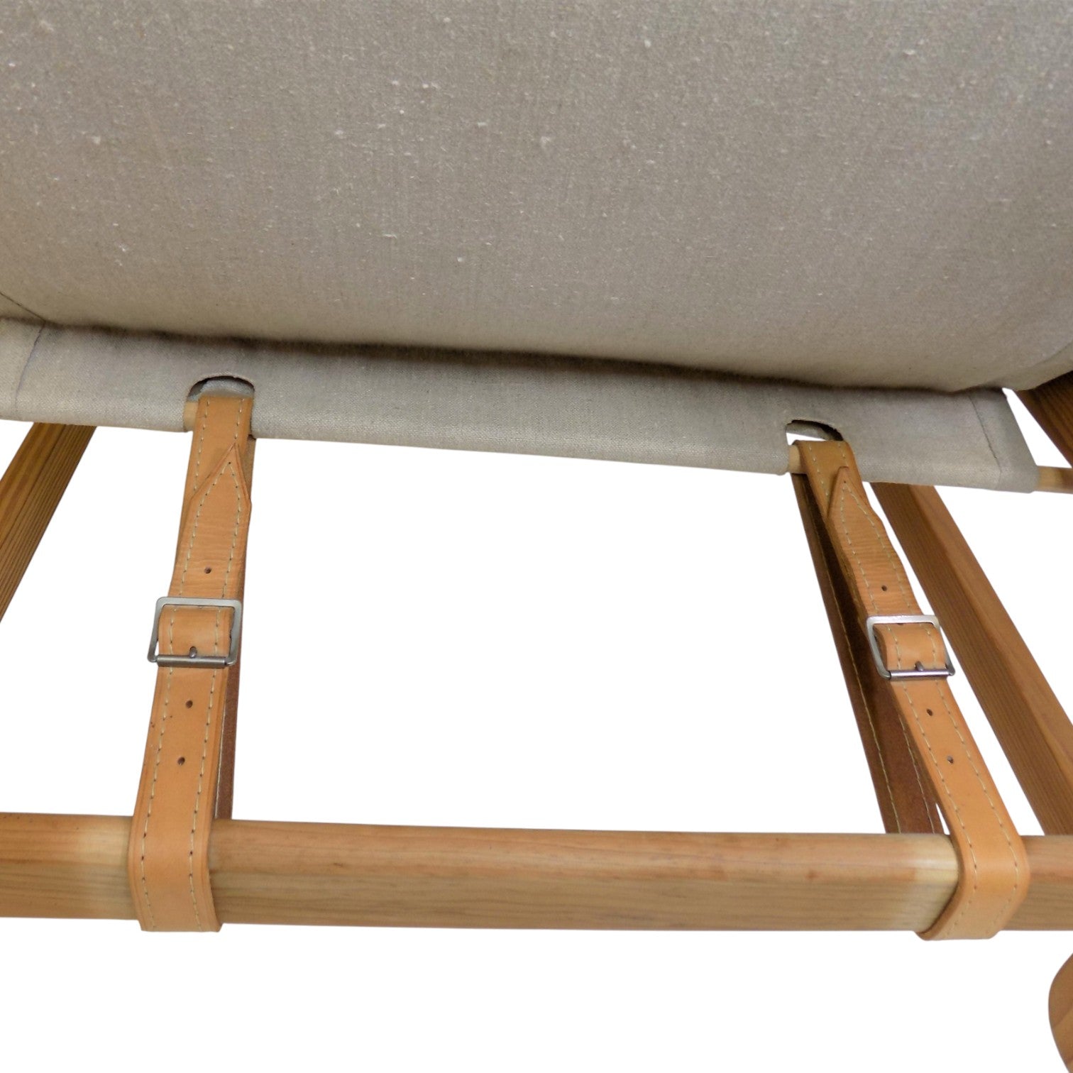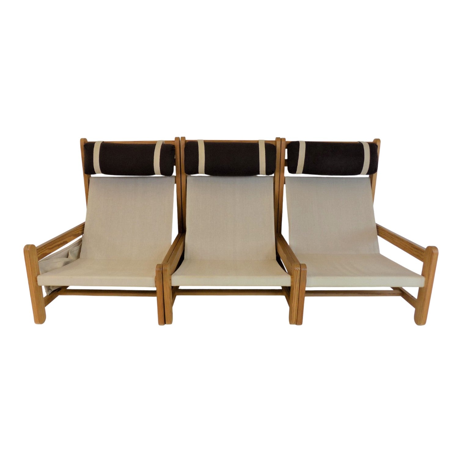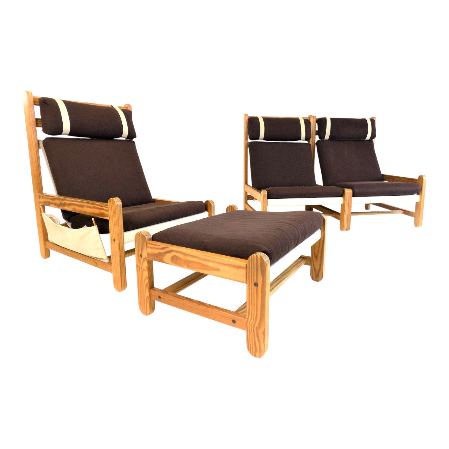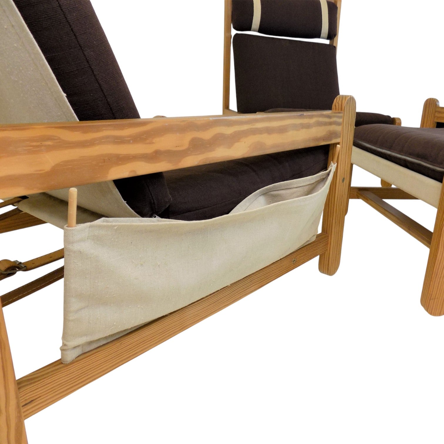 Dieses selten zu findende Modell befindet sich in einem sehr guten Zustand. Die Gestelle aus Kiefernholz zeigen kaum Gebrauchsspuren, auch die Polster aus braunem Stoff sind in einem einwandfreien Zustand. In die Holzgestell sind helle Canvas Bezüge mit dicken Lederriemen gespannt. Alle Kissenbezüge können leicht abgezogen und gewaschen werden. Zu dem 3er Set gehört ein Ottoman. Die Objekte können zusammen als 3er Sofa oder auch einzeln gestellt werden.