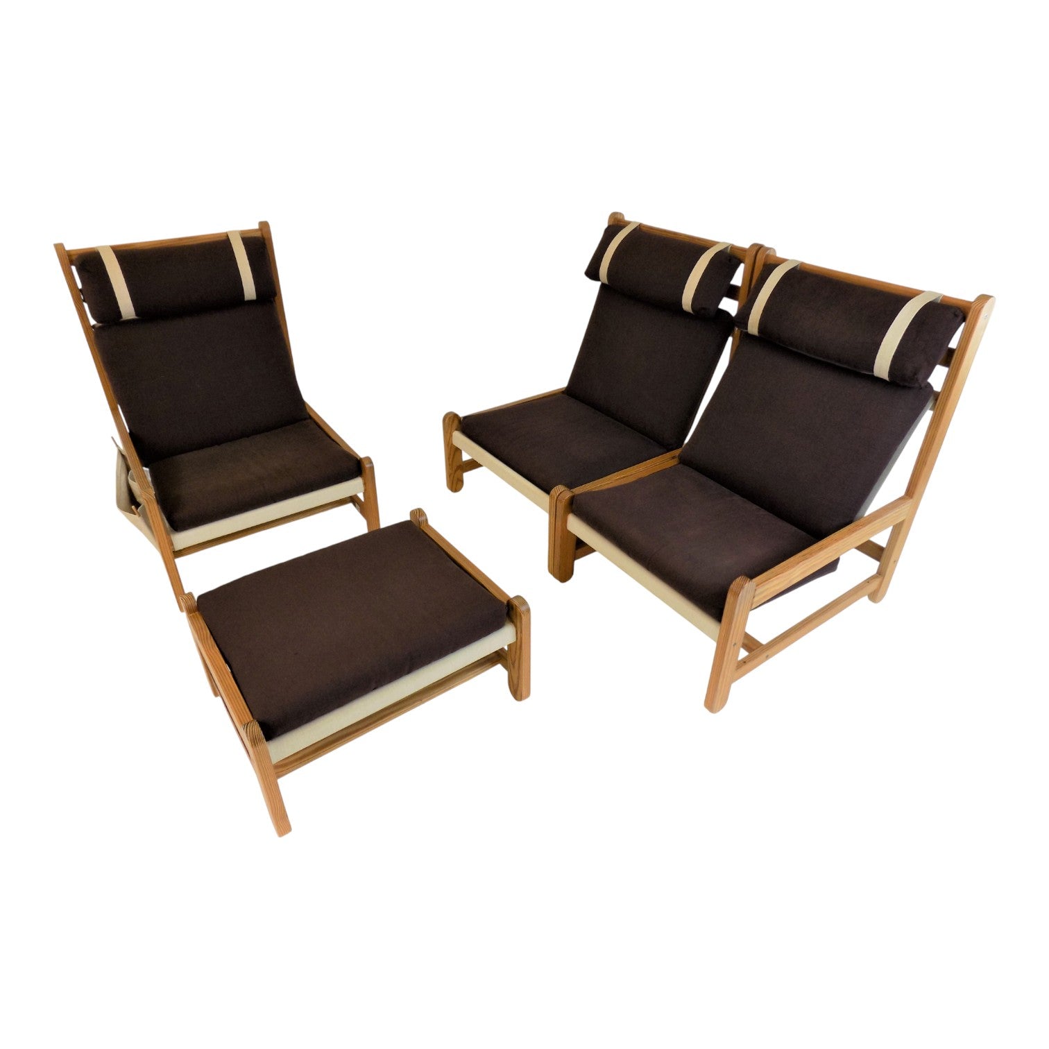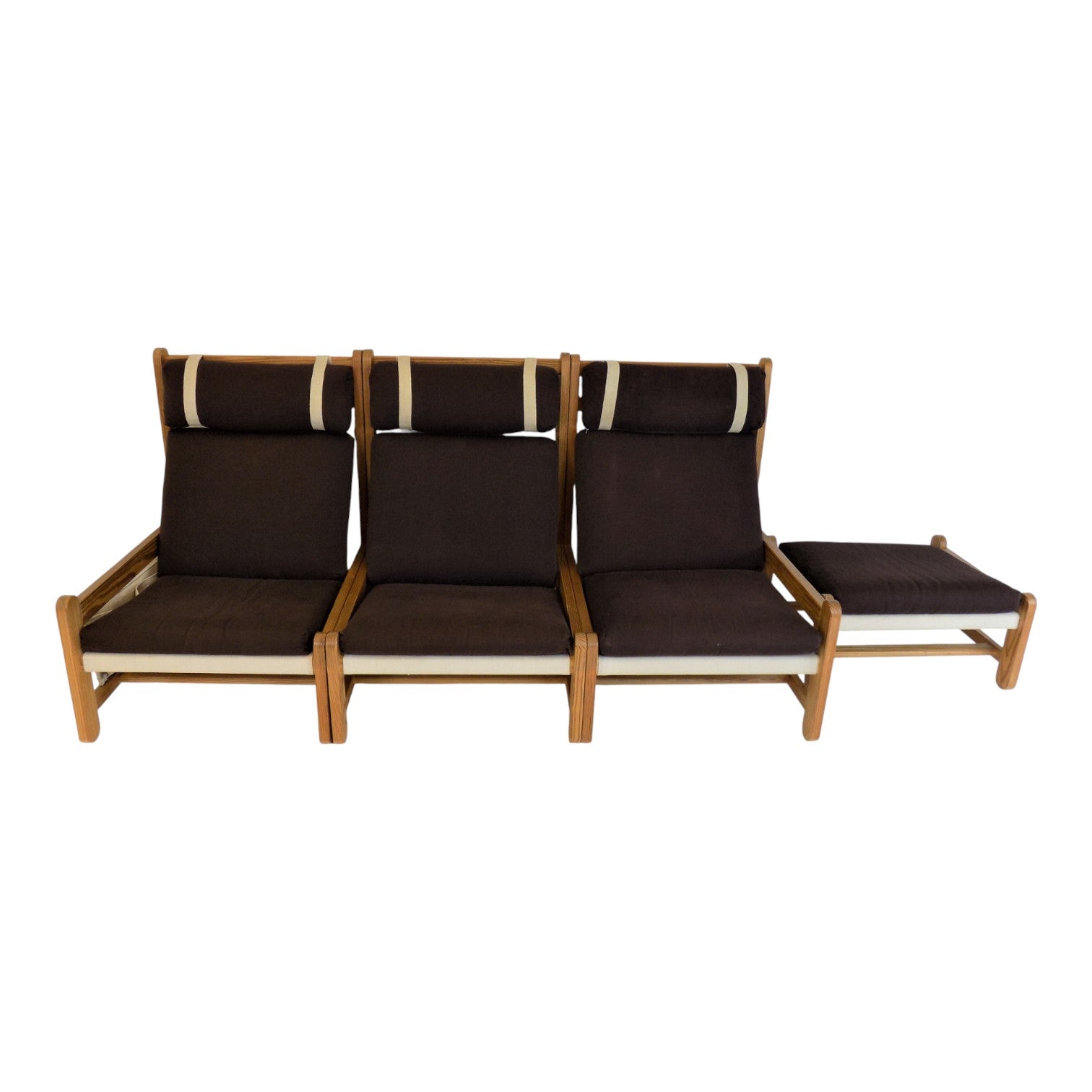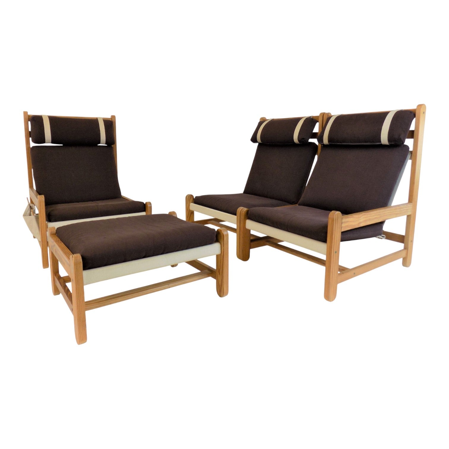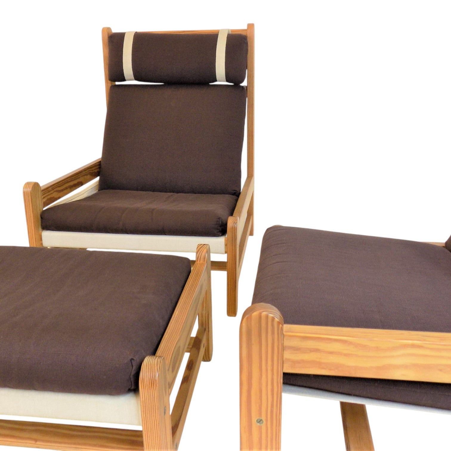 Dieses selten zu findende Modell befindet sich in einem sehr guten Zustand. Die Gestelle aus Kiefernholz zeigen kaum Gebrauchsspuren, auch die Polster aus braunem Stoff sind in einem einwandfreien Zustand. In die Holzgestell sind helle Canvas Bezüge mit dicken Lederriemen gespannt. Alle Kissenbezüge können leicht abgezogen und gewaschen werden. Zu dem 3er Set gehört ein Ottoman. Die Objekte können zusammen als 3er Sofa oder auch einzeln gestellt werden.