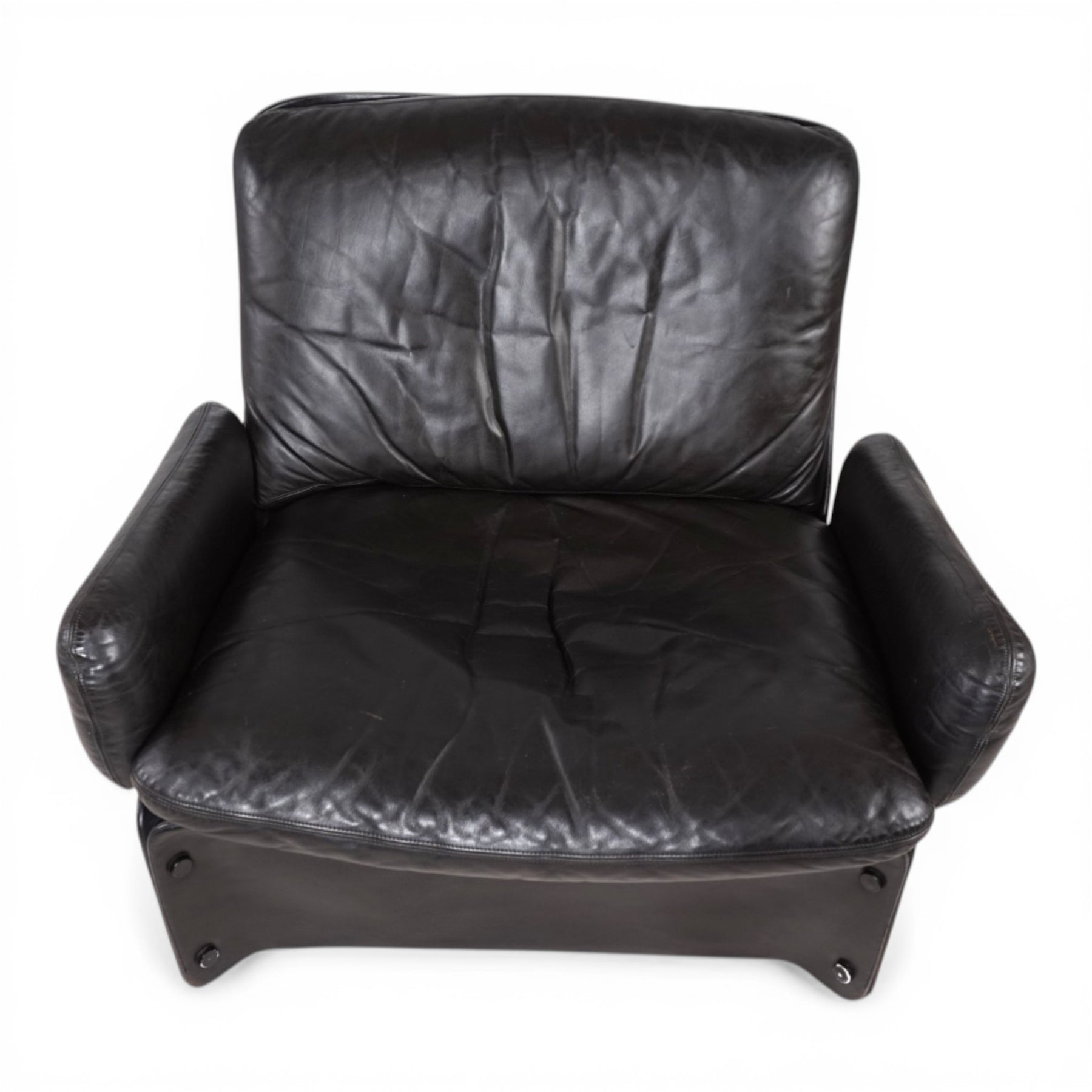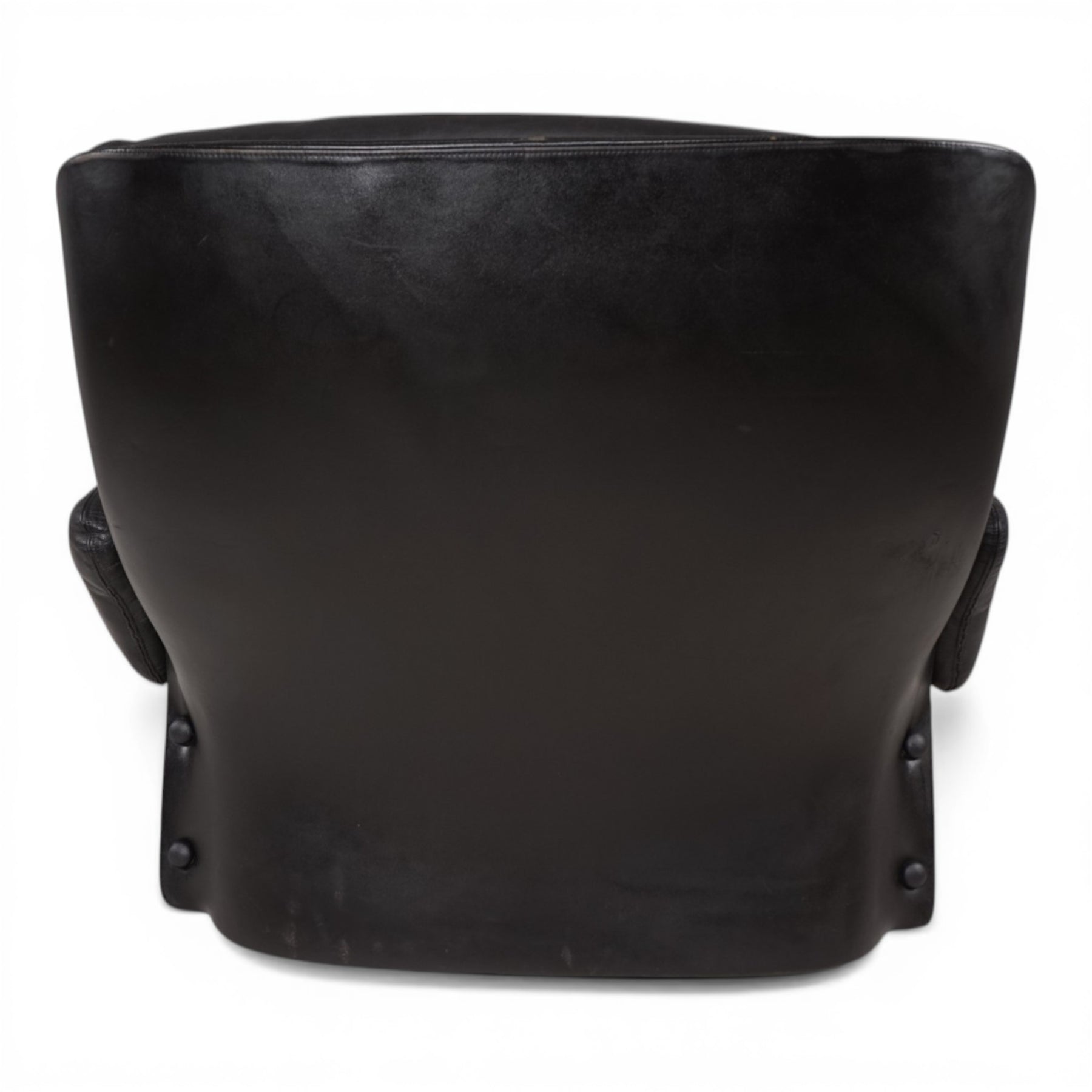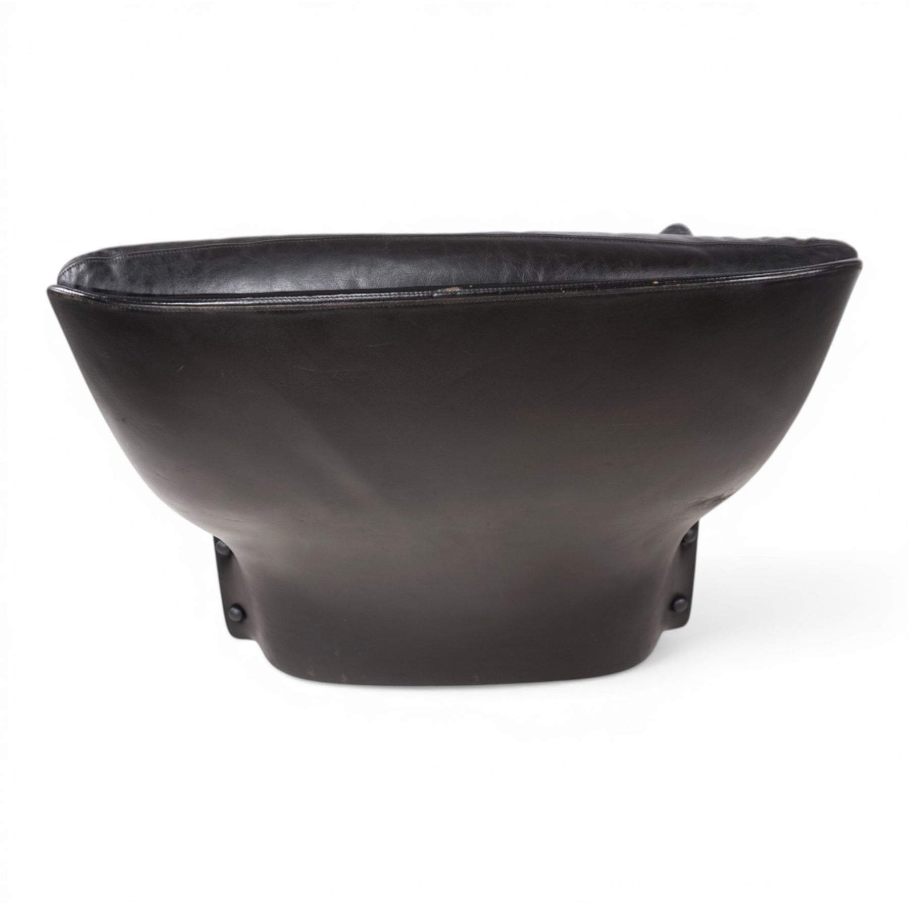 Die lederbezogenen GFK-Elemente weisen leichte, altersbedingte Gebrauchsspuren auf, die im Kontext des Gesamtbildes als Ausdruck seiner Geschichte zu verstehen sind. Auf der Rückseite befindet sich eine Stelle mit leichtem Abrieb. Insgesamt befindet sich der Sessel in einem sehr guten, gepflegten Zustand. Unter den außergewöhnlichen seitlichen Verkleidungen verbergen sich vier originale Rollen, die eine dezente Mobilität ermöglichen, ohne die klare Formensprache zu beeinträchtigen.