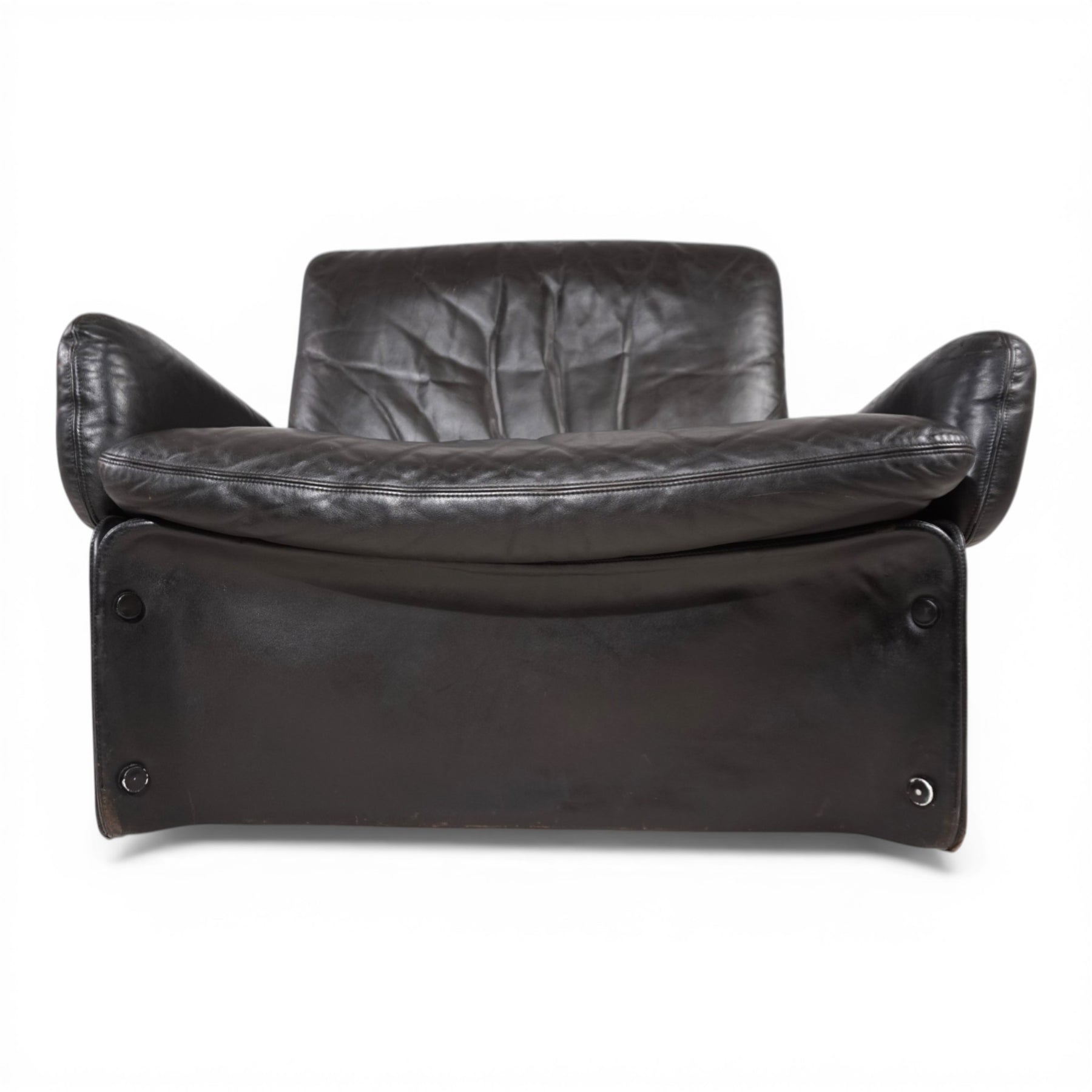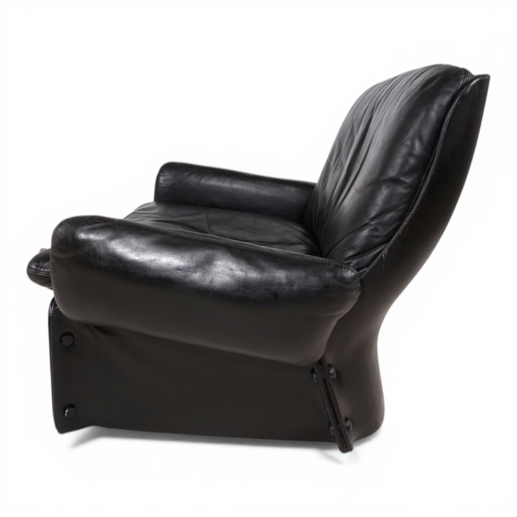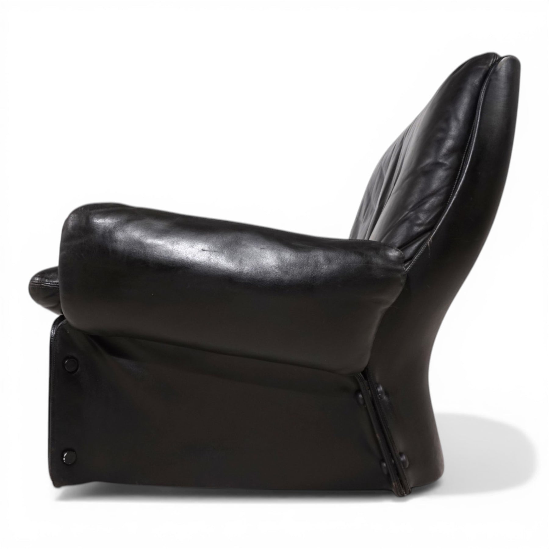 Die lederbezogenen GFK-Elemente weisen leichte, altersbedingte Gebrauchsspuren auf, die im Kontext des Gesamtbildes als Ausdruck seiner Geschichte zu verstehen sind. Auf der Rückseite befindet sich eine Stelle mit leichtem Abrieb. Insgesamt befindet sich der Sessel in einem sehr guten, gepflegten Zustand. Unter den außergewöhnlichen seitlichen Verkleidungen verbergen sich vier originale Rollen, die eine dezente Mobilität ermöglichen, ohne die klare Formensprache zu beeinträchtigen.