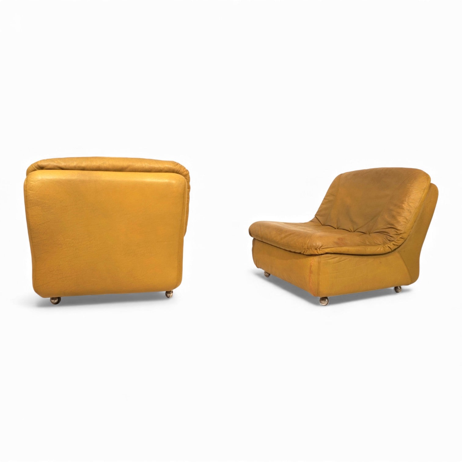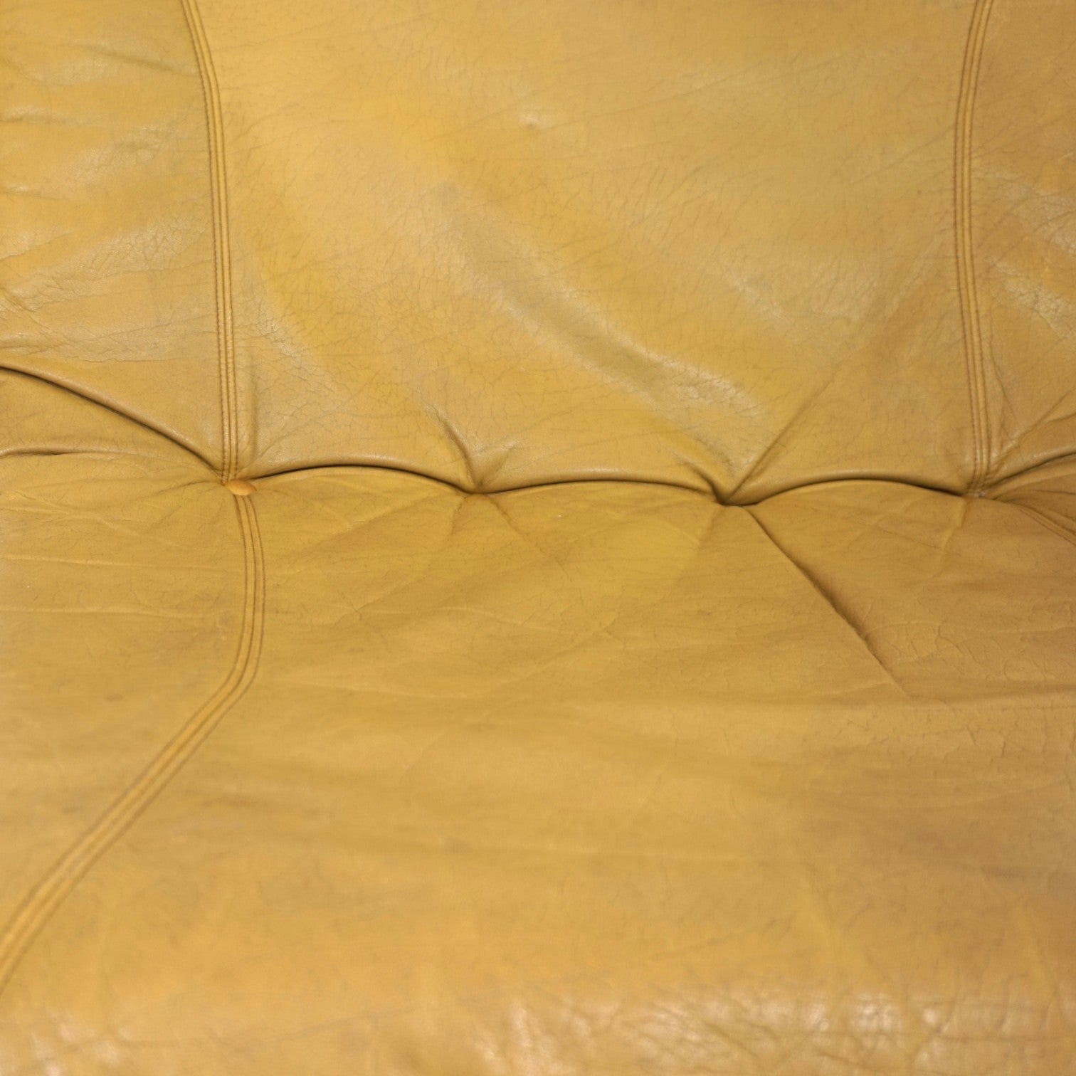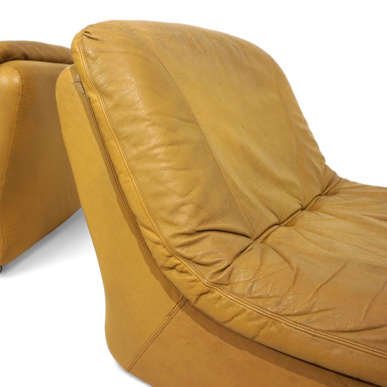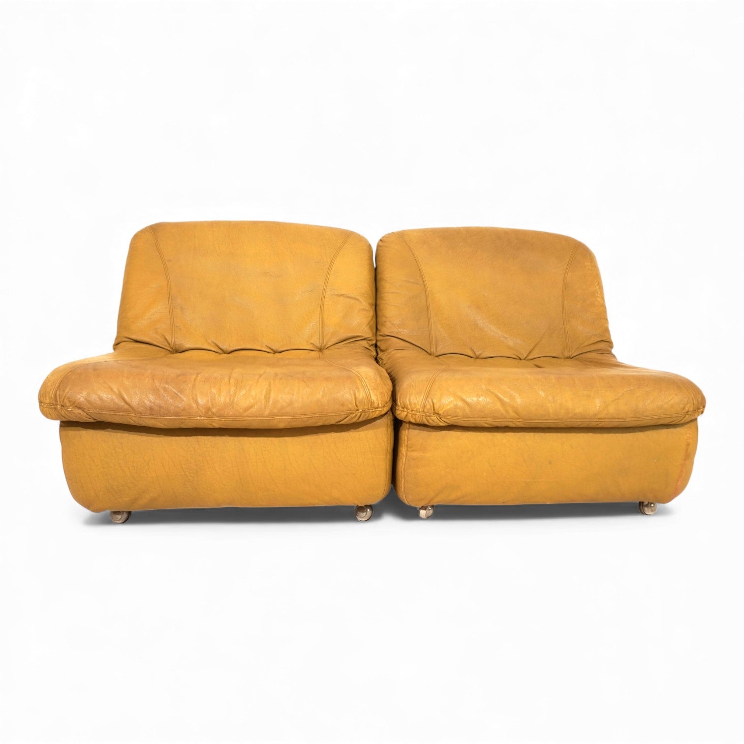 Das Set aus zwei Dreipunkt Modulsesseln, gefertigt in einem senffarbenen Lederton der 70er Jahre. Die Sessel befinden sich in einem guten Zustand mit leichten Gebrauchsspuren sowie deutlicher Patina, welche über die Jahre verdient wurde. Der Sitzkomfort ist einwandfrei. Die Module können als Einzelsessel oder miteinander verbunden zu einem Zweisitzer Sofa gestellt werden. Dafür vorgesehen ist ein Verbindungshaken, welcher die Sessel zusammenhält.