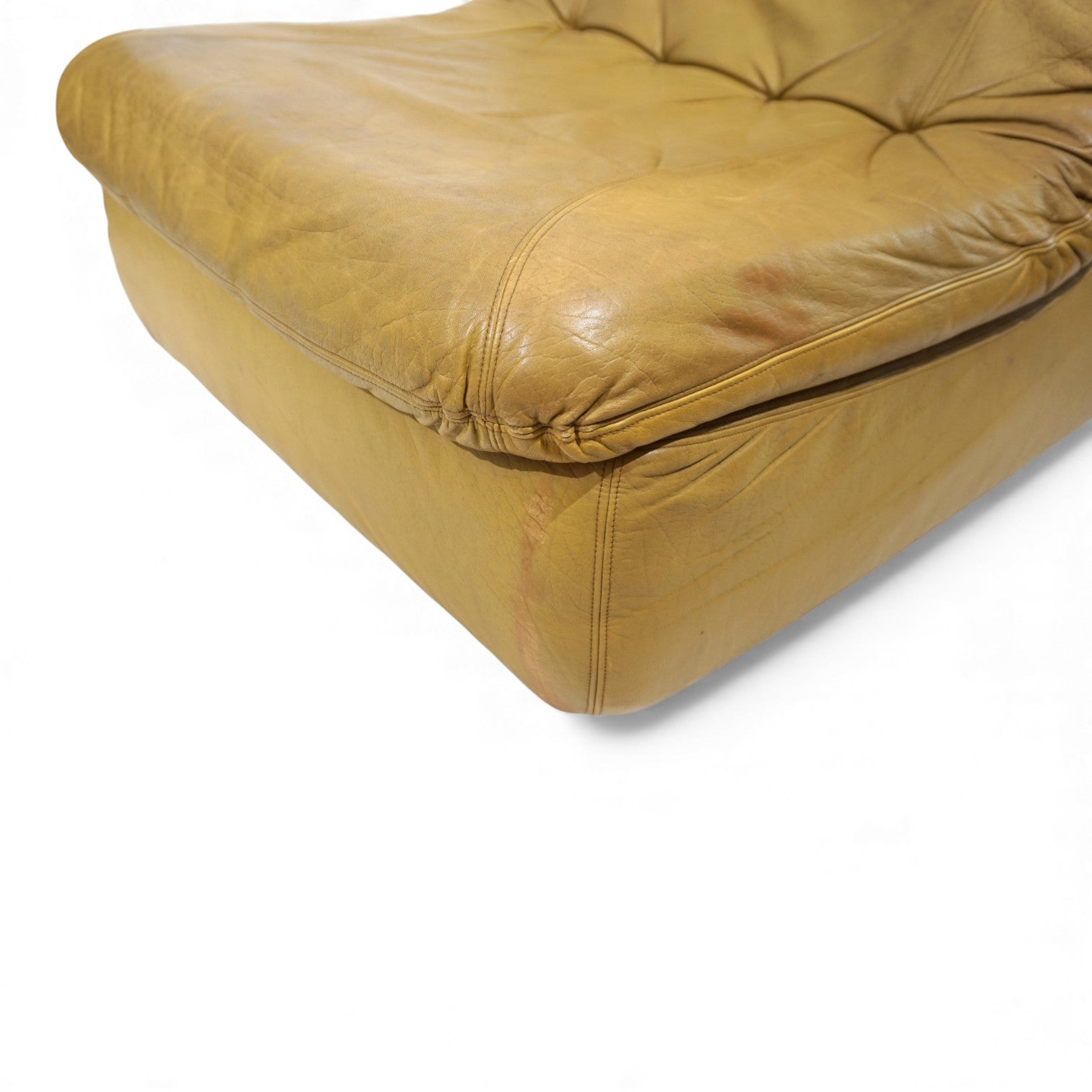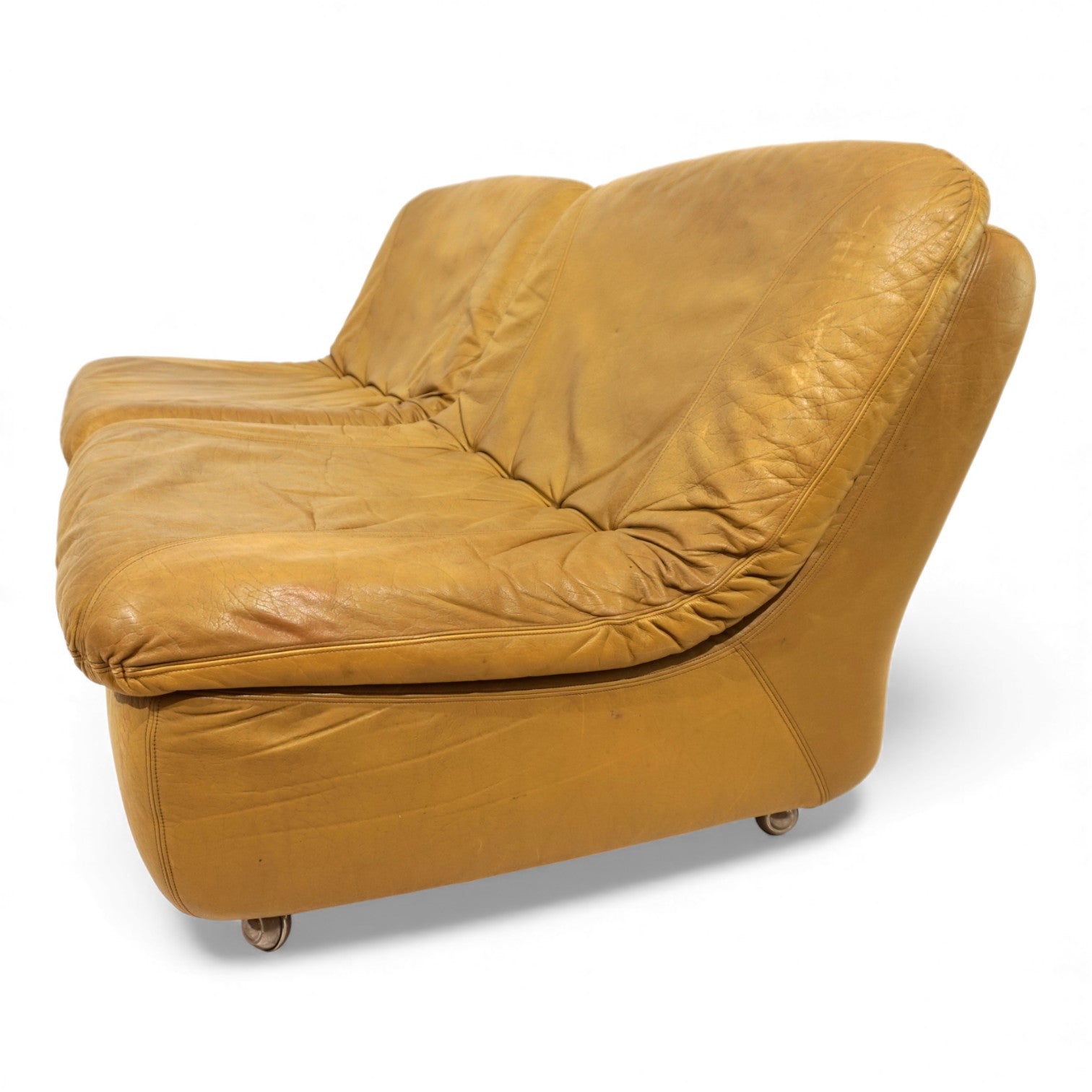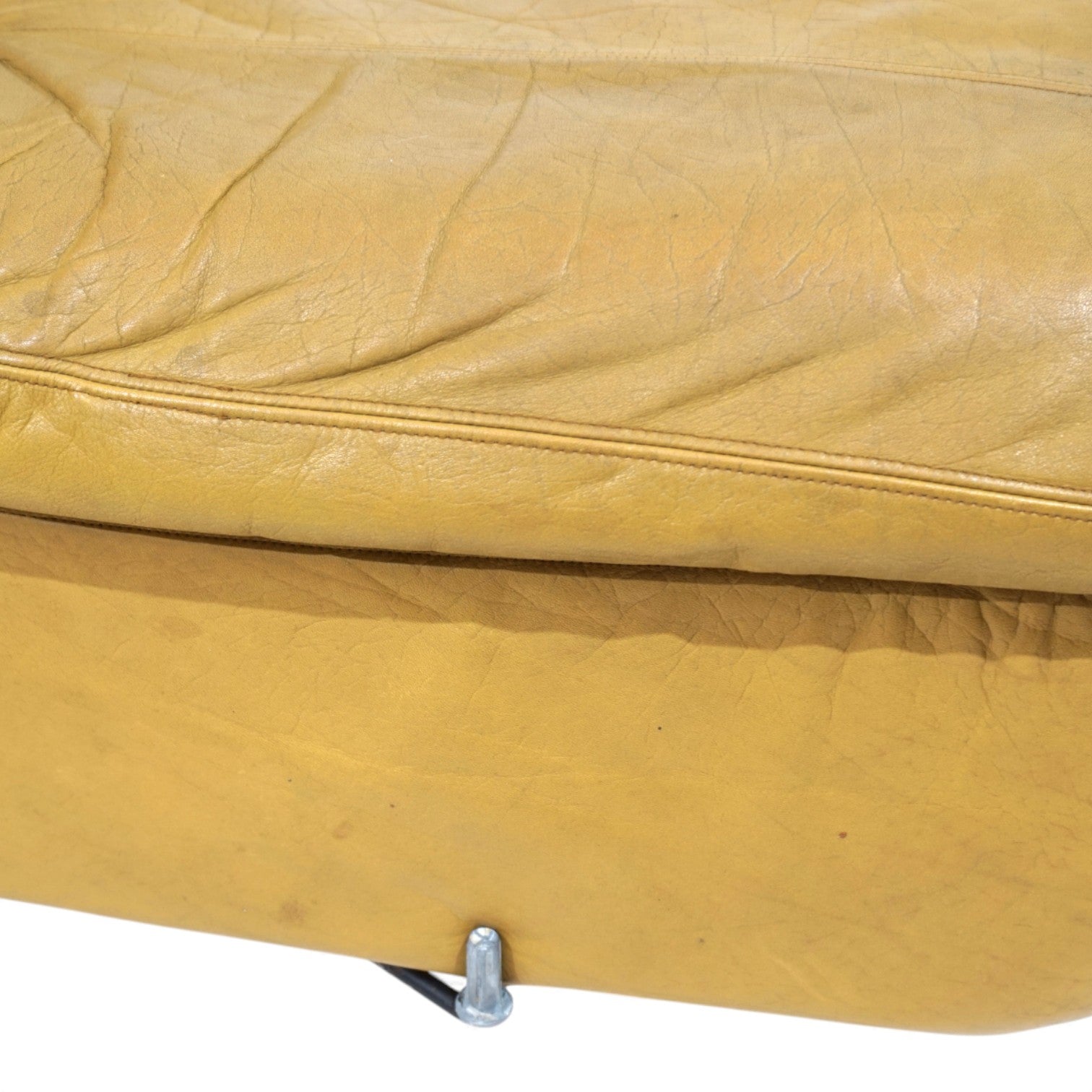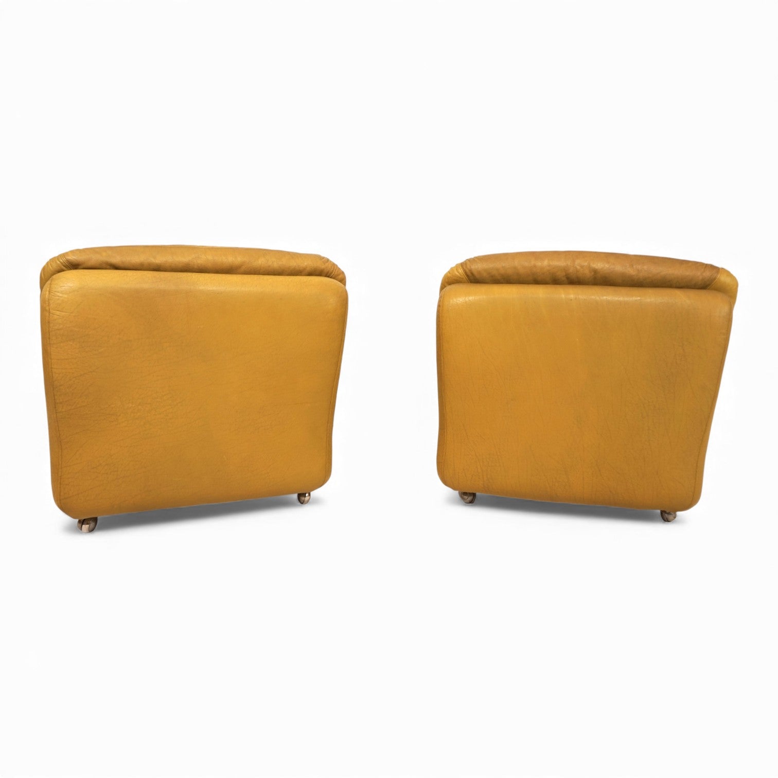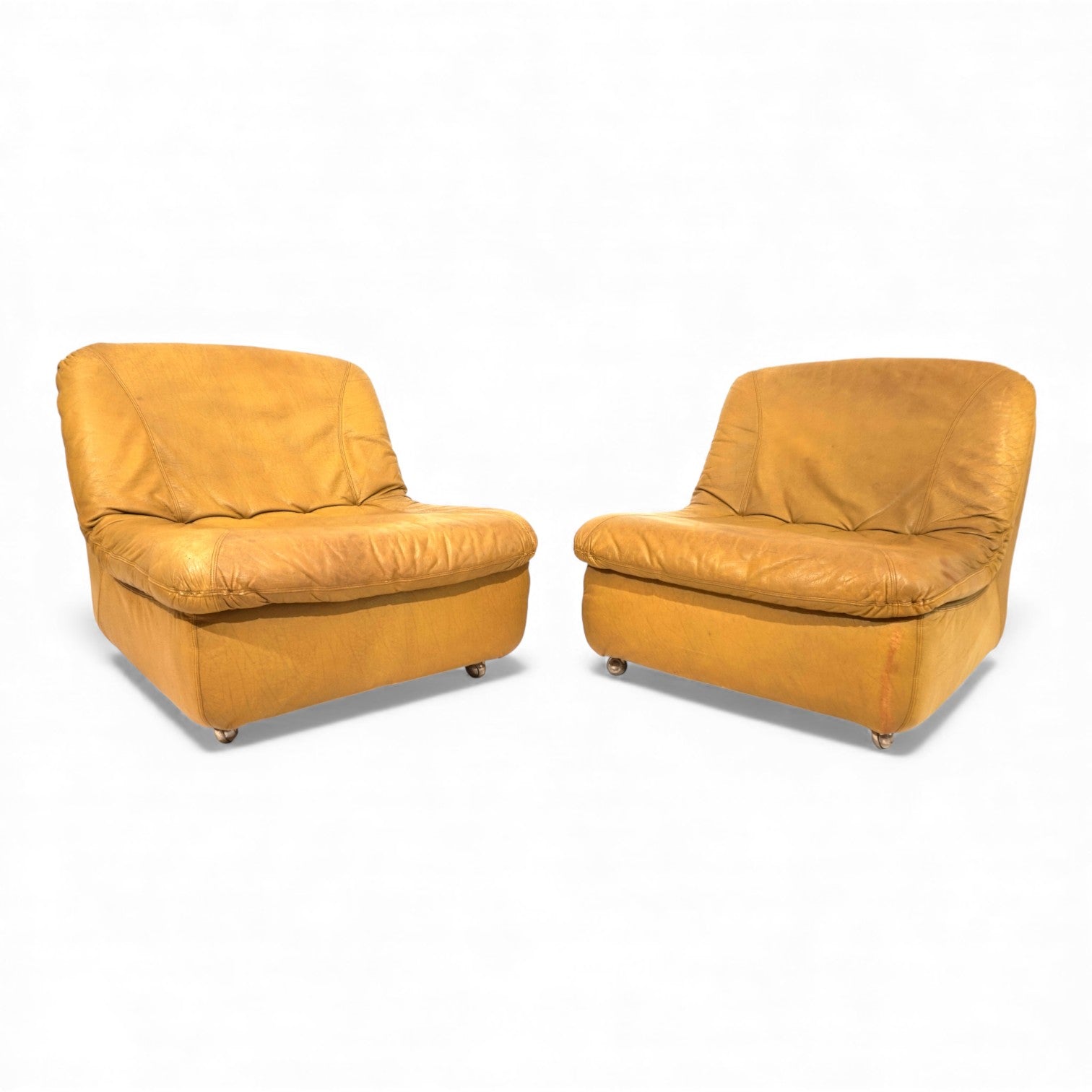 Das Set aus zwei Dreipunkt Modulsesseln, gefertigt in einem senffarbenen Lederton der 70er Jahre. Die Sessel befinden sich in einem guten Zustand mit leichten Gebrauchsspuren sowie deutlicher Patina, welche über die Jahre verdient wurde. Der Sitzkomfort ist einwandfrei. Die Module können als Einzelsessel oder miteinander verbunden zu einem Zweisitzer Sofa gestellt werden. Dafür vorgesehen ist ein Verbindungshaken, welcher die Sessel zusammenhält.
