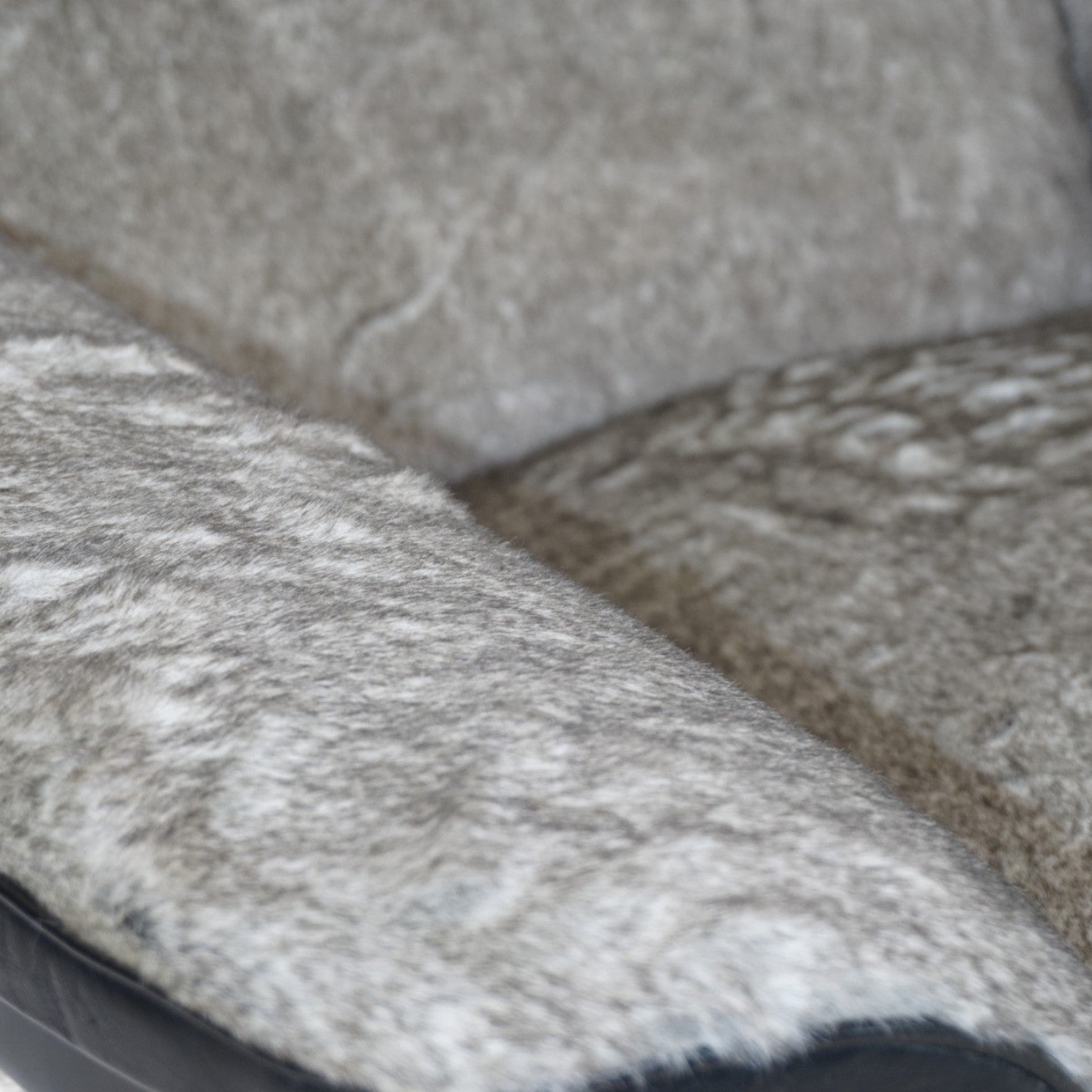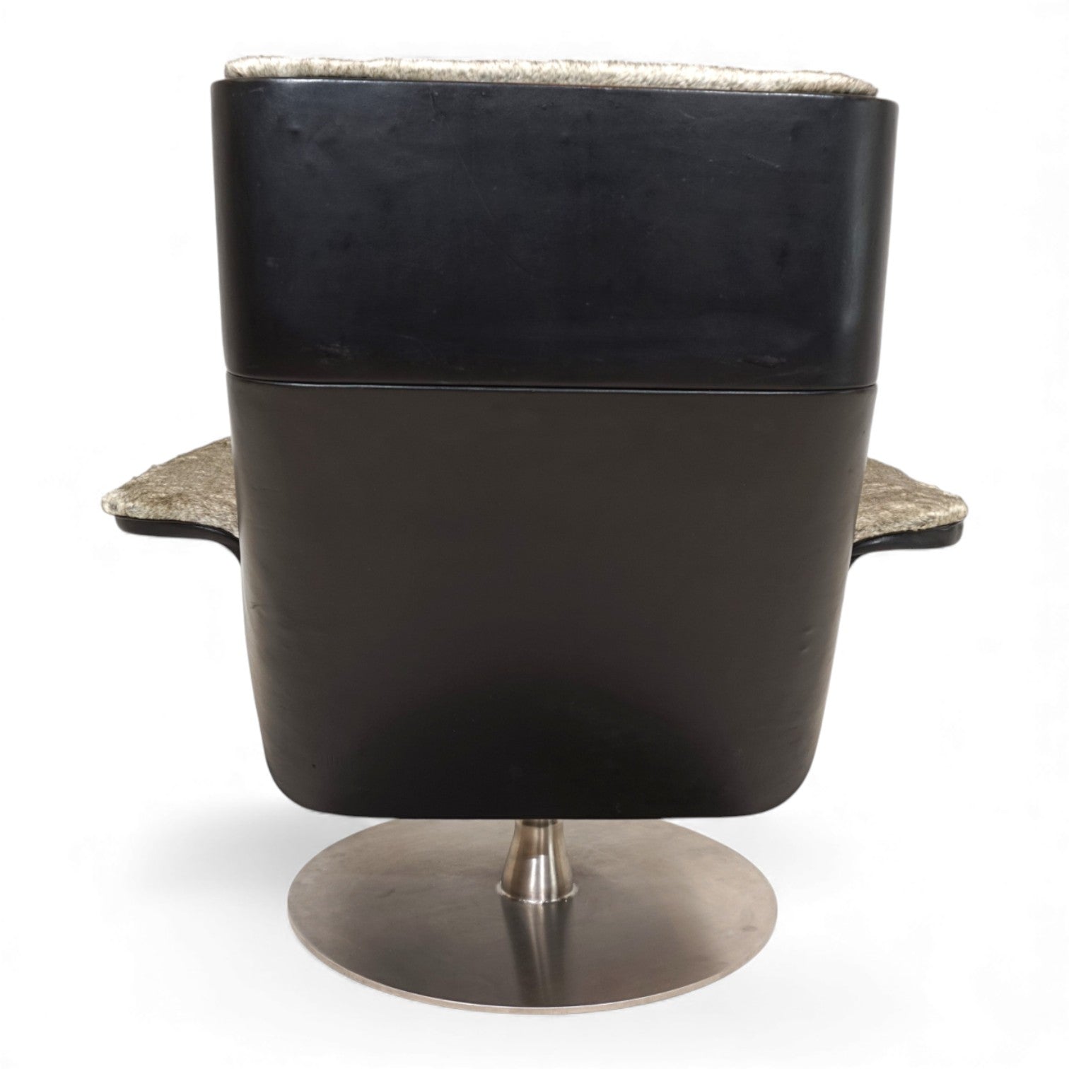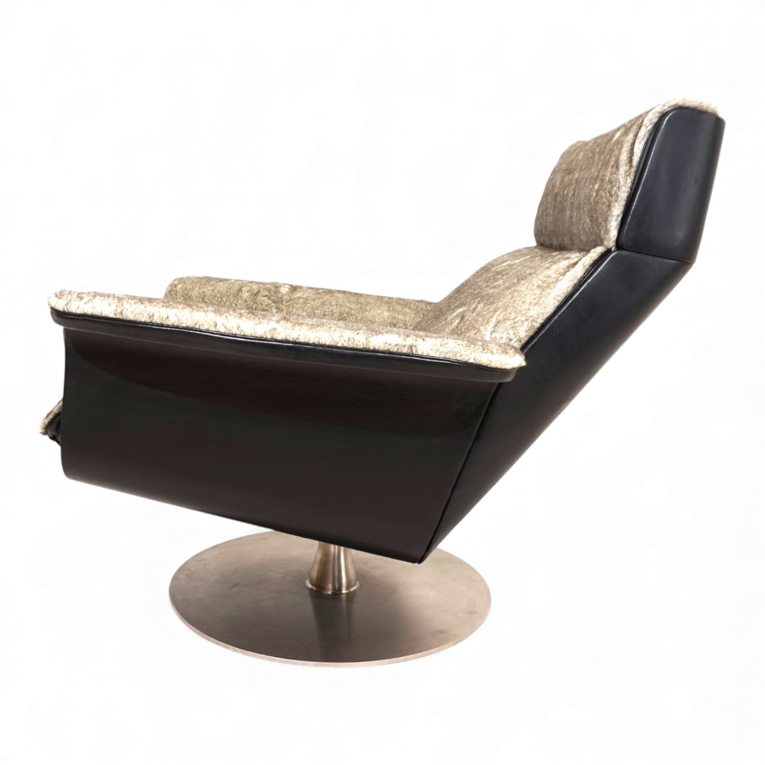 Dieser Siesta 62 kommt in einer extravaganten Ausführung von schwarzem Leder und einem hochwertigen, fellartigen Stoff auf den Kissen, Armlehnen und Ottoman. Der Sessel wurde vollständig überarbeitet und neu gepolstert. Der Stoff bietet ein sehr angenehmes Sitzgefühl von echtem Fellbezug. Der Sessel ist drehbar und steht auf einem massiven, schweren Drehteller. Ein abolutes Einzelstück in Top Zustand.