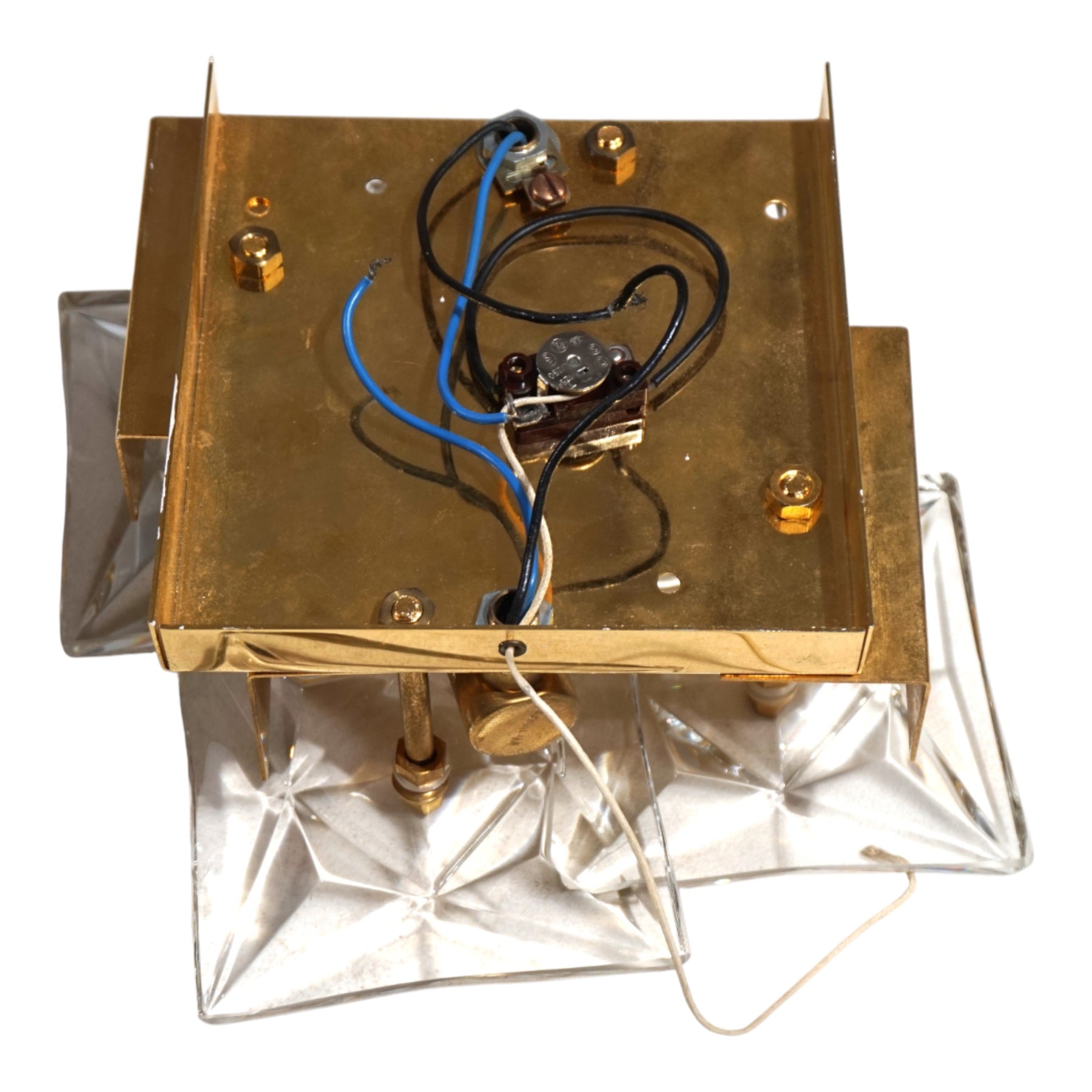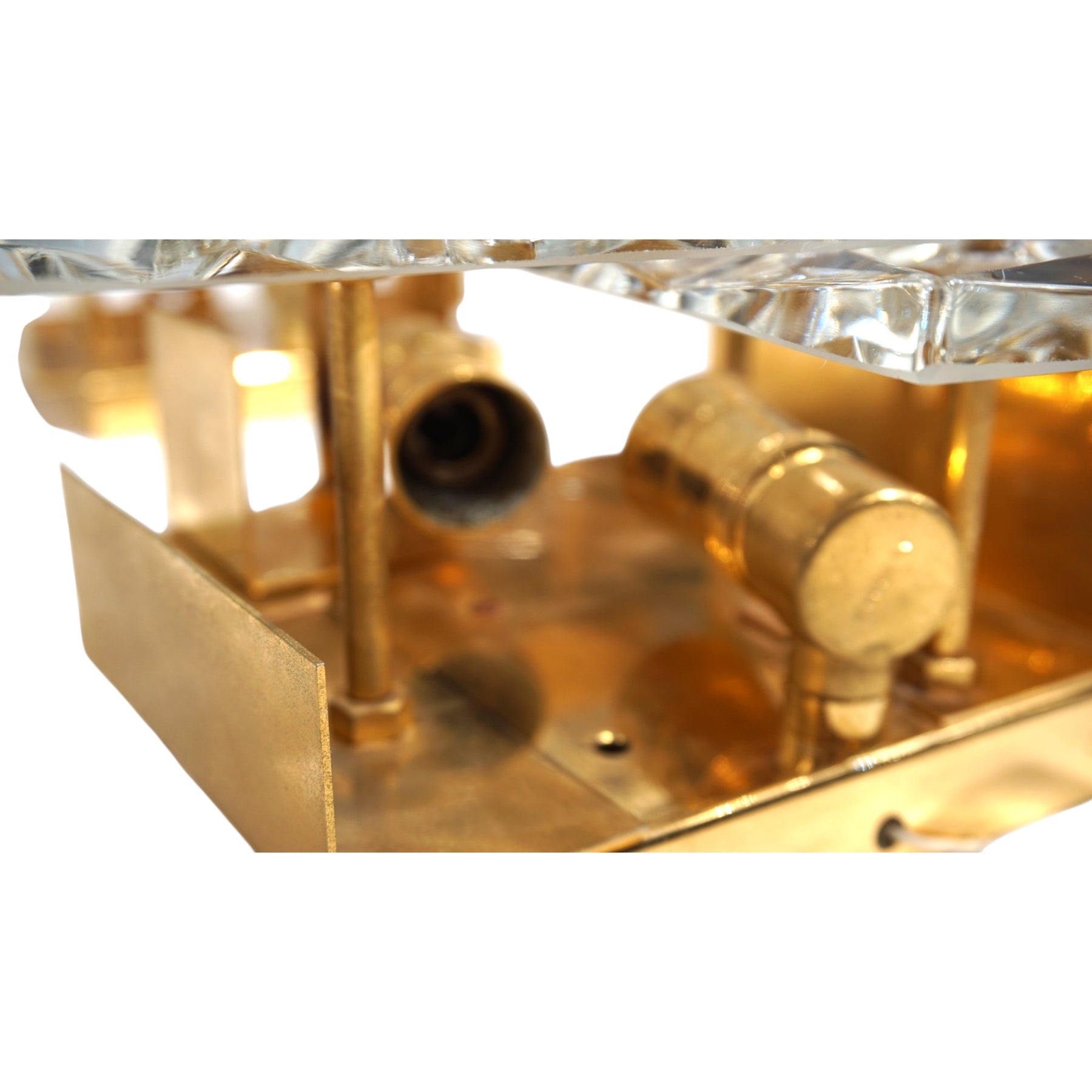 Dieses eindrucksvolle Paar Kinkeldey Leuchten kommt in einem sehr guten Erhaltungszustand. Die Lampen im Hollywood Regency Stil bestehen jeweils aus vier in Facetten geschliffenen Elementen aus Kristallglas, welche den Leuchten einen fantastischen Schein geben. Die Gläser sind auf Schraubelementen aufgesetzt und in verschiedenen Höhen platziert. Der vergoldete Rahmen schimmert äußerst attraktiv durch die Gläser und vermittelt einen exklusiven Auftritt. Minimalste Gebrauchsspuren an den Gläsern. Der goldene Metallrahmen der Leuchten befindet sich in einem einwandfreien Zustand mit leichter Patina. Jede Leuchte verfügt über 2 Brennstellen. Die Lampen können entweder per Seilzug geschaltet oder direkt fest angeschlossen werden.