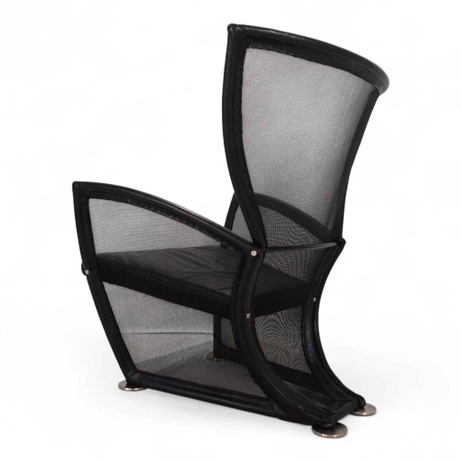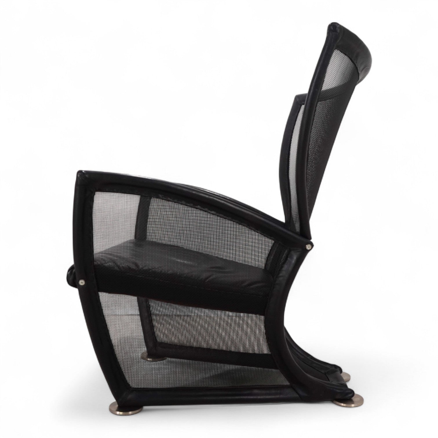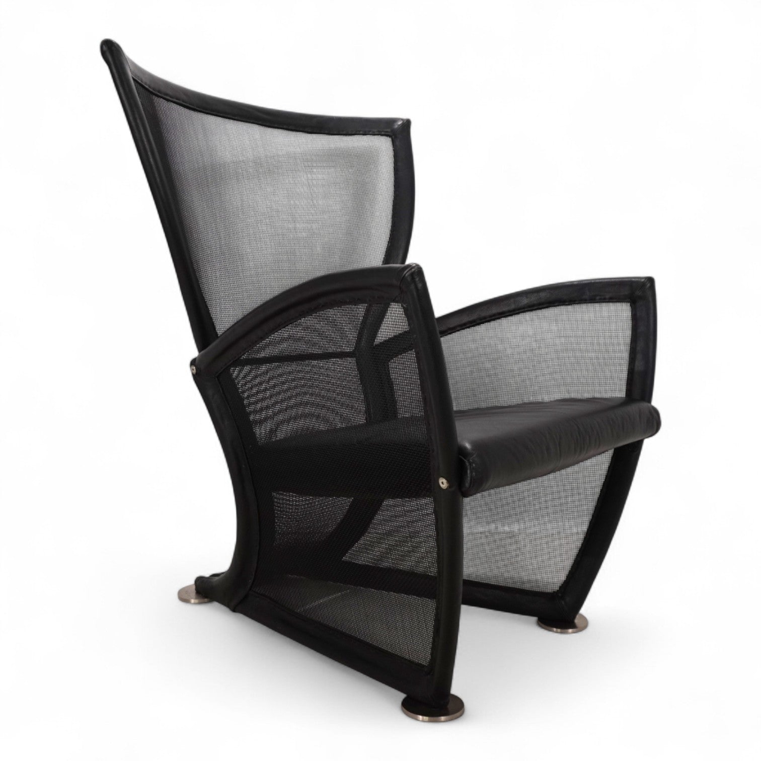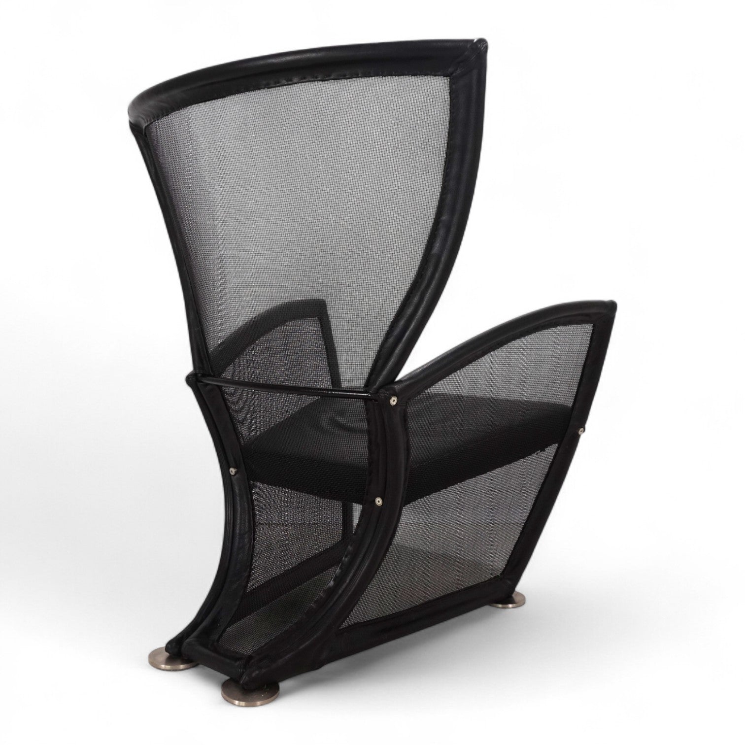 A Prive armchair with black metal weave and black leather trim in excellent condition. The armchair shows only minimal signs of wear. The black plastic-coated metal weave is firm, and the black leather seat and leather trim are flawless. The impressive dimensions and dynamic lines of this armchair make it a work of art in any room. The armchair exudes postmodernism in every inch.