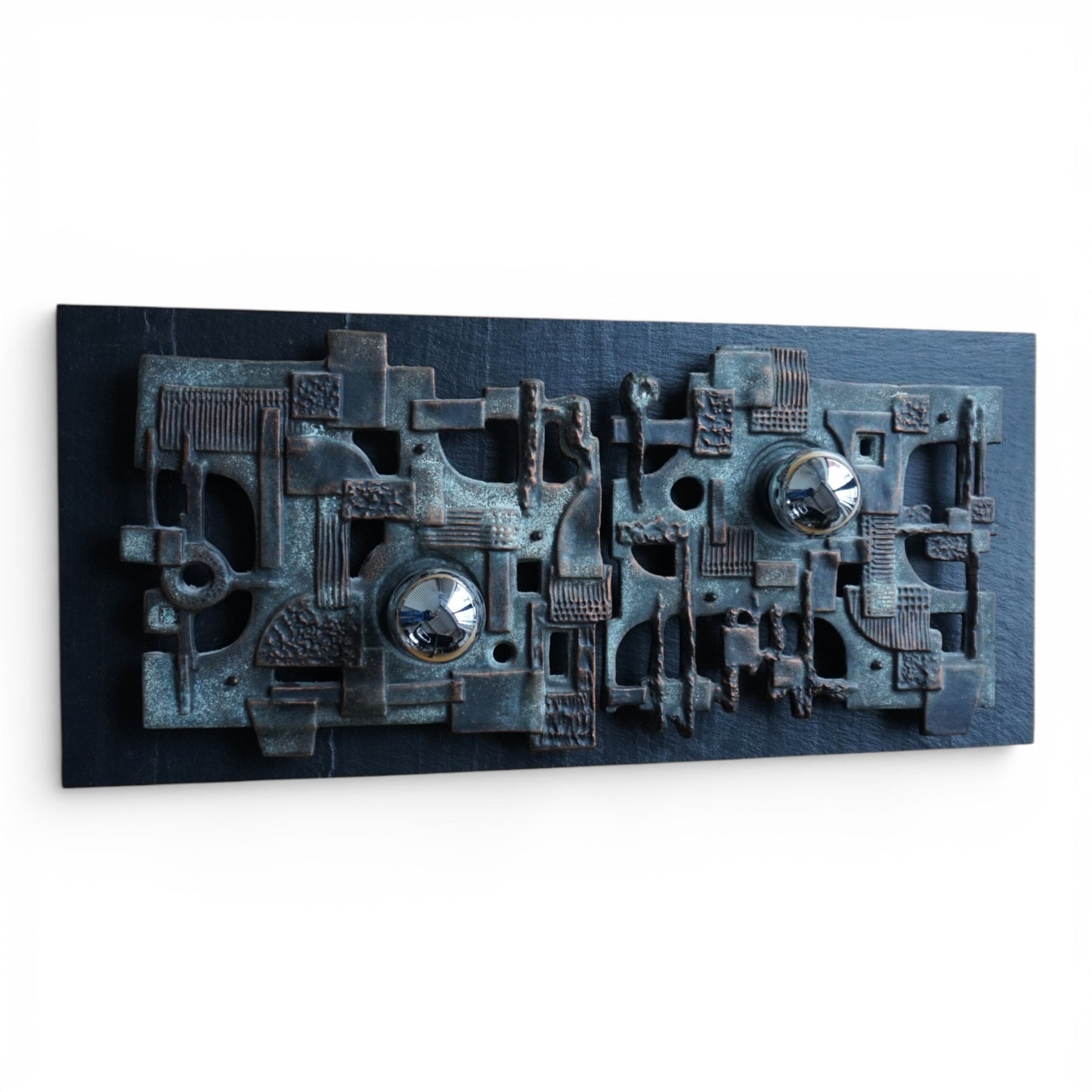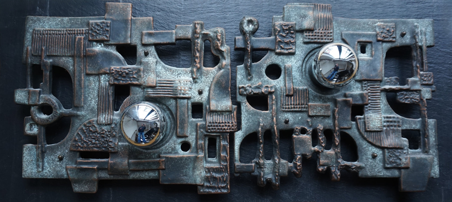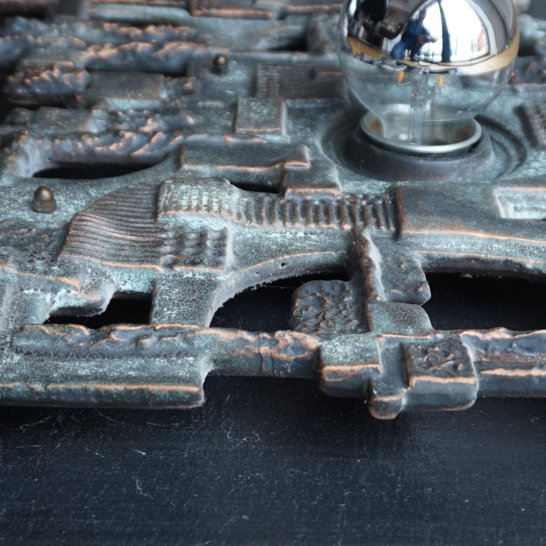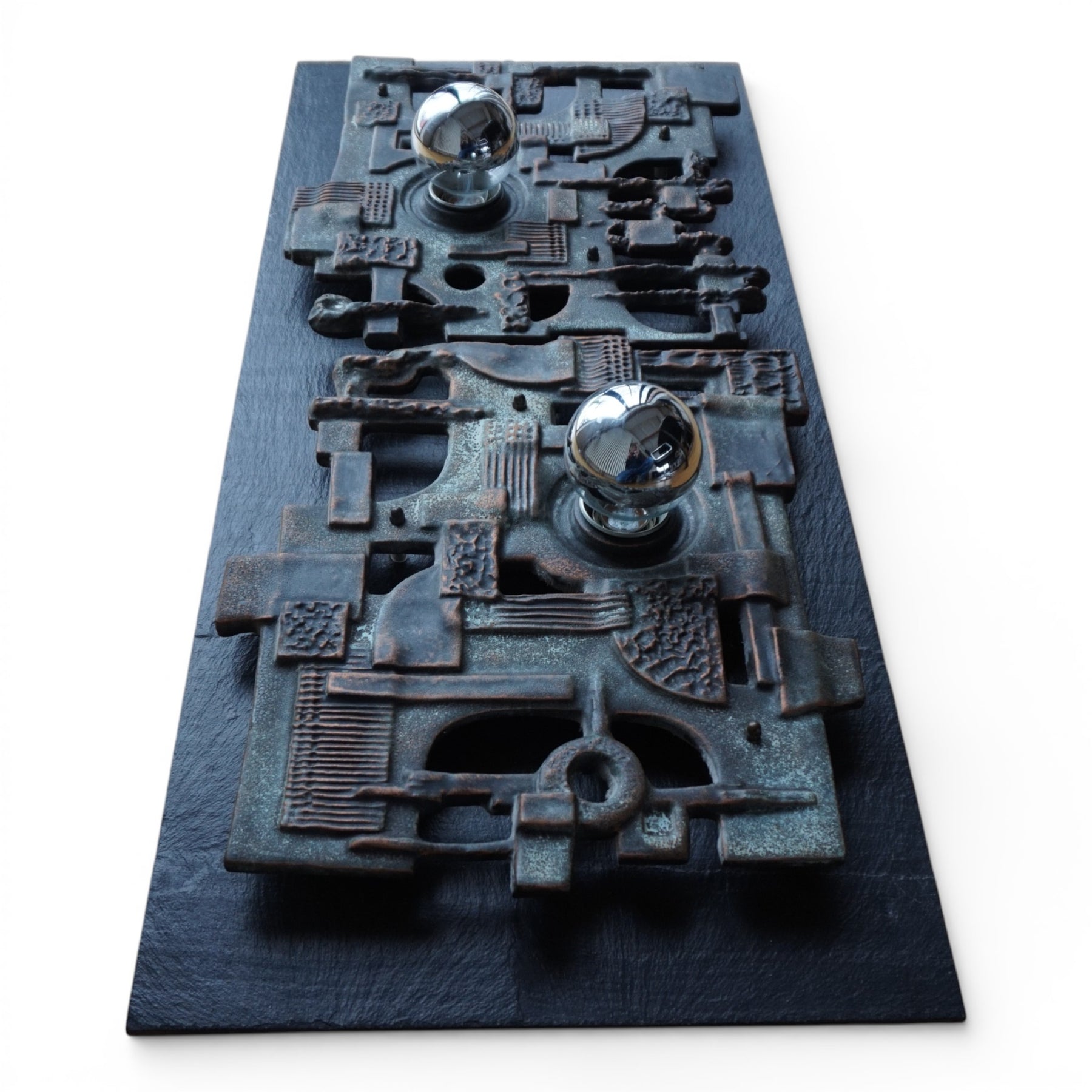Diese außergewöhnlche Wandlampe ist ein typische Vertreter der brutalistischen Stilrichtung welche Brakelmann&Becker in mehreren Variationen gehuldigt hatte.  Die Lampe kommt in einem excellenten, unbeschädigten Zustand. Die zwei großen Keramikreliefs, in einem grün/braunen Farbspiel, sind auf einer schwarzen Schieferplatte montiert und zeigen im beleuchteten Zustand eine fantastisches Lichtspiel. Diese Lampe ist ein absolutes Statement, mehr Skulptur als Lichtelement. Sie kann horizontal als auch vertikal montiert werden.